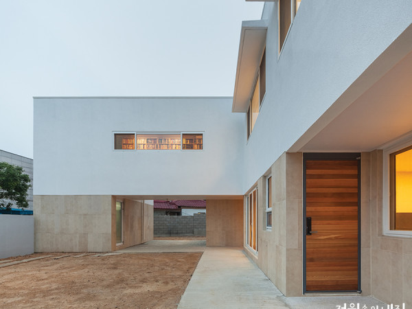 “함께 모여 사는 집이지만 서로 다른 가족구성과 요구들을 최대한 만족시키고자 각각의 공간을 만들었습니다. 다만, 집과 땅을 사용하는 측면에서는 집을 지으면서 만들어지는 다양한 내·외부 공간들을 두 집에 가급적 균형 있게 나누어 주려고 노력했습니다.”취재 김연정 사진 황효철시원시원한 성격의 자매가 고향 근처에 땅을 사서 함께 살 집을 짓고자 한다며 건축가를 찾았다. 두 사람의 요구사항은 매우 명쾌했다. 특히나 형태를 위한 아이디어는 그들의 분명하면서도 심플한 요구로부터 시작되었다. “우선 집의 외관이 어떠면 좋을까를 곰곰이 생각해봤어요. 네모와 세모 지붕을 기본으로 하면서도 모던한 느낌, 군더더기 없이 깔끔했으면 하고요. 너무 평범하지 않고 개성이 있었으면 합니다.”이것이 첫 미팅 전, 건축주가 메일에 써서 보낸 요구사항이다. 이외에 진행하면서 추가로 부탁한 요청은 ‘집은 밝은 톤에 햇빛을 잘 받을 수 있는 외부공간이 있었으면 좋겠고, 가급적 목조로 짓고 싶다는 것’. 우선 요구조건을 충족하면서도 건축면적을 모두 채울 수 있는 외형의 부피를 만들었다. 그러고 나서 필요한 만큼의 면적만 남기기 위해 전체 부피에서 공간을 덜어내는 식으로 형태를 고쳐 나갔다. 그 과정에서 땅이 남서향임을 고려해 두 집이 모두 균질하게 햇빛을 받을 수 있도록 하였고, 각 공간을 배치하면서는 두 건축주의 성향도 함께 고민했다. 이렇게 해서 전체적으로 세모와 네모의 심플한 외형을 갖춘, 그리고 그 안에는 두 개의 서로 다른 공간구성을 가진 집이 완성되었다. 두 가정이지만 하나의 집으로 인식되길 원했기 때문에 전체 형태는 단순하게 정리했다. 외장재는 흰색에 가까운 벽돌을 사용하여 건물이 밝아 보이게 했고, 공간 쌓기를 통해 중정을 비롯한 테라스 공간을 외부시선으로부터 보호하고자 하였다. 이 집은 목구조로는 흔치 않은 4개 층 높이이고, 특히나 한 집은 철골구조와 혼합된 방식이다. 이를 위해 국내에서 흔치 않은 목구조 계산을 받아야 했고, 수축팽창계수가 다른 철골과 목조의 접합부분에 대한 디테일도 고민해야 했다. SECTION언니 집 - 자녀의 독립으로 부부만 생활하게 될 집으로, 그동안 살던 아파트에서는 누리지 못했던 개방감 있는 공간을 만들고자 했다. 전체적으로 건물의 형태를 이용한 공간이 구성되었고, 다만 법적 주차대수를 확보하기 위해 지상층을 필로티로 띄워 주차장을 배치해야 했다.따라서 1층을 철골로 구조를 만들고 그 위로 세 개 층 높이의 목조주택을 올렸다(덕분에 4층 규모의 목조주택을 완성했다). 집은 주차장을 통해 2층 현관으로 들어가는 구조다. 이곳이 주차장처럼 보이지 않고 좀 더 아늑한 외부공간이 될 수 있도록 주차장을 감쌀 폴딩도어를 달아 사계절 다양한 날씨에 효과적으로 사용할 수 있게 했다. 건물형태를 활용하니 내부에 재미있는 공간들이 생겼고 다락에서 연결되는 은밀한 테라스도 갖추게 되었다. 이곳은 지붕이 있어 비가 와도 문제가 없고 좋은 전망까지 담아낸다. 건축주가 깔끔하고 단정한 분위기를 원했기 때문에, 실내는 나무 톤과 흰색으로 공간의 색감을 정하였고 대신에 바닥 등을 수제타일로 마감하여 패턴으로 변화를 주었다.House Plan대지위치 : 경기도 화성시 대지면적 : 284.90㎡(86.18평)건물규모 : 지상 3층건축면적 : 115.76㎡(35.01평)연면적 : 246.04㎡(74.42평)건폐율 : 40.63%용적률 : 68.92%주차대수 : 3대최고높이 : 12.3m공법 : 기초 - 철근콘크리트 매트기초, 지상 - H-Bim 철골구조 + 경량목구조구조재 : 벽 - 외벽 2×6 S.P.F구조목 + 2×2 S.P.F구조목 외단열, 내벽 2×6 or 2×4 S.P.F 구조목 / 지붕 - 2×12 S.P.F구조목 + 2×2 S.P.F구조목(이중 단열) + OSB합판 + 투습방수지 + 2×2 S.P.F구조목(통기층) + OSB합판 + 방수시트지붕마감재 : 컬러강판단열재 : 벽 - R21 그라스울 + 50㎜ 암면 미네랄울, 지붕 - R30 그라스울 + 50㎜ 암면 미네랄울외벽마감재 : 보랄브릭스 포르투갈벽돌(흰색), 스터코(흰색)창호재 : KCC PVC시스템창호(에너지등급 2등급)설계 : JYA-RCHITECTS 070-8658-9912 http://jyarchitects.com시공 : Deif House ▲ 폴딩도어를 단 주차장을 통해 2층 현관으로 들어가는 구조의 언니 집▲ 깔끔함이 느껴지는 거실은 집주인의 취향을 한껏 드러낸다.▲ 나무 톤으로 단정하게 꾸민 3층 공간▲ 언니 집과 마찬가지로 거실은 편안하게 휴식을 취할 수 있도록 심플하게 정돈했다.▲ 벽을 나무 바닥과 어울리는 컬러의 타일로 마감해 따뜻한 공간으로 연출된 주방◀ 테라스를 통해 언제나 화창한 햇살이 내부 가득 들어온다. ▶ 집 전체를 이어주는 철재 프레임의 노출형 계단이 공간에 힘을 더한다.▲ 각 층에 배치된 테라스는 가족만의 오붓한 야외공간이 되어준다.동생 집 - 각 층이 테라스를 갖는 형태이다. 남쪽으로 외부공간을 면하고 있으며 테라스를 통해 외부와 바로 접할 수 있다. 또한 외부공간은 건물 외벽에 의해 4개 층 높이로 감싸져 웅장하면서도 따뜻함이 머무른다. 효율적인 공간을 얻기 위해 고민한 평면은 재미보다는 안정적인 것에 주안점을 두었다. 이는 두 아들을 포함해 네 식구 각각을 위한 공간이 필요했기 때문이다. 따라서 각 층은 단