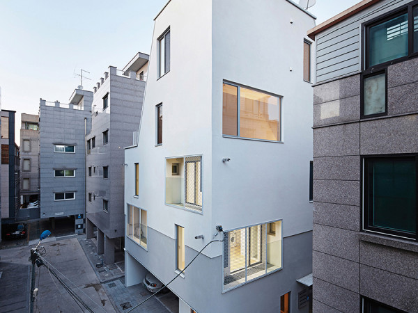 주사위 형태의 건물 위에 고깔 하나가 자연스럽게 얹혀졌다. 서울 연남동 작은 골목가에 위치한 ‘고깔집’은 이웃과 세대 간 시야를 적절히 열고 닫으며 하나의 형태미를 이루고 있다.구성 이세정 사진 이남선▲ 투톤의 스터코플렉스로 마감한 외관 ▲ 고깔 모양의 복층 세대는 옥상을 활용한 테라스 공간을 갖는다.House Plan대지위치 : 서울시 마포구 동교로대지면적 : 165㎡(50평)건물규모 : 지상 5층건축면적 : 93.8㎡(28.42평)연면적 : 283.9㎡(86.03평)건폐율 : 57.3%(법정 60%)용적률 : 173.4%(법정 200%)주차대수 : 4대최고높이 : 15.1m공법 : 기초 - 철근콘크리트 매트기초, 지상 - 철근콘크리트 벽식구조구조재 : 철근콘크리트지붕재 : 컬러골강판단열재 : 비드법보온판2종 120㎜(외벽), 압출법보온판 180㎜(평지붕), PF보드 80㎜(경사지붕)외벽마감재 : 스터코플렉스 뿜칠창호재 : 필로브 알루미늄 창호(로이삼중)설계 : ㈜아파랏.체시공 : ㈜이인시각건축비 : 3.3㎡(1평)당 550만원건축주가 사전에 땅을 매입하고 건물의 설계를 의뢰하기 위해 건축사무소를 찾는 일반적인 경우와 달리 연남동 고깔집은 대지 선정 단계에서부터 건축사무소가 동참했다. 동네 카페와 미니 음식점, 1인 공방과 디자인용품 가게 등 문화적 상업시설이 자리 잡은, 그러면서도 외부인들로 너무 시끌벅적하지 않은 동네를 물색하고 있던 건축주는 이런 방식을 통해 원하는 땅을 좀 더 체계적으로 찾아 나섰다. 수익성 부동산을 위해 땅을 찾는 대부분의 사람들은 대중 매체를 통해 소위 ‘뜨는 동네’를 검색한 후, 그 동네 부동산에 가서 땅의 가격, 접근로 및 주차 상황이나 주거 환경 등의 기본적인 부동산 정보를 묻고 결정한다. 그러나 좀 더 신중해진다면 대상지가 위치한 동네가 기존 상권의 대안동네로서 제대로 된 역할을 할 수 있을지, 각종 행정적 규제가 존재하지는 않는지, 또는 공적 자본의 금융지원 프로그램이 존재하는지 등의 내용들도 검토해 보아야 하며 이때 건축사무소는 좋은 상담 파트너가 될 수 있다. 이런 여러 가지 요소들과 건축주의 자금 상황을 고려해 연남동의 한 부지로 대상지가 결정되었다. 대지는 한 면은 4m 폭의 도로에 접해 있고 나머지 삼면은 이웃 건물들과 접해 있다. 남쪽으로 도로가 위치해 있어 한 면은 이웃 건물과 6m의 인동간격을 유지할 수 있으나, 나머지 주변은 5층 높이의 건물로 둘러싸여 있어 대상지 역시 다른 다세대·다가구주택지와 마찬가지로 부족한 채광과 환기, 사생활 침해 등의 문제점을 안고 있었다. 지구단위계획에서 규정한 도로에서 1m 후퇴한 건축한계선과 정북일조사선, 화재 발생 시 피난로의 확보 등 법적규제선이 자연스레 건물 외곽선을 결정했다. 연남동 고깔집은 도심에 건축되는 다세대주택의 표준적인 프로그램들을 담고 있다. 1층은 필로티로 형성된 주차장과 도로면으로 근린생활시설(사무소), 2~3층은 총 6세대의 원룸, 마지막 4~5층은 복층형 주거로 구성된다.▲ 측면에 있는 건물의 주 출입구▲ 발코니 외피를 메탈 커튼으로 계획해 빛은 들이면서 외부 시선은 적당히 차폐한다. / SECTION▲ 건물의 북쪽에 위치한 공용 계단실. 벽으로 세운 난간 하부의 디테일이 재미를 준다.도심지에 건축되는 다른 다세대, 다가구주택들도 원룸형 주거 면적이 조금 더 넓어지거나 방이 2~3개가 되는 변주는 있을 수 있으나, 위의 용도 구성과 크게 달라지지는 않는다. 1층은 작은 면적이나마 도로면에 접한 근린생활시설을 확보하고 주차면적을 최소화하며, 그리고 상층부 주거의 채광을 위해 공용계단실을 건물의 북쪽에 위치시켜 평면계획을 결정하였다. 2층과 3층은 20~24㎡의 전용면적으로 이루어진 원룸형 주거 총 6세대가 위치한다.원룸형 주거의 계획에서는 충분한 채광과 사생활 보호라는, 대지 특성상 서로 모순되는 두 가치를 어떻게 해결하느냐가 중요했다. 다가구·다세대 밀집지에서는 애초에 충분한 환기나 채광이 어렵고 사생활 침해도 일상의 일부가 되었다. 연남동 고깔집에서는 발코니 영역을 중간지대로 설정해 ‘거실 발코니 이웃’ 이라는 도식이 성립하도록 계획했다. 즉 발코니 외피를 투과성과 차폐성 모두를 갖춘 일종의 메탈 커튼으로 계획해, 빛은 발코니로 들이면서 외부의 시선은 적당히 차폐하도록 했다. 거실 내부에서 보면 큰 창을 통해 이 메탈 커튼이 스크린으로 작용해 주변의 어두운 이웃경관을 여과시킨다. 각 세대 화장실의 환기창 또한 발코니 쪽을 향하도록 해, 환기창을 내고도 열지 못하는 대다수 다세대주택의 모순적 상황을 해결하도록 했다.▲ 20~24㎡의 원룸 공간은 독립적인 세대로 그 역할을 충분히 한다. ▲ 건물의 북쪽에 위치한 공용 계단실 ▲ 복층 세대는 경사진 벽을 그대로 드러내 안락한 좌식 공간을 꾸렸다.Interior Source내벽마감 : 삼화페인트 수성무광 백색(실내), 테라코코리아 핸디코트(공용부 계단)바닥재 : 동화강마루 메이플(거실, 방), 집성목 메이플(3~4층 계단), 무기질바닥재(공용부 계단)욕실 및 주방 타일 : ㈜에스티세라믹 화이트, 그레이타일 100×400수전 등 욕실기기 : 대림바스주방 가구 : Haatz(후드), 아메리칸스탠다드 비스토K(수전), 백조싱크볼 SQS50