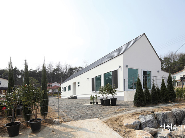 경북 영주의 한 전원마을, 가로로 긴 하얀색 단층집이 한눈에 들어온다. 손 가는 대로 꺼내 책을 읽고 마당을 뛰놀며 아이가 무럭무럭 자라길 바라는, 엄마의 마음이 포근히 담긴 집이다.취재 조고은 사진 변종석▲ 동서로 긴 대지를 따라 남향으로 앉힌 집“행복이 무엇일까 늘 고민해요. 그 의미는 저마다 다르겠지만, 생각할수록 그리 거창한 것은 아니더라고요. 딸아이가 하루라도 빨리 작고 따뜻한 집에서의 소소한 즐거움을 느낄 수 있었으면 했어요.”‘집’ 하면 누구나 떠올리는 박공지붕의 단순한 선을 가진 단층집. 이곳에 이상민, 박희경 씨 부부와 딸 수아가 산다. 부부는 아파트에 살 땐 주말마다 집에 있는 시간이 너무 아까웠다고 말했다. 가까운 곳에라도 나들이를 다녀와야 ‘알차고 재미있게 잘 보냈구나’ 싶었다고. 하지만 이제는 내 집에서, 마당에서 직접 가꾼 봄꽃을 매일 만나고, 창으로 쏟아져 들어오는 한낮의 햇볕을 여유롭게 만끽한다. 집이 곧 휴식처가 되는, 꿈 같은 일상이다.집을 짓자고 먼저 제안한 건 아내 희경 씨였다. 남편 상민 씨는 각종 편의시설이 지척에 있고 지하주차장에서 집으로 바로 연결되는 아파트 생활을 포기하고 싶지 않았다. 전원주택은 나이가 더 들고 나서 천천히 지어도 되지 않느냐는 입장이었다. 하지만 희경 씨는 한 달간 남편을 설득하며 집짓기를 밀어붙였다. 마침 영주 시내에서 차로 10분도 채 걸리지 않는 전원마을 단지에 마음에 드는 땅이 나왔고 그중 한 곳을 분양받았다. 원래 계획된 30채가 모두 분양되고 뒤늦게 추가된 세 필지 중 하나였다.▲ 현관 바닥은 건축주가 직접 고른 핸드메이드 패턴 타일로 포인트를 주었다.▲ 긴 장방형 외관 덕분에 수아네 집은 동네에서도 이웃들의 관심을 한몸에 받고 있다.▲ 엄마는 아이를 위해 거실의 긴 벽을 따라 책장을 두어 서재처럼 꾸몄다.House Plan대지위치 : 경북 영주시 대지면적 : 574㎡(174평)건물규모 : 지상 1층건축면적 : 116㎡(35평)연면적 : 116㎡(35평)건폐율 : 20% / 용적률 : 20%주차대수 : 2대 / 최고높이 : 3.3m공법 : 기초 - 줄기초, 지상 - 경량목구조구조재 : 벽 - 2×6 구조목, 지붕 - 2×8 구조목지붕마감재 : 컬러강판단열재 : 크나우프 에코배트 R21, R32외벽마감재 : 스터코플렉스 창호재 : 융기 베카 드리움 33㎜ 3중 창호설계 및 시공 : 트라움 목조주택 043-214-6148“막바지에 들어와 터를 닦을 때부터 이웃들이 많이 궁금해했어요. 뼈대가 세워지고 집의 윤곽이 드러나면서부터는 더더욱 그랬죠. 영주에서는 찾아보기 어려운 집이라 그런지, 교회나 마을회관 아니냐고 묻는 분들도 많았어요.”‘단순한 멋이 가장 오래 남는다’는 희경 씨는 원하는 집의 모습이 명확했다. 동서로 긴 대지 모양을 따라 남향으로 앉힌 집은 직사각형 모양에 박공지붕을 얹고 하얀색 스터코플렉스로 심플하게 마무리했다. 굳이 단층을 고집한 건 가족의 삶이 층별로 분리되지 않았으면 하는 마음에서였다. 2층을 올릴 경우 법정 용적률에 맞추기 위해 각 층의 바닥 면적이 줄어드는 것도 마음에 걸렸다. 고민한 결과, 방 두 개, 욕실 두 개에 널찍한 거실 겸 주방과 긴 복도가 있는 단층집이 탄생했다. 욕심부리지 않고 꼭 필요한 만큼만 담아 정갈한 느낌이다. ▲ 간소하게 구성하되 화이트 컬러로 통일감을 준 주방▲ 주방과 연결된 거실에는 창을 크게 내어 늘 따뜻한 햇볕이 들어온다.Interior Source내벽 마감재 : 신한벽지, 개나리벽지 바닥재 : 구정마루 프라하 욕실 및 주방 타일 : 키엔호 핸드메이드 타일수전 등 욕실기기 : 세비앙샤워기, 대림도기주방 가구 : 주문제작조명 : 서울 유토조명 LED방범창 : 고구려 시스템현관문 : 코렐시스템도어방문 : 영림도어붙박이장 : 한샘데크재 : 고벽돌PLAN - 1F◀ 크지 않게 구성한 손님용 욕실은 일체형 수전 & 도기 세트로 깔끔하게 꾸몄다. ▶ 수아의 놀이방 또는 엄마, 아빠의 개인 공간이 되어주는 작은 방 ▲ 널찍한 안방에는 가족을 위한 싱글침대 세 개를 나란히 두었다.새하얀 자태로 존재감을 자랑하는 외관처럼 주택 내부 역시 화이트 컬러로 통일감을 주었다. 여기에 서울, 경기도로 발품을 팔아 고른 소품과 그림 액자, 핸드메이드 패턴 타일 등이 인테리어에 포인트가 되어준다. 모든 욕실은 물때가 자주 끼는 특성상 청소하기 힘들다는 주부의 현실적 고충을 반영하여 최대한 작게 구성했다. 특히 안방에 딸린 욕실에는 창문을 크게 내달라고 요청했는데, 덕분에 종일 볕이 잘 들고 통풍이 좋아 늘 보송보송하다.거실에서부터 안방 입구까지 벽을 따라 길게 늘어선 책장은 아이를 위해 특별히 준비한 선물이다. 일상 속에서 자연스럽게 책과 친해질 수 있는 환경을 만들어주고 싶었던 엄마는 거실에 TV 대신 동화책이 가득 꽂힌 책장을 두었다. 그 마음을 다 안다는 듯, 수아는 온 집을 누비다가도 어느새 책장 앞에 앉아 책을 읽는다.지난 1월 입주한 집은 매일매일 단장하며 한층 풍성해지고 있다. 마당에 깔린 고벽돌은 하나하나 손수 작업했고, 화초와 나무 심기 등 정원 손질도 한창이다. 사계절 예쁜 정원을 꾸미려면 아직 공부할 게 산더미라는 부부의 얼굴엔 해사한 웃음이 넘친다. 아주 사