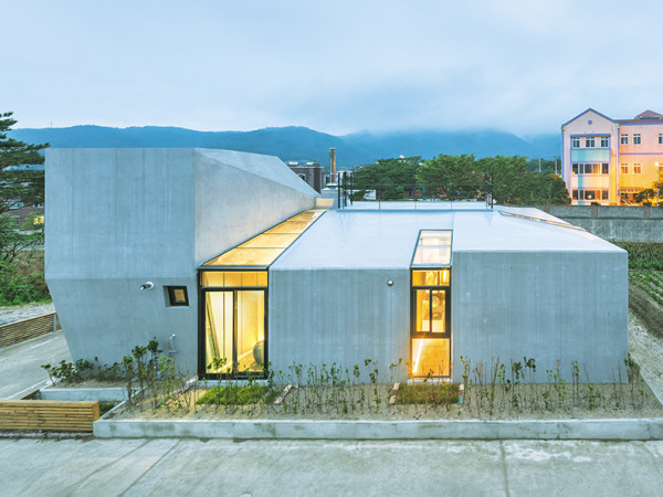 불리는 이름처럼 이 집은 발코니가 중요한 요소로 작용한다. 가족을 위해 비워지고 가족에 의해 채워질, 발코니가 있는 집을 만났다. 취재 김연정 사진 신경섭 속초시청에 오래 근무해 온 부부와 그들의 두 아이를 위한 집이다. 대지는 도심지이지만 농촌의 풍경과 아파트, 교육기관 등이 뒤섞여 있는 도농복합지역에 위치한다. 바로 옆에는 옥수수밭과 작은 시골집이 있고, 뒤로는 거대한 대학교 공연장과 부속어린이집이 서 있으며, 그 너머로 설악산이 마치 콜라주처럼 두서없이 다가온다. 눈이 많이 오는 지역임을 고려하여 물이 고이지 않는 박공지붕을 선호하는 건축주와, 2층에 자신의 독립된 공간과 옥상테라스를 원하는 아이를 위해 박공지붕과 평지붕이 결합된 매스를 착안했다. 단순한 사각형 박스형태의 매스에 경사지붕으로 중심부를 높여 주고, 가장 높은 부분은 평평하게 만들어 테라스로 사용할 수 있도록 했다. 콘크리트 박공지붕은 지붕 경사를 충분히 완만하게 하여 내부에 과도하지 않은 천장 높이를 구성하면서도, 방수에 유리한 구조를 가진다. 또한 실내 구조벽을 최소화하여 최대한 가변적인 평면을 만들고 아이들이 커가면서 변화하는 가족의 요구사항에 대응할 수 있도록 했다. ▲ 거실에 면한 발코니는 목재 데크로 마감되어 마당과의 연계성을 높였다. ◀ 마을 전경을 바라볼 수 있는 지붕 테라스 ▶ 농촌의 풍경과 도심의 시설이 함께 공유하는 곳에 집이 위치한다. HOUSE PLAN 대지위치 : 강원도 속초시 노학동건물용도 : 단독주택대지면적 : 285.4㎡(86.33평)건물규모 : 지상 2층건축면적 : 142.56㎡(43.12평)연면적 : 136.23㎡(41.20평)건폐율 : 49.95%용적률 : 47.73%구조재 : 철근콘크리트조외부마감 : 노출콘크리트내부마감 : 석고보드 위 페인트설계 : 에이엔디 정의엽 070-8771-9668 www.a-n-d.kr ▲ 단순한 박스 형태의 매스에, 경사지붕으로 중심부를 높여 완성한 외관 발코니는 외부와 내부 사이의 온도차를 완충시키기 때문에, 우리나라처럼 사계절의 기후변화가 심한 지역에서는 에너지사용량을 줄일 수 있는 효율적인 방법이다. 법적으로 바닥면적에서 공제해주는 1.5m 폭의 아파트 발코니는 한국의 현대주거공간에 나타나는 보편적인 특징이다. 이런 발코니는 단열뿐 아니라 내부공간의 경험에 있어서 그 역할이 중요함에도 건축적으로 그리 큰 관심의 대상이 아니었다. 특히 아파트 발코니는 내부공간이 확장되면 곧 사라지거나 잡다한 기능을 수행하는 무의미한 공간으로 인식되었다. 아파트에서 살아온 건축주를 위한 이 단독주택에서 발코니를 잉여공간이 아니라 집을 구축하는 본질적인 요소로 사용하고자 했다. 집의 중앙부는 공용공간이 되고 외부에 면해 각 기능을 위한 실들을 나누었다. 이때 방과 방을 분할하는 것은 벽이 아니라 발코니 공간이다. 발코니는 반듯한 사각형의 내부공간을 사다리꼴 모양으로 파고들면서 주변의 양호한 풍경과 향으로 내부를 열어놓는다. 사방에서 파고들어온 크고 작은 발코니 공간으로 인해, 내부는 하루 종일 변화하는 빛과 풍경이 스며들고, 집 안 어디나 밝은 느낌을 유지할 수 있다. 단순한 외관에 비해 내부는 다채로운 평면과 높이를 가진 공간으로 구성된다. 이 집의 발코니는 ‘비어진 벽(Voidwall)’으로서 내부공간을 분할하고 내·외부 공간 사이의 관계를 주도한다. 하나의 방은 하나의 발코니를 가지고, 발코니들의 성격이 이 집을 규정한다. 발코니의 다양한 모양과 이질적인 마감 재료의 사용은 극히 절제된 내부공간의 단순함과 대조되어 선명히 드러난다. 발코니로 나눠진 각 방들은 대형 미닫이문을 열어 마치 거실의 일부처럼 통합될 수 있다. 결과적으로 1층은 하나의 공간으로 쓰일 수도 있고, 여러 개의 공간으로도 분할이 가능한 가변성을 갖는다. ‘비어진 벽’으로서의 발코니는 거주공간에 많은 역할을 하기 위해 비워져 있다. 작은 침실의 발코니는 대지 동쪽의 출입구와 소나무 숲으로 열려있어 멋진 전망과 함께 출입하는 사람을 반길 것이다. 거실에 면한 넓은 발코니는 목재 데크로 마감되어 휴식공간이자 마당과 연계성을 높인다. 안방 발코니는 석재타일로 마감하여 화분을 기르거나 수집물을 전시하는 공간으로 쓰일 수 있고, 서재 발코니는 벽면녹화와 음지식물을 기르는 실내정원이 된다. 부엌 발코니는 다용도실의 확장된 공간으로 사용되면서 벽난로의 장작을 쌓아놓고 빨래를 건조하는 등 다양한 서비스공간으로 쓰일 수 있다. 무엇보다 중요한 것은 이 발코니가 시간이 흐르면서 가족의 삶의 방식과 취향에 맞게 유동적으로 채워질 것이고, 외부와 내부를 적절히 연결하는 매개공간이 된다는 것이다. ▲ 1층 내부. 각 공간과 연계된 발코니가 한눈에 들어온다. ▲ 화이트 컬러로 심플하게 완성한 주방의 모습 ▲ 발코니의 천창과 유리벽에는 자외선 차단 선스크린을 설치하여 과도한 온도 상승을 막았다. PLAN – 1F / PLAN – 2F ▲ 안방 발코니는 석재타일로 마감하여 내부와 절묘한 조화를 이룬다. 건축주는 추운 지역임을 감안하여 단열에 효율적이면서도 개방적이고 밝은 공간을 원했다. 평당 450만원이라는 제한된 예산 때문에 추