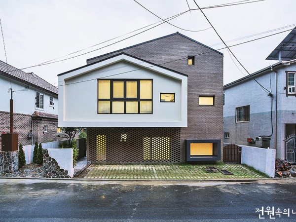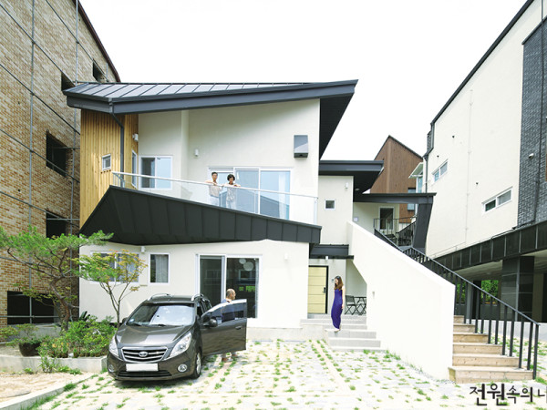 집을 어떻게 아름답게 꾸밀 수 있을까 고민하던 시간들이 생활의 중심을 회사에서 집으로 돌아오게 만들었습니다. 가장 마음에 드는 점은 무엇보다 의지가 되는 더 많은 가족들과 함께 있을 수 있다는 것입니다. ‘하루가 즐거우려면 이발을 하고, 일주일이 즐거우려면 여행을 하고, 한 달이 즐거우려면 차를 사고, 일 년이 즐거우려면 새집을 사라’는 영국 속담에 ‘평생이 즐거우려면, 가족과 함께 듀플렉스하우스를 지어라’를 추가하고 싶을 만큼, 가족과 행복한 시간을 공유할 수 있게 되어 정말 기쁩니다. 취재 김연정 사진 변종석 ◀ 2층으로 올라가는 외부 계단 아래 테이블을 두어 휴게공간을 마련했다. ▶ 주택의 배면. 살림이 많은 부모님 세대를 배려해 뒤쪽에도 발코니를 두었다. 이제 막 모습을 갖춘 이 집에는 결혼 6년 차 젊은 부부와 처가 부모님, 그리고 처남이 함께 산다. 전세 계약의 만료시점이 다가와 새 보금자리를 알아보던 중, 때마침 처가 부모님도 24년 된 노후한 주택을 처분하길 원해 함께 집을 지어 살아보자고 마음을 맞췄다. 어떤 집을 원하는지 명확하게 설명할 수 있어야 이 세상에 단 하나뿐인 ‘우리 집’을 지을 수 있다고 생각한 부부는 인터넷뿐 아니라 국내 주택 건축서적, 외국의 각종 디자인 및 인테리어 책까지 살펴보며 자료 수집에 많은 노력을 기울였다. “아내는 집을 잘 짓기 위해서는 집 짓는 각 주체들 간의 원활한 커뮤니케이션이 가장 중요하다며 주택건축에 대한 기본적인 개념, 전체적인 공사 프로세스와 각 세부 공정까지 공부했어요. 특히 처가 부모님도 함께 살아야 할 집이기에 두 분이 원하시는 바를 충분히 반영하고자 많은 대화를 나누었죠. 그리고 그 내용들을 수집한 이미지 자료와 연결시키는 작업까지 열심히 머리를 맞댔어요.” 사실 처음에는 건축가의 설계를 고려하지 않았다. 단지 집을 지으면 서비스처럼 해주는 업무가 ‘설계’라고 생각했다. 그러나 공부하면 할수록 건축가와 설계의 중요성을 절실히 깨닫게 되었다고 한다. 부랴부랴 5~7군데 회사들과 상담을 진행했지만, 가족이 100% 만족할 만한 해답을 얻지 못했다. ▲ 1층 내부 전경. 출산 계획에 따라 변형 가능한 방과 젊은 세대에 맞춰 인테리어한 공간이 눈길을 끈다. HOUSE PLAN 대지위치 : 경기도 용인시대지면적 : 263.6㎡(79.73평) 건물규모 : 2층 건축면적 : 109.87㎡(33.23평) 연면적 : 192.59㎡(58.25평) 건폐율 : 41.68% 용적률 : 73.06% 주차대수 : 3대 최고높이 : 8.8m 공법 : 기초 - 철근콘크리트, 지상 – 경량목구조 구조재 : 경량목구조 지붕재 : 리얼징크 단열재 : 비드법보온판 외벽마감재 : 스터코 창호재 : PVC창호 내벽마감재 : 목재사이딩, 벽지 바닥재 : 강마루 설계담당 : 안태우, 이경선, 이윤광, 조승오, 이영근 설계 : 건축사사무소 KDDH 김동희 02-2051-1677 www.kddh.kr 시공 : TCM“뒤늦게 건축가를 찾기 시작했고 우연히 KDDH 김동희 소장님을 알게 되었죠. 나중에라도 상담 받고 싶어 SNS로 연락을 부탁드렸는데, 5분도 안 되어 금방 답장이 왔어요. 전화통화 후 우리가 찾던 건축가란 생각이 바로 들었어요.” 대지 주위로는 이미 지어진 4층 규모의 다세대주택들이 자리 잡고 있었다. 건축가는 삼각형이 조합된 형상의 건물을 제안하여 높고 네모반듯한 주변 건물과 차별을 주고자 했다. 1층과 2층을 연결하는 동선에 대해서는 여러모로 고민이었다. 건축주가 4~5년 후 해외 주재원으로 파견되면 1층은 임대할 생각이었기에 내부 연결동선은 필요 없었다. 오히려 외부에 계단을 두어 두 세대 간의 독립성을 강조하기로 했다. 각 층의 내부는 나무의 질감을 살리고 컬러를 입힘으로써 다채로운 느낌을 주는 것으로 마무리하였다. ‘대가족’이란 말이 ‘대단한 가족’처럼 되어버린 요즘, 그동안 각자 다른 생활을 해온 그들이 한 지붕 아래 뭉친다는 것은 분명 쉽지 않은 결정이었을 테다. 가족이란 울타리 안에서 불편함보다는 위안을 받고, 단점보다는 장점이 더 많이 생길 앞으로의 생활을 기대해본다. 자녀세대 1층은 자녀 부부의 공간이다. 내년 중으로 출산 계획을 가지고 있기 때문에, 가벽을 세워 공간을 분리할 수 있는 큰방 하나와 부부침실, 거실, 주방, 욕실 등으로 평면을 나누었다. 천장이 낮아 거실 부분만 40㎝ 정도 바닥을 낮추었고, 단 차이 나는 부분은 책장을 설치했다.책장 자체가 의자가 되기 때문에 때로는 독서의 공간으로, 때로는 토론의 공간으로 자유롭게 활용할 수 있다. 부부 모두 취미 생활로 인한 물품들이 많아 수납에도 중점을 두었다. PLAN-1F▲ 거실 바닥을 낮춤으로써 천장이 낮아 답답했던 평면을 해결할 수 있었다. ▲ 입구 쪽 서재. 앞으로 아이가 태어나면 아이 방으로 꾸밀 예정이다. ▲ 컬러풀한 조명이 돋보이는 주방은 아일랜드형으로 꾸며 효율성을 높였다. ◀ 책이 많은 남편을 배려해 곳곳에 책을 수납할 수 있는 공간을 두었다. ▶ 퍼플 컬러로 산뜻함을 살린 부부침실. 원목침대는 건축주가 손수 제작했다. 부모세대 부모님과 처남의 공간으로 전체적인 구조는 1층과 크게 다르지 않다. 경사지붕 덕에 천장이 높고 시원한 공간감을 자랑하는 2층에는 바둑을 두는 아버지의 취미