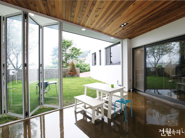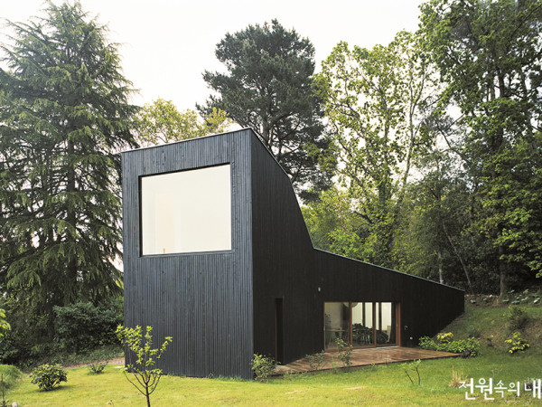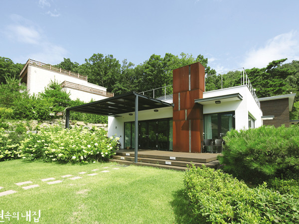 세월이 지나도 늘 변함없이 곁을 지키는 자연. 그 안에 고즈넉이 자리 잡은 주택은 시간의 흐름을 욕심 없이 담아낸다. 취재 조고은 사진 변종석▲ 집의 전면이 아닌 측면에 있는 현관문. 마당의 산책로를 따라 진입한다. ▲ 단순한 매스에 강판으로 포인트를 준 주택의 전면 HOUSE PLAN 대지위치 : 경기도 용인시 양지면 대지면적 : 863㎡(261.06평) 건물규모 : 지하층, 지상 1층 건축면적 : 159.84㎡(48.35평) 연면적 : 184.5㎡(55.81평) 지하층 - 24.66㎡(7.46평), 1층 – 159.84㎡(48.35평) 건폐율 : 18.52% 용적률 : 18.52% 주차대수 : 1대 최고높이 : 6.2m 공법 : 기초 - 철근콘크리트조, 지상 – 철근콘크리트조 구조재 : 철근콘크리트 지붕재 : 제물치장방수 + 우레탄도막방수, 아스팔트싱글 단열재 : 외단열 - 비드법보호판, 내단열 – 열반사단열재 외벽마감재 : 드라이비트, 적삼목사이딩, 내후성강판 창호재 : LG 알루미늄 시스템창호 설계 및 시공 : ㈜티트리건축사사무소 031-769-1541 ◀ 깔끔하게 정돈된 손님용 화장실 ▶ 공적 공간과 사적 공간을 잇는 복도. 양쪽 벽면에 창을 내어 마치 자연 속에 있는 듯한 기분이다. ▲ 주방에서 바라본 거실모던한 외관의 아담한 단층집은 마을의 가장 깊은 곳에 자리한다. 은퇴 후 자연에서의 삶을 그려왔던 건축주는 지난 2006년 이 마을에서 가장 처음으로 집을 지었다. 일을 그만두기 전까지는 주말주택으로 삼을 요량이었다. 집을 단층으로 지어 보일러실 겸 창고는 지하에 두고, 실거주 공간인 1층을 최소한의 공간으로 구성한 것도 그 때문이다. 집을 지은 후, 건축주 부부는 각자의 성을 따서 ‘민오헌’이라 이름 붙였다. 8년이 지난 지금도 여전히 주말주택으로 사용하고 있지만, 건축주는 조만간 2층으로 증축해 살림을 아주 옮겨올 계획도 품고 있다. ▲ 크게 낸 창으로 늘 환하게 빛이 들어오는 거실. 초록의 기운을 한껏 느낄 수 있다. 대문을 통과한 후 마당의 야트막한 산책로를 돌아 걸어가면 집의 측면에 있는 현관으로 이어진다. 복잡한 바깥일을 마치고 집으로 돌아왔을 때 안식처로 걸어 들어간다는 느낌을 받고 싶었다는 건축주의 의견을 반영한 동선이다. 대문과 현관의 거리를 최대한 짧게 두는 동선의 효율성을 포기한 대신, 마당을 거니는 동안 마음은 한결 편안하고 가벼워진다. 현관문을 열고 들어가 가장 먼저 마주하게 되는 건 창 너머 중정(中庭)이다. 건물의 매스를 두 개로 나누어 그 사이에 중정을 배치하고 거실, 복도 벽면에 크게 창을 낸 덕분에 실내에서도 늘 자연의 변화를 체감할 수 있다. 양옆으로 펼쳐진 복도를 따라 왼쪽에는 거실 겸 주방이, 오른쪽에는 침실과 서재가 자리한다. 현관을 중심으로 공적 공간과 사적 공간이 자연스럽게 둘로 나누어지는 배치다. 남향으로 놓여 볕이 잘 드는 거실은 늘 환할 뿐만 아니라 주변을 둘러싼 산의 풍광을 집 안 가득 들인다. 침실은 이른 아침 햇살에 기분 좋게 눈뜰 수 있도록 동향으로 배치했다. 이곳 벽장에는 창호지 문을 달아 정갈하면서도 동양적인 느낌을 주었고, 창가의 커다란 욕조와 사우나 시설을 둔 욕실은 건축주 부부에게 온전한 휴식 공간이 되어준다. 다다미방을 연상케 하는 서재는 평면상 가장 안쪽에 있다. 이곳에서 부부는 조용히 책을 읽거나 차를 마시며 사색의 시간을 보낸다. ◀ 다다미방을 떠올리게 하는 서재 ▶ 복도를 따라 낸 창으로 중정의 풍경이 그림처럼 들어온다. ▲ 정갈한 느낌의 침실. 창호지 문을 열면 숨어 있던 TV장이 나온다. INTERIOR SOURCES 내벽 마감 : 락카 도장 바닥재 : 구정 온돌마루 수전 등 욕실기기 : 아메리칸스탠다드, 대림 현관문 : 성우스타게이트 방문 : 무늬목 위 도장▲ 침실에 딸린 욕실에서도 자연을 즐기며 기분 좋은 휴식을 누릴 수 있다. 집을 짓고 8년의 세월이 지나는 동안 변한 것은 어느새 마을을 가득 채운 이웃들만이 아니다. 주택의 주차장은 처음엔 자연스러운 경사로였으나, 건축주의 지인이 미끄러져 넘어질 뻔한 후에 단을 두어 평평하게 만들었다. 또, 페치카의 연도를 따라 돌출된 외벽 위에 내후성 강판으로 포인트를 준 것은 집을 짓고 4년 후 새로 시공한 것이다. 처음에는 모던한 디자인을 원해 외관 전체를 드라이비트로 도장하여 마감하였으나, 시간이 지날수록 너무 밋밋한 느낌이 들어 전체적인 분위기를 해치지 않는 선에서 조금씩 외관을 바꿔나갔다. 세월에 따라 주인과 함께 늙어가고 자연스럽게 변해가는 집. 이는 단순히 내버려두는 게 아니라 때에 따라 필요한 것을 보충해주고 다듬어나간다는 의미일 것이다. 매일 머무는 집이 아님에도, 민오헌이 주변과 조화를 이루면서도 흐트러짐 없는 모습을 유지하고 있는 것은 오롯이 건축주의 공이다. 곧 이곳에서 평안한 노후를 맞이할 건축주는 늘 해오던 것처럼 칠이 벗겨진 곳을 손보고 햇볕이 너무 강하게 드는 곳엔 차양을 치느라 분주할 것이다. 매일 아침 한가로이 마당을 산책하고, 저녁엔 2층 창가에 앉아 붉게 노을 진 풍경을 한없이 바라보고 있지 않을까. 정성으로 가꾼 정원에도 꼭 지금처럼, 해마다 다른 꽃과 풀이 또 새로이 피어나리라 믿는다.※ 월간 <전원속의 내집> www.uujj.co.kr 본 콘텐츠의 저작권은 