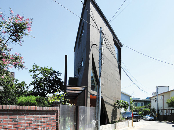 이 땅은 과천시 도시계획에 의해 마을길인 소로(小路)가 생기면서 앞집의 마당이 잘려나가 생긴, 그야말로 자투리땅에 지어진 협소주택이다. 취재 정사은 사진 변종석, 건축가 제공이전 땅주인에게 이 땅은 계륵(鷄肋)이었다. 남쪽은 도로에, 북쪽은 옆집 담벼락에 갇힌 삼각형 땅. 심지어 온전한 삼각형도 아닌, 모퉁이가 잘린 삼각형이다. 50㎡ 작은 면적에 도대체 무엇을 할 수 있단 말인가! 덕분에 건축주는 조용한 주택가 남향 땅을 시세보다 저렴하게 살 수 있었고, 땅주인은 쓸모없는 땅을 처분할 수 있었으니 결과적으로 보면 모두에게 행운인 셈이다.삼각형 창을 트레이드마크로 내세운 작은 집철근콘크리트로 지어진 집은 거푸집의 노출면을 그대로 외벽 삼아 페인트로 마감했다. 노출콘크리트라고 할 수 있지만 그러기엔 마감이 투박한데, 이유인즉 콘크리트 면을 매끈하게 뽑으려면 거푸집과 공정비가 많이 들기 때문이란다. ‘작품주택 아니고서야 그럴 필요 없다’는 건축주의 강단 있는 의지가 이 마감을 쓸 수 있었던 선행조건이었다. 땅은 50㎡, 알뜰살뜰 면적을 모아 실내를 구성하니 쓸 수 있는 면적이 57㎡이다. 허가면적인 46.4㎡에 발코니 확장으로 10.6㎡ 보너스 면적을 추가로 얻어 탄생한 협소주택 사이(sai)다.▲ 아이에게 작게나마 마당을 만들어 주고 싶어 건물을 필로티로 만들었다. 이 때문에 집은 삼각형 모양의 창을 갖게 되었다. 해가 다르게 오르는 집값 때문에 내 집 마련이 쉽지 않은 현실에서 “땅부터 집까지 전세금으로 모두 감당할 수 있다”는 말은 자신이 내뱉고도 불가능해 보였다고 한다. 건축주 이야기는 여기서부터 시작된다.아내의 동의를 얻는 데만도 장장 4년이 걸렸다. 전세금으로 짓겠다는 조건 외에도 기존의 생활권을 유지하면서 맞벌이 부부의 출퇴근이 가능해야 했다. 마침 단독주택 열풍과 맞물려 TV와 잡지에서 외국 협소주택을 여러 채 소개했고, 여기서 아이디어를 얻은 그는 아내의 허락이 떨어짐과 동시에 이 주택을 구상하기 시작했다. 포털사이트에서 제공하는 위성지도와 지적도, 그리고 발품을 팔아가며 작은 땅을 찾아다니길 1년 남짓. 마음에 드는 땅이 있었지만 금액이 맞지 않아 포기한 적도 있고, 작은 땅이지만 맹지이기 때문에 집을 지을 수 없는 조건도 있었다. 어느 휴일, 자전거를 타고 산책하다 발견한 이 땅은 남향인데다가 작아 비용도 감당할 수 있었다. 그때 건축주는 속으로 외쳤다. ‘땅이 내게로 왔다!’고. INTERIOR SOURCES페인트 : 친환경페인트주방 벽면 마감재 : Back-painted glass + 친환경페인트욕실 타일 : 국내산수전 등 욕실기기 : 아메리칸 스탠다드조명 : T5 형광등(램프랜드)바닥재 : 합판마루(동화자연마루)주방기기 : 합판 제작 + 투명락카도장현관문 : 에이스 단열도어데크재 : 방부목 데크재계단재 : 합판마루(동화자연마루)◀ 현관 문을 열면 바로 만나는 주방부와 계단실 ▶ 주방 한편에 자리 잡은 식탁 ▲ 사각 형태에 리드미컬한 삼각형 창을 갖는 디자인 주택으로, 협소주택임을 가늠하기 힘든 외관이다.▲ 2층은 화장실과 다락, 거실이 있는 가족의 공용공간이다. 사실 이 주택은 문이 없기 때문에 모든 방을 가족이 함께 쓴다.사실 그에게 ‘집’이란 평생 번 돈으로 으리으리하게 지어 죽을 때 까지 사는 곳이 아니라 그때그때 필요에 따라 옮겨가면 되는 곳이었다. 이런 생각이 들자 자연스레 욕심을 버릴 수 있는 부분이 생겼다. 젊은 나이니 돈이 넉넉지 않은 것은 당연했고, 그렇다면 면적과 치장에 욕심을 내려놓자 결심했다. 실내는 최대한 간결하게 구성해 마감재를 덜어내되, 보기 좋게 구성하는 것은 인테리어 디자이너인 자신이 직접 하면 되었다. “나중에 아이가 크면 좁아서 어쩌나…”하는 주변 염려는 “팔고 이사 가면 되지!”라는 명쾌한 대답으로 일축했다.작은 땅일수록 디자인 중요도는 크다. 쓸 수 있는 건축면적이 7~8평밖에 되지 않아 자칫 계단을 잘못 내기라도 하면 실제 사용할 수 있는 면적이 더 줄어들 터였다. 건축주는 설계자를 수소문하기 시작했고, 전부터 협소주택에 관심을 두고 연구해온 오파드건축연구소 오문석 건축가와 연이 닿았다. 외관 디자인에서부터 실내 구성과 인테리어, 배치까지 건축가와 인테리어 디자이너 두 사람의 만남으로 밀도 높고 짜임 좋은 주택이 만들어졌다.SECTION◀ 욕실로 향하는 통로는 조약돌과 목재 패널로 디자인 요소를 더했다. ▶ 계단실 면적을 최소화하고 다락과 욕실을 짜임 좋게 배치한 2층협소주택 건축 솔루션협소주택의 과제는 계단실, 주차장, 방까지 각 실을 얼마나 유기적으로 구성하는가이다. 이들은 먼저 연면적 50㎡이하 주택은 주차장을 만들지 않아도 된다는 주차장법 시행령을 이용해 주차장 대신 필로티 구조의 야외공간을 디자인해 아이와 함께 뛰놀 마당을 만들었다. 실내는 한 층이 방 하나로 사용되는데 굳이 구분하자면 1층은 주방과 식당, 2층은 거실, 3층은 안방이다. 건축 착공허가 당시 정북방향 사선제한을 최소화할 수 있는 높이인 8m 이하를 지키기 위해 현관에서 1m쯤 아래에 주방과 식당을 배치하고, 여기서 생긴 레벨차를 이용해 화장실을 세미