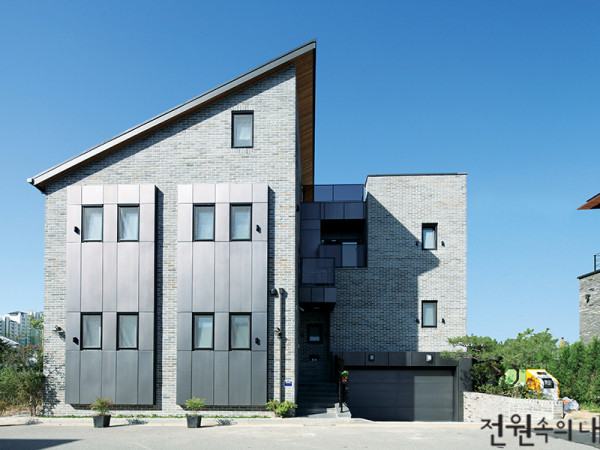 주어진 조건 속에서 건축주의 희망 사항을 공간 안에 효율적으로 풀어내는 일은 전문가의 고민과 배려에서 시작된다. 지하 취미실과 주차장에서부터 다락, 옥상까지 필요한 공간을 스킵플로어(Skip floor)로 층층이 쌓은 집을 찾았다.취재 조고은 사진 변종석HOUSE PLAN 대지위치 : 경기도 성남시 분당구 판교동대지면적 : 231.6㎡(70.06평)건물규모 : 지하 1층, 지상 2층건축면적 : 114.21㎡(34.55평)연면적 : 288.83㎡(87.37평)건폐율 : 49.31% 용적률 : 87.58%주차대수 : 2대최고높이 : 10.65m공법 : 기초, 지하층 - 철근콘크리트 지상층 - 경량목구조구조재 : 2×8 캐나다산 구조목재 2&BTR SPF등급지붕재 : 2×10 캐나다산 구조목재 2&BTR SPF등급단열재 : 에코배트 R30외벽마감재 : 청고벽돌, 블랙셔스, KMEW 사이딩창호재 : LG하우시스 3중유리 양면로이코팅 시스템창호설계 및 시공 : ㈜마고퍼스건축그룹 031-8017-0332 www.magopus.co.kr◀ 지하 주차장 진입로 옆 주택 현관부 ▶ 깔끔하게 마감된 실내 인테리어 쾌청한 하늘이 기분 좋은 날, 경기도 판교 단독주택단지에서 블랙의 모던한 외관을 자랑하는 집을 만났다. 건축주 부부와 두 아들이 사는 4인 가족의 첫 단독주택이다. 아파트에서만 살았던 건축주 부부가 첫 집을 지으며 원했던 것은 꽤 명료하고 구체적이었다. 간결한 디자인에 차량 2대를 수용할 수 있는 지하 주차장, 벽난로, 2층 세탁실과 빨래를 말릴 수 있는 발코니, 서재로 활용할 수 있는 다락 공간 등이 갖춰진 집. 이것이 그들이 제시했던 집의 조건이었다.경사지가 아닌 평지에서 지하 주차장을 구현하는 일은 생각보다 까다롭다. 차가 외부에서 지하로 진입하는 길을 확보해야 하기 때문이다. 게다가 해당 대지는 건축물이 지정선에 2/3 이상 접해야 하는 건축지정선, 서쪽의 지정공유외부공지 등 제약이 적지 않았다. 그래서 선택한 것이 바로 ‘스킵플로어(Skip floor)’다. 일반적으로 건물을 1층씩 나누는 것과 달리, 이 집은 계단실을 중심으로 1/2층씩 올라간다. 지하 주차장은 1/2층 아래에 두어 주차장 출입구와 현관까지의 높이차를 최소화했다. 주차장 반 층 아래층인 완전한 지하 1층에는 취미실이 자리한다. 스킵플로어 구조는 각 공간을 성격에 따라 자연스럽게 나누는 역할도 한다. 거실과 식당·주방, 자녀 공간과 부부 공간은 반 층의 높이차를 두어 영역을 분리했다. 가운데 계단실은 각 실을 구분 짓는 동시에 실타래처럼 엮어 하나로 묶어주는 장치이기도 하다. 1층에서 다락까지 집의 중심을 관통하는 거실 벽난로의 연도는 한겨울에도 훈훈한 열기를 집 전체로 전달할 것이다.PLAN – GF / PLAN – 1F / PLAN – 2F▲주택 외관. 스킵플로어로 완만한 경사의 주차장 진입로를 확보했다.▲1층 거실에서 반 층 올라가면 주방 겸 식당이 있다.“일부러 돈 들여 운동하기도 하는데, 일상 속에서 이 정도의 움직임은 오히려 생활의 활력이 되죠.”따지고 보면 높이나 계단 수에서 다른 집들과 차이는 없지만, 나누어져 있는 계단 형태 때문에 계단이 더 많고 층수가 높게 느껴지는 것이 사실이다. 계단참 부분이 복도처럼 길게 형성되어 수직 동선이 조금 길어진 탓도 있을 것이다. 하지만 건축주는 이것이 바로 ‘즐겁고 건강하게 생활할 수 있는 포인트’라고 말한다. 층층이 쌓이며 더욱 다채롭고 풍성해진 공간감 역시 이 집의 빼놓을 수 없는 매력이다.창은 인접 대지의 기존 주택과 남쪽 대지에 신축될 주택을 고려하여 건축주 가족의 프라이버시를 보호할 수 있도록 크지 않게 냈다. 대신 볕이 잘 드는 남쪽에 코너창을 내어 채광을 확보했다. 1층 거실에서는 전면 창을 열면 외부 공간으로 바로 연결되는데, 이곳은 사실 공유지로 지정된 공간이다. 보통은 나무를 심어 담장을 만들지만, 건축주는 이웃집의 동의를 구해 개방된 공간으로 함께 쓰기로 했다. 덕분에 두 집 사이에는 작지만 넉넉한 잔디 마당과 정원이 생겼다.INTERIOR SOURCES내벽 마감 : Terraco 친환경 ecotop 실내페인트, LG 지아벽지바닥재 : Polished Tile & LG하우시스 원목마루욕실 및 주방타일 : 바스디포수전 등 욕실기기 : 아메리칸 스탠다드주방가구 : 한샘 키친바흐조명 : 중앙조명계단재 : 티크무늬목 계단판현관문 : 신진도어방문 : 도장 제작도어붙박이장 : 도장 제작가구데크재 : LG하우시스 합성목재벽난로 : 삼미벽난로▲ 지하 주차장 진입로 옆 주택 현관부서재로 쓰는 다락. 천창을 내어 채광이 좋다.SECTION▲ 지하 주차장 진입로 옆 주택 현관부모던한 디자인에 샹들리에로 포인트를 준 주방 겸 식당. 건축주 부부가 세계 각국에서 수집한 접시와 장식품이 눈길을 끈다.◀ 깔끔한 느낌의 2층 욕실 ▶ 세탁실에는 빨래를 널기 위한 발코니를 두었다.전날 밤, 막 여행을 마치고 돌아왔다는 건축주 가족의 표정에 피곤한 기색이 없다. 몸에 꼭 맞춘 듯한 내 집에서의 안락함이 먼 길을 오가며 쌓인 노곤함을 하룻밤 새 말끔히 풀어주었나 보다.“이제는 어딜 가도 막둥이 아들이 ‘엄마, 집엔 언제가?’하고 물어봐요. 어떤 휴양지, 관광지보다도 우리 집이 훨씬 재미있고 좋대요(웃음).”식사 준비를 마친 엄마가 아이를 부르자, 아이 방 앞 계단실 난간 위로 장난기 어린 얼굴을 빼꼼 내민다. 