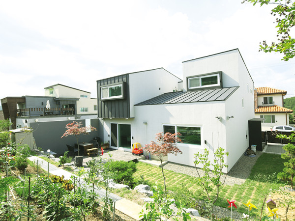 마당 있는 집에 살고 싶다는 막연한 동경만 있었어요. 사랑하는 아내와 함께 8년을 생활하면서 아이 둘을 낳고 보니 둘만 살 때는 느끼지 못했던 아파트의 불편함이 계속 보이더라고요. 에너지 넘치는 두 아이와 생활에 지쳐 게을러지는 제 모습이요. 특히 집에 개인적인 공간이 전혀 없다는 것이 참 답답했어요. 우연히 좋은 땅을 발견했고 아파트에 더 적응해버리기 전에, 마당과 다락이 있는 집에서 아이들을 키우기 위해, 무엇보다 이보다 더 게을러지기 전에 주택을 짓기로 결정했어요. 취재 정사은 사진 변종석 ◀두 건물을 잇는 브리지의 상단은 실내 면적으로 들이고 하단은 마당과 주방을 잇는 전이공간으로 만들어 마당생활을 즐기도록 했다. ▶ 높은 쪽에서 진입하는 주인세대 현관의 모습 경사지에 비정형의 결코 순탄치 않아 보이는 땅을 마련한 건축주. 장점으로 꼽을 만한 점은 남향과 택지지구치고는 다소 큰 면적이었다. 하지만 무에서 유를 창조하는 인테리어 디자이너가 직업인 건축주는 단점에서 더 큰 가능성을 찾았다. 비정형의 땅을 조물조물 만져 두 동으로 분리해 한 채는 우리집으로, 다른 한 채는 임대를 주는 아이디어를 생각한 것. ‘임대형 듀플렉스’의 탄생이다.이 집의 안팎으로 가장 눈에 띄는 점은 경사면을 활용한 방식이다. 대지의 본래 경사를 따라 자연스럽게 단차를 내는 방식으로 평면을 구성했는데, 세 개의 크고 작은 마당이 2.5m 레벨을 따라 적절히 연결되고 차단되며 집의 경계를 만든다. 또한, 두 집이 한 집처럼 보이게끔 외벽의 컬러를 통일하고 지붕과 창문, 창틀 등을 통일감 있게 적용했다.자신과 비슷한 또래에 비슷한 생각을 가진 입주자를 생각하며 건축주는 임대세대에도 특별히 신경썼다. 프라이버시를 존중하기 위해 출입구를 동서로 나누어 동선을 분리하고, 아이를 위한 공간인 다락과 계단 등의 공간도 짜넣었다.주택은 경사지의 단차를 극복함에 있어 건축의 효율성과 건강한 공간을 고려해 철근콘크리트와 목구조를 적절히 섞어 사용했다. 특히 주인세대의 벽체는 에코셀(Ecocell) 시스템으로 지어졌는데, 이는 왕겨숯을 이용해 단열과 습도 등을 잡는 시공사 GIP의 특징적인 공법이다. ▲ 2.5m의 고저차를 이용해 세 개의 마당을 만들고, 낮지만 차폐감 있는 디자인 돌담으로 시선을 적절히 가렸다. ▲ 주인세대 실내에서 바라본 2층의 모습. 난간의 일부를 유리로 대체하고, 곳곳에 창을 내어 밝고 따스한 실내를 만들었다. HOUSE PLAN 대지위치 : 경기도 용인시 대지면적 : 422.10㎡(127.72평) 건물규모 : 지하 1층, 지상 2층 건축면적 : 184.41㎡(55.80평) 연면적 : 387.72㎡(117.31평, 주인세대 251.05㎡+임대세대 136.67㎡) 건폐율 : 43.69% 용적률 : 91.86% 주차대수 : 3대 최고높이 : 10.14m 공법 : 기초 및 임대세대 1층 – 철근콘크리트구조 주인세대 및 임대세대 2층 - 경량목구조(에코셀 공법 적용) 구조재 : 철근콘크리트, 경량목구조 지붕재 : 컬러강판 단열재 : 외단열 - 비드법2종3호, 내단열 – 왕겨숯 외벽마감재 : 파렉스 창호재 : LG하우시스 Z:in 설계 및 시공 : ㈜GIP 031-259-7520 www.ecocellhome.com인테리어 : ㈜플러스디자인 02-587-5743 www.plusinterior.co.kr건축주는 평소‘살고 싶은 공간’에 대한 생각이 명확했다. 땅이 가진 지형을 크게 거스르지 않으며, 넓은 마당과 햇살이 가득 드는 집, 그리고 언제든 밖으로 나갈 수 있게 테라스와 연결된 주방과 수납공간이 곳곳에 숨어있는 짜임 좋은 집. 평소에‘주거’에 대해 많이 생각하고 경험해 본 사람이어야만 나올 수 있는 생각이었다.“좋은 집은 건축가가 만들어주는 것이 아니라고 생각해요. 본인의 라이프스타일은 본인이 가장 잘 알고 있을 테니까요”건축주의 아이디어를 토대로 아이들이 뛰어 놀며 즐길 수 있는 실내를 만들고, 들어올 빛을 고려해 창을 내었다. 지형을 활용해 실내를 스킵플로어로 구성하니 공간이 연결되며 생기는 벽체나 계단으로 실내가 다이내믹하다. 이때 생기는 자투리 공간은 수납공간이 되었다.아이에게 마당 있는 집을 만들어주고 싶었던 건축주. 공간 어느 한 곳 그들의 고민과 땀이 서리지 않은 곳이 없다. 두 아이에게는 ‘우리 아빠가 지어준 집’으로, 사는 내내 자랑거리가 될 주택이다. 주인세대 가족의 라이프스타일을 담은 설계와 스킵플로어를 활용한 공간 구성으로 실내를 다이나믹하고도 개방감있게 만들었다. 곳곳에 창을 내어 벽을 타고 밝은 빛이 집 안을 감싼다. 현관을 열면 거실과 주방, 테라스와 마당이 하나로 자연스럽게 어우러지고, 숨은 수납공간이 생활의 편의를 돕는다. ▲ 주방에서 바라본 거실의 모습. 지형의 단차가 실내에 고스란히 드러난다. PLAN – 1F◀ 자연스레 높은 층고를 갖게 된 주방과 식당.옆에 난 발코니 창으로 언제든지 마당으로 나갈 수 있다.▲ 서비스 공간인 다락 일부를 야외로 내어 프라이빗한 옥상을 만들었다. ▲ 2층 계단으로 오르면 복도를 중심으로 각 실이 나뭇가지처럼 뻗어 배치되어 있다. ◀ 두 아이의 방은 각자의 아늑한 다락을 가진다. 계단과 벽면을 활용해 수납공간을 짜 넣은 것이 눈에 띈다. ▶ 2층 발코니 앞에 소파를 두어 코지공간으로 활용했다. PLAN –
