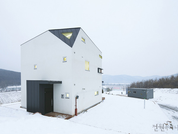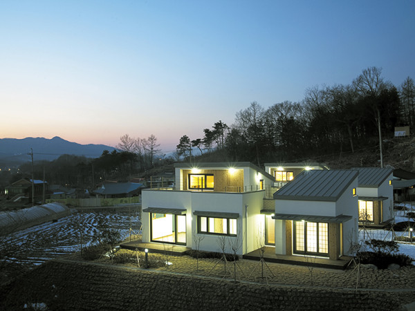도시인들은 전원주택을 꿈꾸며 삶의 여유를 찾고자 하는 미래를 그린다. 그러나 이 꿈들은 불편한 교통, 아이들의 학업, 땅 구입과 주택 건축에 대한 금전적인 문제로 쉽게 좌절되고 만다. 양평에 위치한 본 전원주택은 어린아이들을 자연 속에서 키우고자 하는 젊은 부부와 은퇴한 도시인들을 위해 지어졌다.구성 이세정 | 사진 권용상 ▲ 작은 집 3채로 아담하게 조성된 주택 단지 야경 부지는 양평역에서 10분 거리의 한적한 농가들이 모여 있는 마을에 위치한다. 서측의 대지는 사이트보다 낮아서 정감 있는 산세가 막힘없이 펼쳐져 있고, 그 앞의 논과 밭들은 농촌의 풍경을 더한다. 북측으로는 나지막한 마을 동산이 동네를 포근하게 감싸고 있다. 건축주는 약 450평 대지에 25평의 작고 소박한 세 채의 주택 단지를 원했다. 작은 규모로 짓는 대신 마당에는 한껏 자연을 들여놓고 텃밭을 마련하여 농촌의 즐거움을 체험할 수 있는 주택이어야 했다. 남북으로 긴 대지에 세 동 모두 최대한 남향 배치를 하되 일자가 아닌 조금씩 엇갈린 배치가 되어 각 집의 프라이버시를 보호하면서도 채광은 최대한 확보되도록 하였다. 동시에 담을 최소화하여 서로 독립적이면서도 소통이 되는 작은 커뮤니티를 형성하고 싶었다. 주요 거주공간은 남측으로 배치되어 태양 에너지를 적극 이용하고 출입구, 주차장 및 공용 유틸리티 공간은 북측으로 배치하였다. ◀ 한지 창을 통해 들어오는 빛의 변화로 매시간 다른 느낌을 주는 안방 ▶ 주택의 주출입구 HOUSE PLAN 대지위치 : 경기도 양평군 양평읍 용도 : 단독주택(3개동) 대지면적 : 1,458㎡(3개동) → (441㎡ / 486㎡ / 531㎡) 지역지구 : 보존관리지역 건축면적 : 각 동 86.73㎡(26.24평) 규모 : 지상 1층, 다락 2실 건폐율 : 19.67 % / 17.84% / 16.33% 용적율 : 19.25 % / 17.46% / 15.98% 주차대수 : 세대 당 1대 공법 : 기초- 철근콘크리트 줄기초 지상- 철근콘크리트 벽식구조 / 철근콘크리트 경사슬라브 및 평슬라브 구조재 : 철근콘크리트 지붕재 : 컬러강판 단열재 : 외벽150㎜ 네오폴, 지붕옥상 160㎜ 네오폴, 내부바닥 100㎜ 단열재 외벽마감재 : 플렉시텍스, 적삼목, 점토벽돌 창호재 : LG하우시스 PL창호 내벽마감재 : 석고보드 위 실크벽지, 친환경페인트, 타일 바닥재 : 강마루 및 타일 설계 : 이경선(홍익대학교 건축학과) + 권재희(스페이스 목금토 건축사사무소) 031-781-6545 www.spacemgt.co.kr 시공 : 대련종합건설(주) 02-906-3010 구조 : SDM 구조 전기, 기계 세원 엔지니어링 ▲ 채광, 태양열을 고려한 지붕 경사는 실내에 여분의 다락 공간을 선사한다. ▲ 담이 없는 대신 조금씩 엇갈린 배치로 집의 프라이버시를 보장한다. SCHEDULE PROCESS ▲ 다락 공간의 내외부전원주택의 에너지 해결을 위해 외단열을 채택하였고 법적기준치 이상인 150㎜의 벽체단열시공을 통하여 단열성능을 높였다(외단열 시스템인 경우 면적에서 혜택이 있는 점도 고려되었다). 또한 조망을 위해 설치된 큰 창호들은 3중 유리 시스템 창호를 택해 창으로 손실되는 에너지를 줄였다. 단열에 치중된 건물 대부분은 여름철 더위나 환기에 약한 단점이 있다. 이를 극복하기 위하여 각 실 어디에서나 맞통풍이 가능하도록 창문을 배치했다. 지붕의 경사도는 용도에 따라 디자인된 것인데 거실측 지붕은 남쪽으로 열려 겨울철에 태양에너지를 최대한 유입시키도록 하였고 안방측은 태양광을 설치하기 위한 경사로 디자인되었다. 건축 재료로 지붕은 징크 느낌의 컬러강판을 사용하고 외벽은 따스한 색감의 스터코 마감과 적삼목, 벽돌을 선택하여 주변 자연환경과 자연스럽게 어울리도록 하였다. 건물 주변 바닥면에는 빗물이 대지에 쉽게 흡수되도록 잔디블록과 굵은 마사를 깔았다. ▲앞마당을 향한 툇마루와 옥상 데크를 통한 내부 공간의 확장 ▲ 동선이 꺾이는 곳마다 창을 설치해 시야는 안에서 밖으로 확장된다. INTERIOR SOURCES 벽지 : 서울벽지, 개나리벽지 페인트: 삼화페인트 아이사랑 몰딩: 우딘숲 도어몰딩 주방 벽면 마감재: 벽산 방수석고 위 한보타일 욕실 타일: 한보타일, 대동타일 수전 등 욕실기기: 한양, 계림요업 조명: LED조명 남광, 대우조명 바닥재: 강마루 동화마루 주방기기: 파세코 현관문: 철재 갑종방화문 방문: 우림숲 도어 데크재: 목재 계단재: 평철판 위 집성목 ◀ 채광과 환기를 고려한 창의 배치 ▶ 창의 비율이 아름다운 배면 ▲ 이동이 가능한 계단용 수납가구 소형주택은 거실이나 방이 크지 않기 때문에 이로 인한 답답함을 느끼지 않도록 배려하는 게 먼저다. 이에 대한 고려로 동선이 꺾이는 곳마다 창을 설치하여 시야를 벽에서 머무르지 않고 탁 트인 자연으로 확장될 수 있게 했다. 또한 실내의 각 공간은 다양한 높이의 천장, 경사도가 다른 지붕, 크기와 높이가 다른 창, 분위기가 다른 조명으로 개성을 살려 디자인하였다. 또, 작은 집은 수납공간이 적다는 단점이 있는데, 보이지 않는 공간들을 활용해서 수납이 용이하도록 만들었다. 계단하부 공간을 활용하고 다락방으로 통하는 계단은 계단용 수납가구로 대체하여 개성과 실리를 동시에 취했다. 아일랜드 식탁도 분리가 가능해서 가족의 수, 혹은 상황에 따라 달리 배치하여