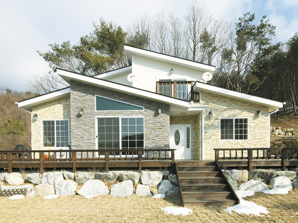 양평 용문산에서도 산세가 수려한 연수리 쪽은 예로부터 별장이나 주말주택 집터로 각광을 받아 왔다. 경사진 대지로 조망이 좋고, 남향의 따스한 볕이 하루 종일 드는 집. 지난해 지어져 이제 막 첫 겨울을 보낸 목조주택 한 채를 소개한다. 취재 이세정 사진 변종석▲ 집의 정면은 외쪽 지붕들의 경쾌한 리듬선이 돋보인다. ▲ 경사진 대지의 단차를 극복하고 더 나은 조망을 얻기 위해 기초를 높였다. HOUSE PLAN 대지위치 : 경기도 양평군 연수리 대지면적 : 596㎡(180.29평) 건물규모 : 지상 2층 건축면적 : 1층 85.30㎡(25.8평) / 2층 28.02㎡(8.4평) 연면적 : 113.32㎡(34.28평) 건폐율 : 14.31% 용적률 : 19.01% 주차대수 : 2대 공법 : 경량 목구조 2×6 구조재 : SPF 2×6, 2×4 지붕재 : 이중그림자 싱글 단열재 : JM인슐레이션 외벽마감재 : 파벽돌, 시멘트사이딩 창호재 : Alpine 시스템창호 내벽 마감 : 실크벽지 바닥재 : 강화마루 욕실 및 주방 타일 : 터키산 타일 설계 및 시공 : 오색나무집 070-8876-2195 http://cafe.naver.com/fivecolortree◀ 단지 맨 끝에 자리한 집은 필지 앞 멋진 소나무를 감상할 수 있는 좋은 뷰를 가졌다. ▶ 앞마당 가장자리는 목재 데크로 둘러 정원 관리의 부담은 줄이고, 석축의 위험을 방지한다. 문을 열자마자 훈훈한 공기가 몸을 에워싼다. 창밖은 눈발이 잔잔하게 날리는 2월 중순의 날씨지만, 실내는 반팔로 생활해도 무리가 없을 정도로 따뜻했다. “올겨울 기름 한 방울 쓰지 않았어요. 겸용으로 둔 화목보일러에 하루 2번 장작만 넣으면 충분해요. 더운 공기가 위로 올라가 2층도 생활하는 데 불편함이 없어요.” 건축주 조희송 씨는 집의 단열성능에 만족을 표했다. 양평 인근에서 철근콘트리트주택, 조적조주택 등 두루 지내봤지만, 목조주택이 최고라고 손을 치켜든다. 물론 전제는 있다. “목조주택은 어떻게 짓느냐에 따라 성능이 하늘과 땅 차이인 것 같아요. 그런 내용을 미리 알고 잘 짓는 건축회사를 찾느라 수소문을 많이 했어요. 결국 경북 영주까지 직접 찾아가 건축을 맡겼으니까요.”▲ 지붕 구조를 그대로 살린 거실 천장. 남향의 전면창으로 종일 따뜻한 볕이 들어온다.용문산 자락 수려한 골짜기에 자리한 터는 조씨가 직접 단지를 개발해 분양하고 있는 땅이다. 정남향에 조망까지 좋아 필지 분양은 거의 마무리되었고, 본격적인 집짓기를 앞두고 단지 전체가 설레는 모습이다. 전원주택 단지는 어떤 집들이 들어서느냐에 따라 전체 분위기가 좌우되다 보니, 조 씨는 맨 처음 삽을 든 본인의 집에 유독 신경을 많이 썼다. 중소형 면적이지만 횡으로 길게 배치해 집이 커보이게 하고, 다양한 지붕선으로 외관에 개성을 줬다. 매스마다 색이 다른 인조석을 택해 조화를 꾀하고, 2층은 흰색 사이딩으로 날렵한 이미지를 더했다. 경사진 대지를 개발한 덕에 앞마당이 집터보다 약간 낮고, 또 그 아래는 2m 높이의 석축이 쌓여 있다. 석축 앞으로 철재 빔을 세워 마당을 둘러 산책길을 낸 것은 놓칠 수 없는 아이디어다. 이 길은 목재 데크를 따라 주변 산세를 감상할 수 있는 조망 포인트가 되고 있다. 바로 앞 필지에 자리한 수려한 소나무를 보는 재미도 빼놓을 수 없다. 건축주는 시세로 치면 1억원을 호가할 것이라 귀띔했는데, 아래 땅은 소나무를 그대로 살려 건축할 방도로 즐거운 고민 중이란다. ▲ 콤팩트하게 짜인 주방은 전면으로 테이블을 두고 북쪽에 다용도실을 배치해 사용한다. PLAN – 1F / PLAN – 2F◀ 안전하게 설계된 환한 계단실 ▶ 2층 발코니를 앞에 둔 다용도 공간 멋진 전경을 감상하며 식사할 수 있는 공간 실내는 3인 가족이 생활하기 딱 알맞은 크기로 구성되었다. 거실과 주방은 이어져 있되, 식당은 칸막이로 구분했다. 부부 침실은 우측 끝으로 배치해 독립성을 주었고, 현관에서 2층 계단이 바로 이어져 동선이 편리하다. 2층은 딸을 위한 전용 공간으로, 발코니와 이어진 홀은 거실 겸 운동실, 파우더룸으로 두루 쓰인다. 발코니 쪽 전면 창을 통해 하루 종일 볕이 좋고, 소파에 앉아서도 앞산의 설경이 한눈에 들어온다. “제대로 된 골조에 단열을 꼼꼼히 한 집이라, 겨울 내내 만족하며 지내고 있습니다. 집짓기에도 기본을 지키는 것이 가장 중요한 것 같아요.” 아직 마당 정리가 안 되었다며 집 밖에서 많은 시간을 보내는 건축주는 다가올 봄으로 한껏 설레는 중이다. ▲ 멋진 전경을 감상하며 식사할 수 있는 공간 ※ 월간 <전원속의 내집> www.uujj.co.kr 본 콘텐츠의 저작권은 (주)주택문화사에 있으며, 이를 무단 이용하는 경우 저작권법 등에 따라 법적책임을 질 수 있습니다.