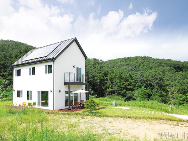 수도권의 혜택도 누리며 푸르른 자연과 함께할 수 있는 경기도 용인에서 하얀 목조주택 한 채를 마주했다. 1층의 공용 공간과 2층의 사적 공간을 완벽히 구현한 알찬 짜임이 돋보이는 언덕 위 하얀 집이다.취재 정사은 사진 변종석 ▲ 남사면 지붕에 태양광 패널을 설치해 화석연료 사용을 최소화 한 친환경 주택 60.69㎡(18.36평)의 넓지 않은 규모에 집을 지어 네 식구가 따로 또 같이 살아야 하는 미션. 디자이너는 목표를 위해 1층은 공용 공간으로, 2층은 사적 공간으로 나누었다. 거실과 주방이 하나가 되어 널찍한 평면을 갖는 1층에서 가족은 함께 식사를 하고, TV도 보며 여가를 즐긴다. 2층은 안방을 포함한 방 3개와 빨래를 말릴 수 있는 발코니를 압축적으로 마련했다. 각 방에는 지붕의 경사를 이용한 다락이 있어 여분의 공간을 얻을 수 있었다. 얼핏 평범하게 들릴 수도 있지만, 두 아이가 있는 4인 가정에는 넘치지도 모자라지도 않은 알찬 구성이다. 많은 사람들의 공통적인 행동 패턴을 분석하여 실을 구성한 아파트의 효율적인 평면 설계 방식과 통하는 맥락이다. ▲ 자연과 어우러진 집의 풍경 ▲ 계단 밑을 책장과 창고로 멋스럽게 활용했다. 하지만 이곳에는 아파트에서는 결코 누릴 수 없는 이점들이 있다. 단순한 평면이 답답해 보이지 않게 층고를 2,800㎜로 높여 개방감을 더했고, 아이들이 언제든 마당으로 내달릴 수 있게 거실 전면 창은 슬라이딩 프레임을 썼다. 데크도 마련해 정원과의 전이공간을 만드는 것도 잊지 않았다. 건축주의 필요에 따라 어닝을 설치할 수 있도록 처마 밑 공간을 마련해두는 섬세함도 보인다. 박공은 목조주택에서 가장 권장할 만한 지붕 형태로써 자연스레 이 다락공간을 수반한다. 무엇보다 2층의 다락공간은 어린 시절 누구나 가지길 소원하는 비밀공간이다. 세담주택건설의 한효민 대표는 100여건이 넘는 목조주택 현장에서의 경험을 바탕으로 설계와 시공의 디테일한 부분에 참여했다. 본인도 주택에 살며 아이를 키우는 부모로서 설계와 시공의 신중함을 내비친 그의 말을 증명이라도 하듯 시공이 꼼꼼하다. 특히 지붕설계에서 경사각을 43°로 다소 가파르게 세워 다락의 층고를 실사용이 가능한 수준으로 높게 구현했다. 지붕은 그라스울 R30으로 단열하고, 방수처리 또한 꼼꼼히 했다. ▲ 11자 배치로 명료하게 짜인 주방과 현관부 ▲ 지붕 경사각을 높여 다락을 유용하게 쓰도록 했다. ▲ 아이들 방의 2배 면적을 할애한 안방. 이곳에도 널찍한 다락이 있다. ▲ 2층 계단과 복도. 미니 발코니는 빨래를 너는 곳으로 사용된다. ▲ 북쪽으로 난 천창에서는 하루 종일 은은한 간접광이 들어 실내를 밝힌다. 평면이 복잡해질수록 공기 순환과 에너지 효율에는 취약해진다. 집의 기본 디자인은 단조롭다 싶은 박스 모양이지만, 이는 냉·난방에 가장 유리한 형태다. 남쪽으로 크게 난 창은 여름철에는 낮은 입사각으로 볕을 조금만 받아들이고 겨울철에는 깊게 받아들일 수 있는 배치로 건물의 에너지 절약에 도움을 준다. 등은 모두 LED를 사용해 전기에너지 사용을 최소화했고, 벽체 단열은 충진형 그라스울을 택했다. 도시가스가 아직 들어오지 않는 지역이기에 모든 에너지원을 LPG로 충당해야 하는 상황을 고려해 지붕 남사면에 태양광설비를 설치해 전기로 모든 동력이 작동하게끔 했는데, 전기 사용량이 큰 조리기구도 가스레인지 대신 인덕션을 설치했다. 태양광 집열판으로 들어온 에너지는 실시간 수치로 계량되어 코맥스社 스마트홈네트워크 화면에 송출된다. 받아들인 태양광이 얼마큼의 전기로 환산되는지, 그리고 현재 사용 중인 전기가 몇 kw인지 등 주택 에너지에 관한 정보를 집 안에서 받아볼 수 있어 에너지 관리가 쉽다. HOUSE PLAN 대지위치 : 경기도 용인시 대지면적 : 304㎡(91.96평) 건물규모 : 지상 2층, 다락방 건축면적 : 60.69㎡(18.36평) 연면적 : 147.42㎡(44.59평 다락 포함) 건폐율 : 19.96% 용적률 : 48.49% 주차대수 : 1대 최고높이 : 8.95m 공법 : 기초 - 혼합매트기초 / 지상 - 경량목구조 구조재 북미산 SPF 2X4, 2X6, 2X8, 2X10, 2X12 지붕재 : JR 강판 단열재 : 크나우프 에코필+에코배트 외벽마감재 : 드라이비트 창호재 : 엔썸 독일식 커멀링 시스템 창호 계획설계 및 시공 : 세담주택건설 031-336-1547, www.sedam.co.kr실시설계 : 우림건축사사무소 INTERIOR SOURCES 내벽 마감 : LG DID실크벽지, 무지벽지 바닥재 : LG 지아마루 욕실 및 주방 타일 : 수입타일 수전 등 욕실기기 : 대림위생기구, 아메리칸스탠다드 조명 : LED 매입등 계단재 : 오크 계단재 현관문 : 독일식 커멀링 시스템 현관문 방문 : 영림도어, 슬라이딩도어 자동멈춤철물 데크재 : 방부목 22㎜ ※ 월간 <전원속의 내집> www.uujj.co.kr 본 콘텐츠의 저작권은 (주)주택문화사에 있으며, 이를 무단 이용하는 경우 저작권법 등에 따라 법적책임을 질 수 있습니다.