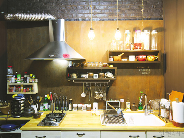 원룸에서 시작한 김용환 씨의 주방 살림은 다세대 주택과 아파트를 거쳐 이곳 퇴촌의 한 아늑한 시골마을에 최종 안착했다. 1년에 걸쳐 하나씩 더해져가는 공간. 우리네 시골마을에서 흔히 볼 수 있는 평지붕 빨간 벽돌집을 노크해보자. 취재 정사은사진 변종석 ▲ 100% 수작업으로 탄생한 부엌의 모습. 싱크대와 조리대 역시 직접 만들었다. 경기도 광주 퇴촌, 빨간 벽돌을 쌓아 만든 주택은 여타 시골집과 마찬가지로 창고 한 채를 옆에 끼고 있었다. 집주인은 부모님이 살고 계신 본채와 창고 사이, 폭 2.5m의 ‘ㄴ’자 형 공간을 개조해 ‘쓸 만한 공간’으로 만들었다. 이곳은 「나물이네 매일밥상」의 저자로 유명한 김용환 씨의 전원주택이다. 목수이자 농부, 그리고 베테랑 요리사까지. 김용환 씨는 달고 있는 명함만 해도 서너 가지가 너끈히 넘는다. 2010년 부모님이 계신 퇴촌의 전원주택으로 거처를 옮긴 후 뭐든지 직접 만들기를 3년. 서당개 3년이면 풍월을 읊는다고 하는데, 주택생활 3년차인 김용환 씨 또한 여느 목수 부럽지 않은 목공 실력을 자랑한다. 목공뿐만이 아니다. 마당의 배수로도 직접 만들고 잔디까지 손수 깔았다니, Home DIY를 온몸으로 보여주고 있음이다. “기초가 제일 중요해요.” 개조 노하우를 물어보는 질문에 원론적인 대답이 돌아온다. 하지만 그의 말을 듣다보면, 정말 모든 일에 기초가 가장 중요함을 알 수 있다. ‘유공관은 땅이 얼지않는 동결심도보다 더 파서 인입해야 하고, 데크에서 사용할 전기배선 또한 흙을 깔기 전에 미리 연결해야 한다. 또, 샌드위치 패널로 만든 외벽의 추가 단열공사는 반드시 합판 설치 이전에 해야 두 번 일하는 수고를 덜 수 있다’ 등 그가 쏟아내는 알짜배기 정보는 그야말로 경험을 통해 얻은 살아 있는 지식이다. 주택이 이렇게 살만한 공간으로 완성되기까지 걸린 시간은 1년여 남짓. 그에게 딱 맞는 맞춤형 공간은 이렇게 탄생했다. “이곳에선 심심할 틈이 없어요. 매일 마당을 돌보느라 분주하고, 만들고 고칠 것이 끝없이 생기거든요. 깔끔한 것을 좋아해서 하나씩 정돈되고 자리 잡아가는 재미에 푹 빠져 살고 있어요.” 손때 묻혀가며 하나씩 완성해가는 재미가 있는 주택. 군데군데 심어놓은 나무들이 그늘을 드리울 10년 후가 기대된다. ◀ 세면대와 수전을 제외하고는 모두 손수 제작해 완성한 화장실 ■ 재치 있는 ‘뒷간’ 글씨는 못 머리를 벽에 쳐서 만든 작품 ▶ 볼수록 기분 좋아지는 주방 입구 ▲ 색색의 그릇이 수납된 선반은 파티션 역할까지 담당한다. ◀ 야외용품의 필수품이 걸린 행거에도 그의 손길이 느껴진다. ■ 나물이네 주택 초입, 부모님이 머무는 공간 앞에는 예쁜 우체통이 손님을 맞는다. ▶ 가지런히 놓인 농기구들이 놓인 이곳 또한 직접 만든 처마다. ▲ 블랙 & 화이트로 꾸민 모던한 침실. 선명한 그린 컬러의 문이 포인트가 된다. ▲ 안채와 창고 사이 외부공간이었던 곳을 막아 현관과 거실로 만들었다. “얼마나 들었나?” 주방공사 : 약 150만원 정원(조경)공사 : 잔디 300만원 포크레인 :20만원 느티나무 :20만원 방부목 :50만원 시냇물에 있던 돌 공짜 ▲ 하나씩 사 모으다 보니 어느덧 벽면을 가득 채울 정도로 많아진 공구 “어떤 공구가 필요한가?” 개조를 시작한 초기단계, 목수분 하루 품값이 15만원인 것을 알고는 깜짝 놀랐다는 김용환 씨. 작업자의 공구를 유심히 살펴보고 메모해두었다가 검색해보니 개당 10만원 내외의 공구 7~8개만 있으면 무슨 작업이든 가능하다는 것을 알아챘다. 김용환 씨가 수납장을 털어 밝히는 Home DIY 필수 공구 8가지. 01 드릴 02 원형 스킬톱 03 직소기 04 각도 절단기 05 샌더 06 콤프레셔 07 타카 F30 08 타카 F60“어디어디 고쳤나?” ▶ 정원의 재탄생 깔려 있던 보도블록을 모두 걷어내고 수도관과 유공관을 보온담요로 싸 얼지 않는 1m 깊이에 다시 매설했다. 수도를 놓을 자리를 미리 정한 뒤 수도관도 확보하고, 중간중간 물이 빠질 맨홀도 두 군데 설치해, 이곳에 옥상에서 내려오는 배수로도 연결했다. 마지막으로 포크레인을 불러 구획해놓은 대로 흙을 배치한 후 텃밭을 제외한 부분에 잔디를 심었다. ▶ 현관문 리폼하기 창고와 본채 사이를 실내로 만드는 대공사 후, 철판 방화문과 샌드위치 패널 문 그리고 알루미늄 새시 문을 통일성 있게 리폼하는 작업이 이어졌다. 미리 잘라놓은 루버로 프레임을 만들고 안쪽을 하나씩 끼워가며 피스로 고정했다. 완성된 루버는 철판용 피스를 사용해 문에 부착했고 리폼이 힘든 안쪽 틀은 젯소를 바른 후 페인트를 칠해 마무리했다. ▶ 황토 모르타르 아궁이 만들기 수돗가 옆, 야외에서 쓸 수 있는 황토 아궁이를 만들었다. 버려진 돌을 모아 아궁이가 만들어질 단을 쌓고 황토 모르타르를 반죽해 찰흙놀이 하듯 덕지덕지 발라주었다. 이때, 뒤쪽에 연기가 빠져나갈 구멍을 만들어주어야 한다. 낡은 가마솥은 깨끗이 세척한 후 불에 올려 기름을 먹인 다음 사용했다. ▲ 잔디가 촘촘히 깔린 지난여름의 마당. 손수 만든 화덕과 벤치가 마당과 잘 어우러진다. ▲ 높인 화단과 잔디밭을 구분하는 토담도 김용환 씨가 직접 만들었다. “무슨 재료를 사용했나