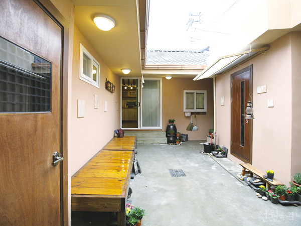 한옥은 안마당을 중심으로 건물이 둘러싸고 있는 개념으로 설계된 집이다. 그렇기에 한옥에서의 ‘마당’은 건물의 주인이라 해도 과언이 아니다. 대구의 한 오래된 주택에서 한옥의 마당, 그 잊혀진 정취를 찾아본다. 취재 정사은 사진 변종석 ▲ 두 달여의 공정을 거쳐 아늑하게 변신한 소담정 안마당 ▲ 오랜 기간 방치된 낡고 허름한 옛 한옥이전의 모습대구 시내, 좌우로 아파트단지가 빼곡히 들어서 있지만 이곳 대신동의 옛 주택단지는 80년대 모습 그대로 시간이 멈춘 듯하다. 낡은 한옥을 매입한 이채은 씨는 이곳을 개조해 활용해보자 마음먹는다. 워낙에 튼튼한 목재를 사용해서 구조적으로 보강할 곳은 없었지만, 대청마루와 툇마루 등 옛 생활 방식에서 현대적인 양식으로의 전환은 필수였다. 마루를 뜯어내 보일러 엑셀파이프 배관작업을 하고, 마당을 깊게 파 정화조와 오배수관을 인입했다. 낡은 기와를 걷어내고 새 기와를 얹고 여타 외관 치장작업까지, 전문가의 손을 빌려 주택의 성능부터 외형까지 모두 바꾸는 데 걸린 시간은 2달이었다. 디자이너 주은혜 실장은 “정화조를 묻는데 보름이나 걸렸다. 날씨가 추워서 공사가 더뎌졌다” 며 겨울 공사에 고생한 힘들었던 속내를 내비친다. 바뀐 집 마당에는 아무 때나 걸터앉을 수 있는 평상을 만들었다. 이곳에서 처마가 만들어내는 액자 속 하늘풍경을 감상할 수 있다. 더불어 황토색 드라이비트로 마감한 벽면에는 디자이너가 직접 만든 작품을 붙여 갤러리와 같은 느낌을 더했다. 전체적으로 여유가 느껴지는 공간 배치, 그리고 맷돌과 기와, 풍경 등 오래되고 편안한 소품들을 공수해 집 곳곳을 꾸민 덕에 사랑스러우면서도 멋스러운 작은 집이 탄생했다. 이 모든 개조 과정이 끝날 즈음 봄이 찾아 왔고 ‘함께 모여 소담소담 이야기 나눈다’ 이름 붙인 ‘소담정(笑談停)’이 드디어 공개되었다. “어떤 과정으로 진행되었나?” 뼈대만 남기고 대부분의 자재를 걷어낸 후 대청과 툇마루를 실내로 만들기 위해 10㎝ 두께의 샌드위치 패널로 벽을 설치했고, 정화조를 인입했다. 창호와 현관 모두 교체했으며, 실내는 석고보드 2겹과 합판으로 마감했다. 방뿐만 아니라 기존 대청마루 바닥도 낡은 목재를 걷어낸 후 엑셀파이프를 깔아 보일러를 설치했다. 현장에서 나오는 쓸 만한 목재는 모두 재활용해 평상과 문짝을 만들었다. 소담정 현판 또한 이것으로 만들었다. 지붕은 고기와를 걷어낸 다음 새로운 기와로 대치했고 건물 외벽은 황토 드라이비트로, 외관 담장은 연한 노란색 페인트로 마감했다. 집 기본 정보대지면적 : 123㎡(37.20평) 건축면적 : 43.14㎡(13.05평) 공법 : 전통 한옥식 중량목구조 벽체보강 : 샌드위치 패널 100T 단열재 : 비닐, 합판, 석고보드 2겹 외벽마감재 : 드라이비트 시공 : 아.름.다.운.집 주은혜 010-7472-2620 ◀ 옥상에서 내려다 본 아담한 안뜰 ▶ 마당에서 쓸 용수를 공급하는 수도▲ 옛날 기와와 조약돌, 고재로 만든 툇마루까지. 마당 이곳저곳에 옛 것의 정취가 가득하다. ▲ 사랑채 겸 다실로 탈바꿈한 외부 창고 1949년에 지어진 한옥의 기본 골조를 가려버리기엔 집의 상태와 구조가 너무도 훌륭했다는 주은혜 실장. 건축주와의 의논 끝에 한옥의 골조와 모양을 그대로 살리고 마당 또한 있는 그대로 두어 예스런 정취를 살리기로 결정했다. 또한, 걷어낸 대청마루의 고재(古材)를 활용해 소담정 명패와 옷걸이, 평상 등을 만들어 집안 곳곳 배치했으며, 낡은 문살도 그대로 살려 은은한 간접조명으로 변신시켰다. ◀ 실내에서 내다본 마당 모습 ▶ 샌드위치 패널로 벽을 만들어 복도공간이 생겼으며, 이곳은 각 실을 연결하는 통로로 쓰인다. ◀ 대청을 걷어내고 실내로 만들어 거실과 주방 공간으로 사용한다. ▶ 소담정의 가구와 배치는 디자이너가 손수 작업한 결과물이다. “얼마나 들었나?” 기초보강공사 : 1,000만원 구조보강공사 : 500만원 외장공사 : 100만원 단열공사 : 80만원 창호공사(도어포함) : 250만원 내장공사(벽지, 페인트 등) : 250만원 지붕공사: 400만원 설비(욕실, 배관, 보일러)공사: 1,000만원 총 비용: 3,500만원 ▲ 예스러운 가구로 포인트를 준 방▲ 독특한 문양의 세면대와 앤티크 수전 “무슨 재료를 사용했나?” 내벽 마감(벽지 또는 페인팅) : did 실크벽지 바닥재 : LG장판 욕실 및 주방 타일 : 수입 수전 등 욕실기기 : 수입 조명 : 수입조명 주방 가구 : 18㎜ 합판 2겹, 스크래치 강화나무 마감 현관문 : LG새시 방문 : 집에 어울리도록 미닫이로 자체 제작 붙박이장 : 고전장 데크재 : 대청마루 고재((古材) 지난 1월 완성된 소담정은 현재 이채은 씨가 운영하는 커튼 및 침구 업체 마이하우스의 별장 겸 손님용 사랑방으로 사용되고 있다. 평소에도 좋은 집 만들기에 대한 비전을 가지고 있기에, 차후 일반인에게도 하루쯤 묵을 수 있는 게스트하우스로 공개하고 싶다는 그녀다. 낡은 한옥을 개조해 살만한 집으로 만든 소담정. 이곳을 보고나니 ‘마당 있는 작은 집에서의 소박한 삶’을 실현하는 것이 그리 어려운 일은 아니라 여겨진다. 마이하우스 섬유도시 대구에서 시작된 마이하우스는 커튼과 침구 제작 및 온라인 유통 업