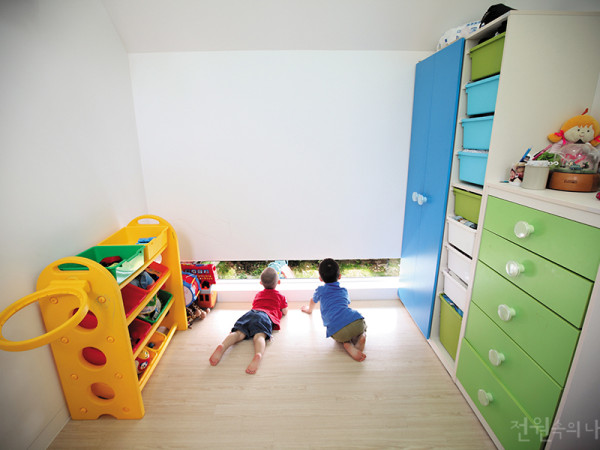 춘천의 한 주택단지. 멀리서도 눈에 띄는 주택 한 채가 있다. 집의 외벽에 걸린 ‘The Present of Heaven’이라는 글처럼 하늘이 준 선물, 두 아이를 위해 지어진 그 집을 만나본다. 취재 김연정 사진 변종석 ▲ 아이들이 마음껏 뛰놀 수 있는 잔디가 깔린 마당 평범하고 소박한 단독주택이 하나둘 모여 한적한 마을을 이루고 있는 이곳에, 독특한 외관의 집 한 채가 눈길을 끈다. 뾰족하게 경사진 지붕과 새하얀 외벽. 일반적인 주택의 모습과 사뭇 다른 이 집에는 젊은 부부와 7살, 3살의 두 아들이 살고 있다. 어린 아이가 있는 집이라면 누구나 꿈꿔보는 집짓기. 하지만, 주택의 로망을 실현하기에는 조금은 이르다 싶은 나이의 부부이기에 그들이 주택을 짓게 된 계기가 궁금해졌다. “제 또래 부부들이 다 그러하듯, 저희도 두 아이를 위해 결심하게 되었어요. 아이들이 흙을 만지고 뒹굴면서 마음껏 뛰놀며 지낼 수 있는 공간을 마련해주고 싶었죠.” 아이들을 위해 결정한 일이지만, 사실 부부는 이미 결혼 초부터 멋진 집에 대한 로망을 품었다. “2006년에 결혼하고, 둘이서 ‘Vision Board’라는 걸 만들었어요. 앞으로 꼭 이루고 싶은 일이나 바람을 나타낸 사진을 하나씩 붙여놓자는 거였죠. 그 후 7년이라는 시간이 지날 동안 까맣게 잊고 있었는데, 이번에 이사를 하면서 우연히 그 보드를 찾았어요. 먼지가 가득 쌓인 보드엔 멋진 전원주택 사진이 한 장 꽂혀 있었죠.” ▲ 45도 경사의 금속지붕과 화이트 스터코 외벽, 오비스기목재가 어우러져 간결하고 절제된 왼관을 완성했다. ◀ 지붕부터 대지까지 연결된 수직목재패널이 자연의 친근함을 느끼게 한다. ▶ 거실 앞 데크를 통해 아이들의 즐거운 놀이공간은 야외로도 이어진다. 처음 집을 짓겠다 했을 때, 부부의 용기를 높이 산 주변의 응원도 많았지만 왜 사서 고생을 하느냐, 그 돈으로 서울에 괜찮은 아파트를 사는 건 어떠냐는 등 탐탁지 않은 반응도 많았다. 하지만 가족의 삶에 꼭 맞는 집을 만들고 싶다는 부부의 의지를 꺾기에는 모두 역부족이었다. 2년간 춘천의 아파트에 거주하며 괜찮은 땅, 괜찮은 동네를 꼼꼼하게 탐색했다. 그러나 막상 구입할 때는 오히려 시세만 따져 덥석 사버렸다고 한다. “집짓기의 시작은 토지 구입인가 봐요. 땅을 사놓고 보니 막막하더군요. 당최 이 땅을 어찌해야 할지 감을 잡을 수가 없었죠.” 하지만 그렇게 고민하기도 잠시, 새로운 일에 겁먹지 않는 성격 좋은 부부는 ‘한번 해보자’며 다시 의기투합했다. 그리고 얼마 지나지 않아 설계를 해줄 건축가를 찾았고, 한 통의 전화로 춘천에서의 첫 미팅이 이루어졌다. “춘천에 ‘스무숲’이라는 거리가 있어요. 같은 이름의 건축사사무소길래, 직감으로 분명 소장님이 춘천 출신일 것 같았어요. 이곳 출신이 이 지역을 가장 잘 이해하리라는 건 당연한 일이죠. 무엇보다 소장님과 집에 대한 이야기를 나누고 나니 제가 떠올렸던 것과 공유되는 부분도 많았고요.” 운이 좋았던 걸까. 부부는 집을 지어줄 건축가를 단번에 만났고, 일은 일사천리로 진행되었다. 가족은 도화지에 ‘우리가 바라는 집’이란 제목의 글을 색연필로 적어 건축가에게 건넸다. 건축가에게 특별히 많은 걸 요구하지도 않았다. 아이들을 위해 짓는 집인 만큼 그저 ‘아이가 즐거울 수 있는 집’ 그리고 ‘밝고 따뜻한 느낌이 드는 집’이면 좋겠다는 바람이 전부였다.▲ 주방에는 수납이 가능한 낮은 평상을 놓아 엄마와 아이들이 함께 할 수 있는 공간을 마련했다. ▲ 2층 부부침실에는 주방이 내려다보이는 통창을 설치해 가족간의 소통을 이끌어 냈다. ▲ 아이들이 좋아하는 계단 옆 미끄럼틀 공간 ▲ 전면창을 통해 늘 밝은 햇살이 집안을 비춰준다. 주택의 외관은 화이트 스타코플렉스와 오비스기목재, 금속지붕으로 간결하고 절제된 마감을 택했다. 또한 건물 측면의 지붕부터 대지레벨까지 연결된 3층 높이의 수직목재패널은 자연소재의 친근함과 동시에 건물을 지탱하는 강한 힘마저 느껴진다. 잔디를 심은 아담한 마당에는 아이들이 맨발로 뛰어다닐 수 있는 넓은 데크와 모래놀이공간을 두었다. 덕분에 두 아이는 시시때때로 마당에 나가 놀고, 날씨가 좋을 때는 풀장을 만들어서 물놀이도 하며 즐긴다. 외부처럼 새하얀 내부는 가족 네 명의 생활 패턴에 맞춰 다양한 층고와 동선을 보여준다. 작은 데크 공간을 지나 현관문을 들어서면 가장 먼저 마주하는 공간은 거실과 주방. 모두 통창을 시공해 마당을 향해 열려 있다. 특히 주방에는 요리하는 엄마와 아이들이 함께 할 수 있는 낮은 평상 공간을 두어 가족 간의 소통을 이끌어냈다. 높은 층고의 2층으로 올라가면 부부침실과 아이방, 드레스룸, 욕실 등 가족의 사적인 공간이 배치되어 있다. 공간의 효율성을 위해 주방 평상 아래 서랍, 계단 하부 창고 등 수납 가능한 장소를 곳곳에 두었고, 문은 대부분 여닫이 대신 슬라이딩 도어를 택했다. 천창을 통해 쏟아지는 햇살은 집안을 더욱 환하게 밝혀준다. 또한 지붕과 벽체에 친환경 인슐레이션과 스티로폼 등으로 단열을 보강한 것은 에너지 효율까지 신경 쓴 건축가의 배려가 돋보이는 부분이다. ‘아