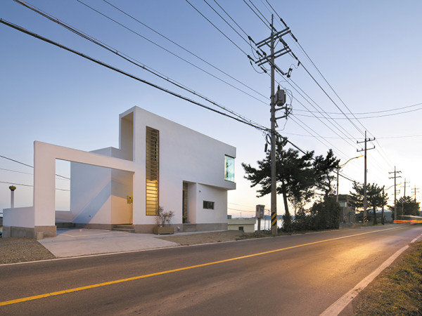 오랫동안 바다가 보이는 국도변에 있었던 작은 집이 시간이 흘러 도로 확장으로 집과 땅이 반쪽으로 잘려 나갈 상황이었다. 집주인은 넉넉하지 못한 경제적 형편으로, 생활터전을 버리고 새로운 곳으로 이사를 갈 수도 없었다. 프로젝트의 시작은 ‘이 잘려나간 집터에 보상받은 금액만으로 새로 집을 지을 수 있을까?’ 하는 걱정과 의문에서 출발하였다.취재 전원속의 내집 편집부 사진 윤준환 홀로 거주하는 이용자의 생활패턴을 담아내면서 반쪽이 되어버린 집에서 과거 온전한 집에서 누리던 것보다 더 풍족한 공간을 만들어주는 것이 목표가 되었다. 그러기 위해서 외적으로는 반쪽이 아닌 집으로 보일 수 있도록 이미지를 만들고자 하였다. 내적으로는 기존의 쓸모없던 공간을 제거하고, 좁지만 라이프스타일에 따라 다양한 상황과 기능을 만족시킬 수 있는 공간을 제공하고자 했다. 반쪽집의 건축적 의도는 2011년 공간실험전<사진 1>에서 시작된 생각에서 출발한다. 전시품을 보면 필자가 디자인한 건축물의 창과 외부의 이미지를 전시장 벽면으로 끌어오고, 그 앞의 공간에 붙어 있는 프레임(Frame)과 들떠 있는 프레임을 설치하여 공간적 이미지를 만들었다. 이 작품은 관람객이 보는 시각에 따라 프레임들이 겹쳐지기도 하고 분리되기도 하여 다양한 이미지로 변한다. 보이는 프레임에 더해 프레임 사이의 보이지 않았던 공간까지 드러나면서 2차원적이었던 프레임이 3차원적인 공간으로 확장되는 작업이었다. 그 경험을 통해서 관람객들은 공간의 존재를 새삼 느끼게 된다. 건축에서 일반적인 스킨(Skin)은 구조체의 외부를 감싸고 있는 표면으로 피복이나 마감재를 의미하지만, 필자는 넓은 의미의 용어로 사용하고자 한다. 벽과 벽 사이의 구조체와 피복된 것들(물질적)뿐 아니라 사물이나 이미지들 사이의 경계에 존재하는 모든 것들(물질과 비물질)을 말한다. 그리고 표면을 넘어선 경계의 의미로서 하늘이나 자연과 건축물 사이, 땅과 건축물 사이, 공간과 공간 사이, 공간과 물질 사이, 이미지와 실제 사이에 존재하는 경계를 스킨으로 확장하여 사용한다. 이러한 3차원적인 스킨은 건축물의 표면을 넘어서 빛과 결합하여, 공간, 볼륨, 땅, 도시, 도로의 스킨으로써 이미지를 만들어낸다. 이 반쪽집은 외부의 어느 곳에서 보아도 그러한 스킨의 조작을 통해서 이미지를 완성하려고 하였다. 다이어그램에서 알 수 있듯이 땅의 스킨을 외곽에 두면서 강조하고, 그 안에 볼륨의 스킨과 공간의 스킨이 있음을 드러내려고 했다. 즉 깊이에 따라 스킨들을 나열하고 비틀어서 시각적으로 이미지화하고 빛과 결합될 때 최종의 형태가 완성되도록 하였다. 또한 도로에서의 잘린 스킨을 드러내어 반쪽집임을 상징화하려고 하였다<다이어그램 1>. 그래서 반쪽집에서 스킨의 조작은 때로는 영역을 한정하고, 때로는 주변의 콘텍스트와 관계를 맺으며, 때로는 조형적인 이미지를 제공한다. 반쪽집의 내부공간은 우선적으로 이용자의 움직임에 따른 시각적 확장을 위해 창을 내고, 그 창을 통해서 과거 온전했던 집에서 누리던 것보다 넓은 공간감을 제공하였다. 이 창들을 통해서 이웃과 주변의 나무, 바다, 도로, 그리고 새로운 조형의 이미지와 소통할 수 있도록 했다<다이어그램 2>. 즉 이 반쪽집을 둘러보면 주변의 모든 풍광을 바라보면서 각 장면마다의 재미를 찾을 수 있다.좁은 내부 공간임에도 이용자의 다양한 라이프스타일을 담아내고자 했다. 법적인 주차장은 평소에는 마당으로 사용하기 위해 담장의 구조물을 건축물과 일체화시켜 땅의 스킨으로 인식하게 하였고, 자녀들이 방문할 땐 주차장으로 사용할 수 있게 했다. 1층은 평소에 거실과 주방의 기능을 동시에 만족시키며, 자녀들이 오면 또 하나의 방으로 활용할 수 있다. 2층은 한 공간으로 통합하여 평소에는 거주자의 작업실로 쓰고, 게스트룸과 자녀들의 침실을 겸할 수 있도록 해 절대적으로 부족한 공간의 대안으로 제공하였다. 특히 2층의 테라스는 게스트나 자녀들이 방문하였을 때 좋은 풍광을 제공하는 장소로 기억될 것이다. <글 _ 오신욱> HOUSE PLAN 대지위치 : 부산광역시 기장군 대지면적 : 93.00㎡(28.18평) 건물규모 : 지상 2층 건축면적 : 53.63㎡(16.25평) 연면적 : 75.46㎡(22.86평) 건폐율 : 57.67% 용적률 : 81.14% 주차대수 : 1대 최고높이 : 6.05m 구조재 콘크리트 : 단열재 발포폴리스티렌보온판(비드법 1호 : T80, T65, T155) 외벽마감재 : 테라코트 슈퍼화인 창호재 남성 복합창호 내벽마감재 : 애쉬우드 판재 및 벽지 바닥재 : 온돌마루 설계 : 건축사사무소 라움(하정운, 김대원) 051-817-1407 시공 : 태백건설 김태홍INTERIOR SOURCES 벽지 : 대동 실크벽지 페인트 : VP 수전 등 욕실기기 : 계림 바닥재 : 구정온돌마루(화이트오크) 주방기기 : 주문제작 계단재 : 화이트오크솔리드 벽체 : 애쉬우드 판재 방문 : 제작(애쉬우드 무늬목) 건축가 오신욱 동아대학교 건축공학과를 졸업하고 동대학원에서 [건축설계과정에서 스키마(schema)의 의미와 작용에 관한 연구] 논문으로 박사학위를 받았다. 2001년 건축가 노정민과 라움(Raum)을 설립하여 부산외국어대학교 마스터플랜 현상설계에 당