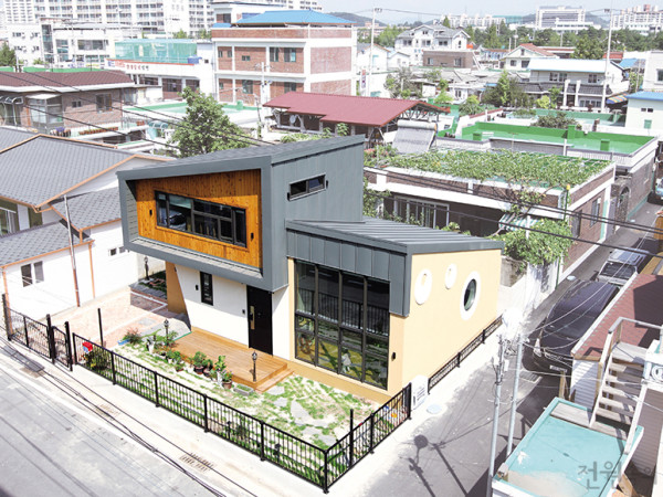 설계는 대지와 도시의 맥락을 읽는 데서부터 시작된다. 건축가는 오래된 동네에 신선한 바람을 불러일으킬 만한 ‘이슈’를 만들고자 했다. 새로운 거리 탄생의 시발점이 되는 이 신선한 건물의 등장 덕분에 마을 전체는 생동감을 얻었다. 취재 정사은 사진 변종석 ▲ 오래된 교현동 주택단지에자리한 조형미 넘치는 주택의 외관 ▲ 아이들의 놀이공간으로 활용되는 거실 내부. 한쪽 벽면을 가득 채운 책장은 목수가 정성껏 제작했다. “하루라도 빨리 아이들에게 추억이 될 집을 지어주고 싶었거든요” 아파트에서 벗어나 주택을 짓게 된 경위를 물어보는 질문에 1초의 망설임도 없이 이런 대답이 돌아왔다. 건축주 곽우영, 김정화 씨 부부 옆에는 큰 딸 도희와 동생 도일이가 눈을 동그랗게 뜨고 부부를 바라보고 있다. 아이들을 바라보는 부모의 눈빛에 사랑스러움이 가득하다. 낡은 도심지에 불어오는 새로운 바람 오래 전부터 주택 건축을 마음먹은 이들 부부는 적당한 땅이 나오길 기다렸다. 정해진 예산 안에서 지혜롭게 지출해야 했기에, 과한 욕심은 금물이었다. 오랜 기다림 끝에 이곳 충주 교현동의 낡은 주택단지 안에 40년 된 오래된 주택을 매입하는데 성공. 이곳은 충주의 노후한 주택가로서 새로운 정비의 바람이 불어오고 있는 동네였다. 오래된 집들이 많았지만, 여기저기 리모델링 혹은 재건축의 움직임이 감지되고 있었고 입지 또한 훌륭해 근처 체육공원과 충주천, 분수공원 등 근린생활시설과도 가까운 알짜배기 땅이었다. 대지 면적이 비슷하고 도심에서의 접근성과 도로 폭 등 상태가 양호해, 리뉴얼된다면 충주의 이름난 단독주택 주거단지가 될 것으로 보였다. 건축주는 외관이나 스펙에 집중하기보다 삶을 담을 공간을 만드는 것에 중점을 두었다. 애초부터 그가 생각한 ‘집’의 이미지는 거창한 것이 아니었다. 충분한 채광과 복층 구조, 그리고 아이들과 함께 가꾸고 뛰어 놀 마당. 어쩌면 삶을 담는다는 ‘거주’의 본질을 가장 정확하게 꿰고 있었던 것인지도 모른다.▲ 아기자기한 조형미가 돋보이는 디자인 하우스 ▲ 툇마루를 변형한 데크는 텃밭에서 놀고 쉬는데 넉넉한 쉼자리가 되어준다. 외관은 마을 내 단연 눈에 띄는 형상이다. 사각형의 저층부로 안정적인 느낌을 주고, 뾰족한 삼각형의 차용으로 파사드에 표정을 입혔다. 외부입면의 원형 창과 사선의 사용, 그리고 산뜻한 컬러매치는 ‘홈스타일토토’만의 디자인 콘셉트이다. 측면부의 사선과 원형 창의 조합은 느슨하고 지루하기 쉬운 외관에 재미를 더한다. 버려진 곳 하나 없이 역동감이 느껴지는 표피, 어느 곳에서 바라보아도 한번쯤 쳐다보게 되는 외관은 그 자체만으로도 매력적이다. 홈스타일토토의 임병훈 소장은 이렇게 설명한다. “사람도 매력이 있어야지 한 번 더 눈길이 가듯이, 집도 마찬가지죠. 누군가 걸어가다 쳐다보고는 ‘나도 저런 집에 살고 싶다!’는 마음이 드는 집이라면 좋겠어요.” ▲ 싱크와 수전을 아일랜드로 구성해 거실에서 놀고 있는 아이들을 지켜보며 요리할 수 있는 주방공간을 구현했고, 한쪽에 평상을 설치해 가족들이 옹기종기 모여앉아 식사하고 담소를 나누는 공간으로 활용했다. 건강한 주거환경이 만드는 내 아이의 밝은 미래 건축주인 곽우영 씨 가족도 한 때 아파트에 산 적이 있다. 아파트에 살 때는 아이와 놀이터 한번 가려면, 도구와 준비물을 챙겨서 아파트 현관문을 지나 엘리베이터를 기다려 타고, 내려서 단지를 빙 돌아야 했다. 바로 집 앞이 놀이터임에도 불구하고 아이를 혼자 내보낼 수 없어 마음처럼 자주 나가주지도 못했다. 하지만 지금은 다르다. 새로 지은 주택으로 이사 오고 근 며칠 동안 세 살배기 도희는 계속 계단을 오르락내리락했다. 집 밖에만 있던 계단이 집 안으로 들어와 있는 것이 신기했던 모양이다. 놀고 싶을 때면 언제든 쪼르르 마당 한켠, 아빠가 만들어준 모래놀이터로 달려간다. 주차장의 선 그리기 작업도 아이에겐 아빠와 함께하는 ‘놀이’였다. 집 우측 자그마한 텃밭은 네 식구가 함께 심은 쪽파와 상추, 허브가 무럭무럭 자라고 있다. 아파트와는 다른 생활이 펼쳐지고 있다. 이러한 환경에서 커나갈 아이의 인성이 이전과는 같지 않을 것은 당연지사. 건축주 부부는 새로 바뀐 주거 환경이 아이의 삶과 미래를 바꿀 것이라 확신했다.▲ 현관으로 들어서면 우측에 거실과 주방이 넓게 펼쳐져 있다. 벽면의 책장은 건축주의 아이디어다. ▲ 1층 부모의 손이 닿는 곳에 나란히 자리한 해님방과 달님방. 지금은 두 공간 사이에 오픈된 개구부를 두어 자유로이 드나들 수 있도록 조성했고, 추후 아이들이 자랐을 때 간단한 공사를 거쳐 분리할 예정이다. 내부공간의 선택과 집중 네 식구에게 필요한 3개의 방과 2개의 화장실, 그리고 너른 거실과 주방이 전용면적 95.17㎡ 안에 모두 담길 수 있었던 것은 선택과 집중이 확실한 공간구성 덕분이다. 아이들과 함께 생활하는 거실과 주방에 집중해 이 공간을 넓게 내었고, 상대적으로 사용이 적은 방과 화장실 등은 필요를 충족시킬 만큼의 면적만으로 구성했다. 이렇게 스케일의 완급을 조절한 덕분에 주