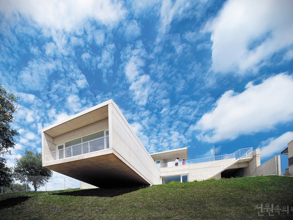 정형화된 모습을 벗어나 실험적인 시도가 엿보이는 주택을 만났다. 생각의 틀을 깬 자연을 향해 뻗은 거대한 매스, 그 속에 숨 쉬는 자유로움이 전해져오는 듯하다. 취재 김연정 사진 Cesar San Millan 집에 대한 새로운 시선 프로젝트에 대한 계획은 ‘경사면’이라는 필지조건에서부터 시작한다. 주택은 진입로보다도 낮은 높이에 놓여 시각적 효과가 줄어드는 동시에, 하나의 강력한 캔틸레버(Cantilever) 매스가 후면 돌출되어 자연과 공존한다. 덕분에 환경에 대한 불필요한 개입은 최소화 되었고(필지점유율 9%), 이는 소형 진입로 시설과 차량보호구역을 갖춘 옥상정원으로 완성되었다. 설비 매립과 옥상녹화, 바이오매스를 활용한 재생에너지 사용과 물 절약 방안을 도입한 결과, 에너지 소비를 크게 줄이는 효과를 가져올 수 있었다. 매스가 교차하는 빈 공간에는 수직계단이 놓여 굴뚝과 같은 역할을 한다. 또한 주택은 남향이라는 배치조건을 갖추었기 때문에, 모든 시야는 남쪽을 향해 열리고 북쪽으로는 겨울철 찬바람을 막을 수 있도록 배려하였다. 마지막으로 주택의 모든 구조는 철근콘크리트조로 시공해 내구성을 높였다. <글·Roberto Ercilla>HOUSE PLAN 대지위치 : Etura, Alava, Spain건축면적 : 218m²환경관리 : Mamen Orbananos, Amaia Vasallo개발 : Jose Maria Salazar기술 : Amaia Vasallo 시공 : Zikotz협력 : Eduardo Martin(Structural work), Inaki Ciganda, Raquel Ochoa, Mikel Sanz(Architect)설계 : Roberto Ercilla www.robertoercilla.com 건축가 Roberto Ercilla 바르셀로나 Escuela Tecnica Superior de Arquitectura에서 건축학을 전공했다. 1978년 스페인 북부에 위치한 비토리아(Vitoria)에 Roberto Ercilla Arquitectura를 개소해, 현재까지 운영해 오고 있다. Escuela Superior de Arquitectura of Navarra에서 교수를 역임하였으며, 리얼리즘을 기반으로 한 실용적인 프로젝트 작업에 주력하고 있다. ※ 월간 <전원속의 내집> www.uujj.co.kr 본 콘텐츠의 저작권은 (주)주택문화사에 있으며, 이를 무단 이용하는 경우 저작권법 등에 따라 법적책임을 질 수 있습니다.