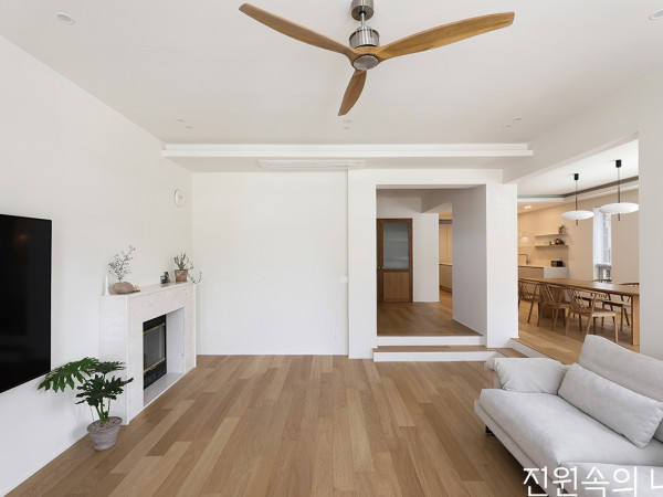 군더더기 없이 편안하고 아늑한 집이길.알차게 꾸미고 감춰 깔끔하게 정돈된 놀라운 집이길.심플하지만 감각적인, 스튜디오 하우스가 완성됐다.조용한 주택단지, 한창 에너지 넘치는 귀여운 5살 쌍둥이 형제가 사는 곳. 아파트에서의 삶이란 몇 층에 거주하든지 층간소음에서 자유로울 수 없는 일이다. 조용히 해야 하는 아이나, 그렇게 하도록 잔소리해야 하는 부모나 피곤하긴 마찬가지. 부부는 두 아이에게 집이 놀이터 마냥 즐거운 공간으로 기억되길 바라며, 주택으로의 이사를 결심했다. 집을 새로 짓기보단 기존에 형성된 주택단지 내에서 가족에게 적합한 집을 찾아 나섰다.현관을 넓혀 아이들이 앉아서 신발을 신을 수 있도록 벤치 수납장을 추가하고, 벽면에는 마스크나 가방 등을 걸어둘 수 있도록 우드 후크를 설치했다. 원목으로 제작한 중문과 비대칭형 거울이 공간의 포인트가 되어준다.거실은 단차로 인해 다른 공간과 분리되는 구조다. 이곳에서 아이들은 앉아서 책을 읽기도 하고 뛰어다니거나 기어다니며 놀이터 마냥 신나는 시간을 보내곤 한다.처음 계약한 집이 취소되고, 또 다른 주택을 계약하기까지 마음고생이 있긴 했지만, 오히려 새로 찾은 목조주택은 가족들의 마음에 쏙 들었다. 볕이 잘 드는 넓은 거실과 주방 그리고 아이들이 오르내리며 깔깔거리기 좋은 계단이 있었고, 유아복 쇼핑몰을 운영하고 있는 아내의 작업실까지 별도로 배치할 수 있는 곳이었다.(위, 아래) 단출하게 구성한 거실. 우드 톤의 실링팬과 천연대리석으로 새롭게 디자인한 기존 벽난로가 분위기를 한결 살려준다. 특히 벽난로는 추운 겨울 거실을 따뜻하게 사용할 수 있어 더욱 실용적이다.부부는 가족의 새로운 보금자리가 따스하고 부드러운 분위기의 집이길 바랐다. 하루 중 가장 오랜 시간을 보내는 곳이기에, 아이들이 집의 온기를 충분히 받아 온화하고 밝은 아이로 자라길 바라는 마음이 아니었을까. 이러한 마음을 담아 디자인하다 보니 자연스레 곳곳이 포토존인 스튜디오 같은 공간이 연출됐다. 편안한 내 집에서 상품 촬영도 할 수 있게 되니, 그야말로 일석이조다.PLAN하지만 집이 완성되기까지 순조롭지만은 않았다. 철거를 하는 도중 곳곳에서 문제점이 드러났다. 가장 큰 문제는 1, 2층 사이 천장 누수. 욕실의 수전과 배수 위치 이동 또한 만만치가 않았다. 겉으로 드러나진 않지만 누수와 설비 공사는 가장 중요한 부분이기에, 큰 골조는 살리되 목공 보강과 설비 시공으로 기본에 충실하고자 했다. 예산이 이 부분에 집중되면서 인테리어는 잘 보이고 자주 사용하는 공간의 자재와 디테일에 좀 더 힘을 주는 방식으로 진행됐다.(위, 아래) 거실과 현관이 한눈에 보이는 다이닝룸. 우드와 화이트의 조화가 돋보이는 공간이다. 철거가 불가능한 벽면에는 밝은 컬러의 액자로 포인트를 주고 모던한 스타일의 화이트 조명으로 공간을 심플하게 정리했다.스튜디오33의 현정호 대표는 가정집이지만 제품 촬영 시 스튜디오 역할을 겸할 수 있도록 공간을 구상했다. 그러기 위해서 무엇보다 수납공간 확보와 포인트 요소에 집중했다.“두 아이의 장난감과 살림살이를 말끔하게 정리할 수 있도록 수납에 주력하되, 공간에 재미를 더하기 위해 석재나 원목, 거울, 조명 등 포인트 요소들을 가미하기로 했습니다.”POINTPOINT 1_가전제품을 모두 숨긴 팬트리군더더기 없이 심플한 화이트 주방을 실현시켜 준 팬트리 공간. 키큰장으로 보이는 가구의 문을 열면 주방의 모든 가전제품들이 숨겨져 있다.POINT 2_벽면을 활용한 와인 수납장철거가 불가능한 벽면의 빈 공간을 활용해 와인 수납장을 제작했다. 수납과 디자인 모두 만족시킨 덕분에 부부가 가장 애용하는 공간이 됐다.POINT 3_리디자인으로 재탄생한 벽난로따스한 컬러의 심플한 디자인으로 거실 분위기를 주도하는 아이템. 기존의 낡은 대리석 벽난로를 철거하지 않고 재활용해 만들었다.우선, 공간을 최대한 활용하기 위해 불필요한 가벽은 모두 철거하기로 했다. 덕분에 비효율적인 동선들도 덩달아 정리할 수 있었다. 1층은 가족이 가장 많은 시간을 보낼 거실과 주방, 다이닝룸이 배치됐다. 단차로 인해 주방과 거실이 분리되는 구조로, 한층 아래의 거실은 구조 덕분에 더욱 아늑하게 느껴진다. 높낮이를 달리한 바닥을 그대로 유지한 건 아이들이 기어오르거나 뛰어다니면서 놀 수 있도록 한 부부의 선물이기도 하다. 거실은 특별한 가구 없이도 천장의 실링팬과 벽난로로 인해 분위기가 한층 살아난다. 기존에 매립되어 있던 낡은 벽난로를 철거하지 않고, 천연대리석으로 새롭게 디자인해 디스플레이 겸용으로 사용할 수 있도록 한 것. 공간의 포인트로 자리 잡은 따스한 분위기의 벽난로 덕에 다가올 겨울 풍경을 기대하는 중이다.디자인을 해치는 덩치 큰 가전은 모조리 주방 안쪽으로 숨기고 깔끔한 모습으로 완성했다.좌측으로는 식료품이 보관된 팬트리가 배치되어 있어, 넉넉하고 완벽한 수납에 동선 또한 편리하다.넉넉한 수납과 적절한 공간 분할로 가장 만족도가 높은 공간은 주방이다. 상부장 대신 선반을 설치해 개방감을 한껏 살린 깔끔한 주방은 다