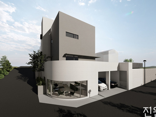 HOUSE VIEW공장지대와 고속도로 사이에서 유려한 곡선이 빛을 낸다. 땅의 모양을 닮은 집은 3대가 뿌리 내릴 곳이다.삼각형 모양의 대지를 닮은 집은 마당을 감싸 안은 듯 유려한 곡선으로 흐른다. 마당에는 작은 산책로가 있다.대지는 경북 칠곡군 동명면 송산리에 있다. 이 지역은 준주거지역으로 대지 주변은 공장으로 둘러싸여 있고, 또 옆으로는 중앙고속도로가 지나가고 있었다. 공장들과 계획 대지 반대편으로 산과 들이 아름답게 펼쳐져 있어 상반된 분위기의 것들이 대치하고 있는 모양이었다. 이처럼 독특한 입지 조건이 초기 계획에 영감을 줬다. 무엇보다 공장으로 둘러싸인 계획 대지에 전혀 어울리지 않는 단독주택을 계획하는 것이 신선하게 다가왔다. 그래서 주변과 조화로운 건물 대신 공장건물들로 이뤄진 보편적 질서 위에 활력을 주는 건물을 만들고자 계획했다.공장지대에 새로운 활력을 불어넣는 집.대지는 남쪽은 넓었지만, 북쪽으로 갈수록 좁아지는 삼각형 형태였다. 주택부지로 건물을 앉힐 수 있는 공간이 한정적이기도 했고, 법적으로 건물을 놓을 영역을 설정하고 요구하는 프로그램을 대지 위에 넣어보니 여유 공간이 없었다. 그래서 마당을 크게 만들기보다는 작은 마당을 여러 개로 분산해서 다양한 공간에서 마당을 느낄 수 있게 했다. 남쪽 주 출입 마당과 북쪽 도로에서 들어오는 부 출입 마당, 2층의 자연으로 열린 좁은 마당까지 마당을 3개 계획했다. 마당으로 인해 자리를 찾지 못한 내부 프로그램은 2층으로 옮겨졌다.HOUSE PLAN대지위치 ≫ 경상북도 칠곡군대지면적 ≫ 421㎡(127.35평)건물규모 ≫ 지상 2층거주인원 ≫ 6명(부부, 아들 부부, 자녀2)건축면적 ≫ 125.08㎡(37.83평)연면적 ≫ 196.1㎡(59.32평)건폐율≫ 29.71%용적률 ≫ 46.57%주차대수 ≫ 1대최고높이 ≫ 7.2m구조 ≫ 기초 - 콘크리트 매트기초 / 지상 – 철근콘크리트단열재 ≫ 벽체 외부 - 비드법단열재 2종3호 100mm / 내부 - 압출법보온판 30mm / 천장 - 비드법단열재 2종3호 220mm외부마감재 ≫ 외벽 - STO 외단열시스템 등 / 지붕 – 컬러강판창호재 ≫ THK24mm 로이복층유리, PVC 이중창호(에너지등급 2등급)에너지원 ≫ LPG전기·기계·설비 ≫ 승진ENG구조설계(내진) ≫ 아르텍구조시공·조경 ≫ 건축주 직영총공사비 ≫ 2억5천만원(설계비 및 인테리어 제외)설계·감리 ≫ 영종건축사사무소현관문을 통유리로 시공해 채광이 좋고 전면 창들과 이어져 통일감을 준다.세면기를 호텔식 레이아웃으로 나란히 놓아 편의성을 높였고 세면대 하부장과 양 옆의 서랍장을 모두 화이트 톤으로 맞춰 깔끔한 느낌을 준다.마당 계획과 함께 이 집의 형태적 콘셉트는 땅의 형상을 그대로 가져와서 건축화하고 그 위에 의도된 곡선을 사용해 건물을 덜어낸 형태다. 곡선을 통해 비워진 공간은 마당으로 채워 내외부가 어우러지는 상호 관입을 의도했다.1층의 주방과 다이닝룸. 가족의 공용공간으로 거실의 역할도 겸한다.원목 마루를 시공한 2층 복도.입면 계획은 공장과 고속도로 쪽으로 창을 극히 제한하고 콘크리트 가벽을 세워 시선과 소음을 차단했다. 양쪽으로 세워진 콘크리트 가벽을 이용해서 남쪽으로 둥근 처마와 전면 창을 설치했다. 시간의 흐름에 따라 빛의 입사각이 변화하며 생겨나는 내부의 둥근 그림자는 공간을 더 인상적으로 만들었고, 내부에서 자연을 바라볼 때 둥근 프레임인 처마와 자연의 곡선이 매끄럽게 이어졌다. 자연으로 열려 있는 남쪽의 큰 창은 안과 밖의 경계를 모호하게 만들어 공간적으로, 또 시각적으로 더욱더 넓게 느껴지게 했다. 동시에 빛을 적극적으로 유입해 공간을 풍요롭게 만들었다.가족의 개인 공간으로 이뤄진 2층을 따라 침실이 자리한다. 화려한 샹들리에가 눈에 띈다.계단에는 빈틈없는 높은 난간을 설치해 안전을 꾀했으며 카펫을 깔아 차분하고 포근한 분위기를 자아낸다.2층 면적은 1층 면적에 비해 작아 단면 또한 곡선 형태의 지붕으로 계획했다. 이로 인해 공간마다 천장 높이를 달리해서 좀 더 입체적 공간감을 느낄 수 있게 했다. 1층과 2층을 연결하는 계단 역시 곡선의 형태로 만들어 이동의 기능뿐만 아니라 거실에서 계단을 바라볼 때 오브제로써의 조형미를 느낄 수 있게 했다. 계단에는 카펫을 깔아 이동 동선의 편안함도 제공했다.INTERIOR SOURCE내부마감재 ≫ 벽, 천장 –벤자민무어 친환경 도장 / 바닥 – 구정마루(원목)욕실 및 주방 타일 ≫ 대구 영남타일수전 등 욕실기기 ≫ 아크릴세면대, 계림주방가구 ≫ 대구 CCM 주방가구조명 ≫ 비츠조명계단재·난간 ≫ 카펫(계단판), 유리난간방문 ≫ 영림도어(맴브레인 위 도장)붙박이장 ≫ 대구 CCM 제작가구탑볼 세면기와 어두운색의 하부장으로 꾸민 2층 세면공간.큰 창을 시공해 채광이 풍부하고 환기에 용이한 욕실.평면계획은 다양한 사용자의 요구에 맞게 계획했다. 세밀하게 잘 짜인 집은 편리한 주거환경을 제공한다. 그러나 공간 변화의 필요성을 느끼는 순간, 융통성이 없어진다. 따라서 건물의 긴 생애 동안 주거 외의 다양한 용도로 사용할 수 있도록 계획하는 것이 바람직하다고 생각했다. 3대가 생활할 수 있도록 해달라는 건축주의 요구와 더불어, 아