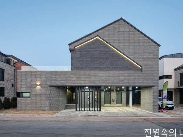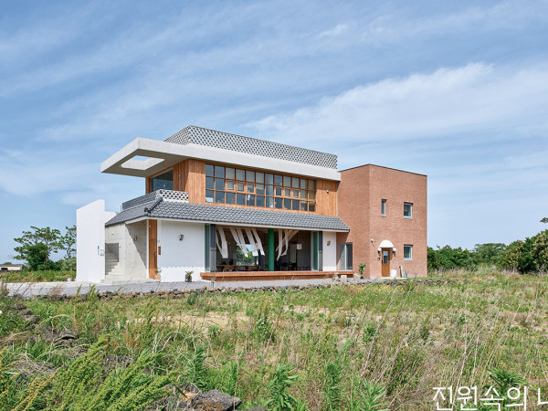 누구에게나 열린 공간을 꿈꾸며 옛 양옥집의 친근함을 담아 지은 집.식당과 카페, 주택이 한데 모인 이곳에선 제주의 풍경이 벗이 된다.제주의 동쪽, 월정리 바닷가에서 멀지 않은 곳. 여행객들에겐 이미 맛집으로 소문이 자자한 ‘슬슬슬로우’가 새로 자리를 잡았다. 예전엔 오래된 시골집을 손수 고친 정겨운 모습이었다면 1층 식당과 2층 카페, 살림집이 모인 새집은 한결 단정하지만 어쩐지 친숙하고 따스한 인상이다.친숙한 재료들을 조합한 주택 입면. 옛 양옥집을 떠올리게 하는 왼쪽 매스는 식당과 카페가 있는 상업공간, 단정한 박스 형태의 오른쪽 매스는 부부가 거주하는 주택으로 구성되었다.1층 식당 ‘슬슬슬로우’는 비워낸 면면을 건축주가 손수 꾸미고 채워나간 공간이다.“행원리 ‘슬슬슬로우&카페 스을’은 건축주의 그림 한 장으로부터 시작되었어요. 옥상에서 마당으로 이어지는 미끄럼틀을 비롯해 멀리서도 이 부부의 집임을 한눈에 알아볼 수 있는 다양한 특징들이 담겨 있었죠.”설계를 담당한 건축사사무소 오의 오정헌, 김지희 소장은 건축주 부부와 오랜 시간 집에 대한 생각을 나누었다. 부부는 프라이버시 확보가 중요한 도심 주택과 달리 누구나 방문할 수 있는 동네 사랑방 같은 집이 되기를 바랐다. 그동안 국내외를 여행하며 머물렀던 집의 기록을 건축가와 공유했고, 옛것만이 간직한 멋을 새집에 자연스럽게 녹여내자는데 의견이 모였다. 익숙하게 보아왔던 기와지붕과 옥상 파라펫, 식당 내부의 툇마루 등은 모두 제주도에서 자주 볼 수 있는 90년대 양옥집의 특징들을 조형적으로 풀어낸 것들이다. 여기에 나란히 자리한 귀여운 빨간 벽돌집의 조합이 동네 분위기와 어우러져 친근감을 자아낸다.SECTION① 휴게음식점 ② 현관 ③ 거실 ④ 주방 ⑤ 다용도실 ⑥ 방 ⑦ 드레스룸 ⑧ 욕실 ⑨ 복도상업공간은 접근하기 쉽도록 도로변에 가깝게, 부부의 생활공간인 주택은 안쪽으로 배치했다. 상업공간 1층은 식당 ‘슬슬슬로우’로, 농가주택을 개조했던 예전 공간처럼 건축주의 손맛을 최대한 담고자 여백을 적절히 두고 한옥의 툇마루를 빌려왔다. 마루에 앉아 창을 활짝 열면 제주의 정감 있는 풍경이 시원하게 들어온다.식당 내부는 바닥과 마루의 단 차이를 두어 각각의 풍경에 몰입할 수 있는 좌식 공간을 곳곳에 배치했다.한옥의 툇마루를 빌려온 좌식 공간은 마당을 향해 열린 창과 함께 제주의 정취를 감상하기 위한 장치가 되어준다.안쪽 좌식 공간에서도 건물 뒤쪽으로 펼쳐진 또 다른 풍경과 정취를 편안하게 감상할 수 있다. 2층 ‘카페 스을’은 건축주 부부가 배낭여행 중 머물렀던 집들의 느낌을 곳곳에 담아낸다. 신발을 벗고 올라가는 마루를 두되 소파에 기대어 창밖을 바라볼 수 있는 여유, 따뜻한 온도의 재료와 빛의 색감, 여행지의 사진이나 그곳에서 사 온 소장품 같은 장치들이 반영되었다.HOUSE PLAN대지위치 ≫제주특별자치도 제주시 대지면적 ≫539㎡(163.05평) 건물규모 ≫지상 2층 거주인원 ≫2명(부부 + 반려견 1) 건축면적 ≫204.20㎡(61.77평) 연면적 ≫363.87㎡(110.07평) 건폐율 ≫37.96% 용적률 ≫68.08% 주차대수 ≫3대 최고높이 ≫9.35m 구조 ≫기초 - 철근콘크리트 매트기초 / 지상 – 철근콘크리트 단열재 ≫비드법단열재 1종1호 100T 등 외부마감재 ≫주택 - 적벽돌 타일 / 상업공간 - 수성페인트(1층), 목재(2층), 기와 지붕, 두라스택 큐블록 Zag W(난간) 담장재 ≫제주돌담 창호재 ≫재현인텍스 PVC 시스템창호, PNS 커튼월 에너지원 ≫LPG 전기·기계·설비 ≫한성이엔지 시공 ≫더프라임 종합건설㈜ 설계·감리 ≫건축사사무소 오상업공간의 출입구가 있는 건물 측면. 1층의 양옥 지붕과 외부계단의 단순한 벽, 2층 지붕의 조형미가 어우러져 묘한 조화를 이룬다.2층 카페로 오르면 또 다른 풍경이 펼쳐진다. 특히 개구부 프레임을 적극 활용한 지붕은 하늘을 담는 건 물론 채광을 확보해주는 역할을 한다.풍경을 향해 열린 카페 내부. 이곳엔 부부가 여행하며 머물렀던 집들의 기록을 곳곳에 담아내고자 하였다.PLAN“상업공간이 최대한 ‘집’에 가깝게 연출되었다면, 주택은 정형화된 평면에서 벗어나 부부만의 라이프스타일과 취향을 오롯이 반영하기 위해 고민했습니다.”작은 이층집은 크지 않은 면적임에도 적정 층고와 가변적 도어를 활용해 쾌적하고 효율적인 공간을 이룬다. 인테리어는 부부가 선호하는 분위기와 질감을 고려하여 디자인했다. 1층 거실과 다이닝룸은 따스한 색감의 셀프레벨링으로 바닥을 마감했고, 계단은 얇은 금속계단을 행잉 처리한 디자인으로 선적인 미감을 강조했다.주택의 거실. 선적인 요소를 강조한 계단은 얇은 금속과 환봉으로 제작하고, 발에 닿는 촉감을 고려해 자작나무합판을 계단판재로 사용하였다.(위, 아래)거실과 하나로 이어지는 동선의 주방. 상업공간의 반대편에 있는 작은 데크 마당과 연결된 작은 방은 4연동 슬라이딩 도어를 여닫음에 따라 거실, 주방과 연계해 사용할 수 있다.2층 침실은 한쪽 벽을 돌담에 쓰이는 석재로 마감해 제주의 분위기를 그대로 담아낸다. 테라스에는 영롱쌓기한 벽돌로 난간을 만들어 채광과 개방감을 