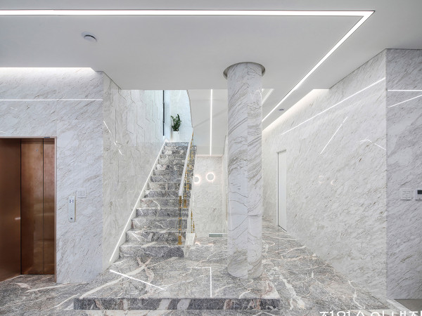 가족에게 아낌없이 쏟아부을 사랑을 위해 정성과 좋은 소재로 집이라는 크고 아름답고 유일한 그릇을 빚었다.경사지 택지에 자리한 주택. 1층과 2층 사이를 나누는 ‘ㄴ’자의 단차 안에는 띠 조명을 넣어 밤을 밝힌다.현관에는 높이 3m에 달하는 쌍여닫이문이 설치되었다.호텔은 늘 설렌다. 여행에서 호텔은 바쁜 여정의 쉼표이자, 낯선 세계에서의 안전한 안식처이고, 비일상으로 가득한 여행 자체를 연상시키는 즐거움의 아이콘이기도 하다. 건축주 부부는 늘 똑같은 ‘그저 집’이 아니라 가고 싶어 설레는, 호텔 같은 집을 짓고 싶었다.HOUSE PLAN① 현관 ② 주방 ③ 식당 ④ 거실 ⑤ 안방 ⑥ 방 ⑦ 욕실 ⑧ 드레스룸 ⑨ 서재·공부방 ⑩ EV(엘리베이터) ⑪ 보조주방 ⑫ 테라스 ⑬ 데크 ⑭ 주차장 ⑮ 보일러실 ⑯ 창고 ⑰ 취미실대지위치 ≫ 광주광역시 서구 대지면적 ≫ 298㎡(90.14평) 건물규모 ≫ 지하 1층, 지상 2층 거주인원 ≫ 4명(부부 + 자녀 2) 건축면적 ≫ 174.24㎡(52.70평) 연면적 ≫ 267.84㎡(81.02평) 건폐율 ≫ 58.47%(법정 60% 이하) 용적률 ≫ 89.88%(법정 220% 이하) 주차대수 ≫ 3대 최고높이 ≫ 10.2m 구조 ≫ 철근콘크리트 단열재 ≫ j+k 100t 압출법보온판(가등급) 외부마감재 ≫ 벽 - 델리카토크림 대리석 / 지붕 - 컬러강판 담장재 ≫ 스테인리스 스틸(평판, 타공판), 유리 창호재 ≫ 알파칸 시스템창호 열회수환기장치 ≫ 경동 나비엔 환기시스템 tac55 에너지원 ≫ 도시가스 조경 ≫ ㈜순디자인랩 전기·기계 ≫ ㈜성한 설비 ≫ ㈜태송기업 설계 ≫ 건축사사무소 쿰 이상일 감리 ≫ 창대건축사사무소 이영진 시공 ≫ ㈜순디자인랩 010-3753-3952 https://blog.naver.com/sdl16호텔 로비를 떠올리게 하는 현관 안. 엘리베이터가 바로 있어 주차장에서 가지고 온 짐을 쉽게 나를 수 있다.직접적인 계기는 아이들과 코로나 문제였다. 이제 초등학교에 입학한 쌍둥이 남매와 부부에게 코로나는 주택의 필요성을 더욱 와닿게 하는 사건이었다. 여기에 주택생활의 걱정을 덜 수 있는 입지도 운 좋게 찾았다. 여러 건축잡지와 주택을 둘러보고, 건축은 ‘순디자인랩’의 김재민 대표를 찾았다. 꿈꾸는 공간을 만드는 데에는 그가 제격이란 기대였다. 건축은 사계절을 보내고도 두어 달이 더 걸렸다. 그리고 다른 집들보다 오랜 기다린 만큼의 보답을 올가을부터 즐기고 있다.(위, 아래) 주택의 거실부터 복도, 방까지 이어지는 띠조명은 대리석과 함께 공간의 연속성과 동선의 흐름, 통일성을 보여준다.주택은 입구에서부터 찾아오는 이를 화려하게 맞이한다. 사람 키보다도 아득히 큰 현관문을 열고 들어서면, 여러 컬러의 대리석과 골드 톤의 금속이 마치 해외의 고급 호텔 로비에 온 듯한 분위기를 연출한다.주방은 뒤편 벽을 전부 빌트인 가전과 붙박이 수납장으로 만들어 아트월처럼 포인트가 되면서 시각적으로 깔끔하다. 바닥도 레벨을 살짝 높여 구분감을 줬다.가전에 꼭 맞춘 보조 주방 가구들.프라이빗 엘리베이터가 옆에 놓인 계단을 따라 오르면 주 생활공간들이 모인 1층에 닿게 된다. 계단실을 가운데 두고 도로 방향으로는 주방과 식당, 거실이 라인을 따라 놓였고, 숲 방향 안쪽에는 가장 내밀한 부부침실이 놓였다. 실내는 전반적으로, 가구 외에 겉으로 드러나는 소품들이 거의 눈에 띄지 않는다. 이는 건축주의 요청사항 중 하나로, 가능한 모든 소품을 눈에 보이지 않게 정리할 수 있도록 많은 수납공간을 설계에 반영한 결과다. 물론, 단순히 수납장만 늘이기보다는 인테리어에 녹아들 수 있도록 모든 수납장은 직접 제작해 적용했다. 여기에 보조 주방과 그에 딸린 다용도실, 그리고 외부 수납공간까지 갖춰 앞으로의 일상에 어떤 변화가 생기더라도 사용에 불편함이 없도록 했다.안방으로 들어서는 문은 높은 층고에 맞춰 특별히 제작된 방문이 적용됐다.파우더룸을 따로 분리하지 않고 함께 둔 안방. 세면대 벽은 천연대리석을 북매치 해 산수화를 보는 듯하다.2층에는 두 아이의 방과 공부방을 두었다. 아이들 방에는 각각 드레스룸과 욕실을 따로 두었는데, 앞으로 자라며 프라이버시에 민감해질 시기를 고려한 설계다. 쉼과 학업을 분리할 수 있도록 한 공부방에는 벽면을 가득 채운 책장과 함께 논의하고 정리할 수 있는 화이트보드를 두었다. 또한, 공부의 흐름이 끊기지 않도록 이곳에도 화장실을 별도로 둔 배려가 돋보인다.넉넉한 욕조와 샤워부스가 자리한 안방 욕실.안으로 경사진 벽면에 비교적 큰 중량을 가진 대리석 판재를 붙이는 일은 쉽지 않은 과정의 연속이었다.공부방은 잠시 숨을 돌릴 수 있는 테라스로의 출입이 가능하다. 야외가구와 파고라를 둔 외부 테라스는 자칫 부족하게 느껴질 수 있는 마당을 1층 중정과 더불어 보충해주는 역할을 한다. 이곳에서 바라보는 숲 방향으로의 조망은 시야에 초록을 가득 채우며 일상의 쉼이 되어준다.아이들 공부방으로, 때론 가족 서재로도 쓰는 공간.아이들 공부방으로, 때론 가족 서재로도 쓰는 공간. 남매 중 아들 담빈이의 방. 비밀기지를 연상케 하는 드레스룸과 펴고 접을 수 있는 미니 다락 사다리가 인상적이다.한편, 지하층에는 좌우로 4대를 수용할 수 있는 차고형 주차장