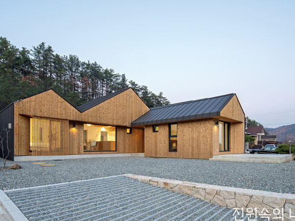 주변의 환경을 해치지 않고, 자연의 재료로 시간의 흐름을 한껏 받아들이고 싶었다. 아름다운 시의 운율처럼 자연스럽게 부유하며 자리하고 있는 집이 탄생했다.10가구 정도로 구성된 양평의 조그마한 마을에 새롭게 안착한 집. 소박하고 단순한 구조의 단층집은 주변과 잘 어우러지면서도 자신만의 색깔을 은은하게 드러내고 있다. 자연에서 온 재료를 사용해 그 특성을 집 전체에 담고자 했던 건축주는 여러 가지 건축적 요소를 활용하여 ‘시;집’만이 지닌 자연친화적인 포인트들을 만들어냈다.자갈이 깔린 앞마당에서는 게스트룸과 거실, 안방의 구조가 한눈에 들어온다. 일반적인 지붕과 다른 방향성을 보여줘 존재감이 느껴진다.통유리로 디자인된 현관문이 카페에 들어서는 느낌을 준다. 유리문을 지나면 내부 공간으로 들어가기 전 전실로 들어서게 된다.건물 외벽의 대부분을 감싸고 있는 목재 마감재가 시;집의 이러한 성격을 직관적으로 보여준다. 시간이 흐르며 자연 재료가 보여줄 자연스러운 변화가 기대되는 외관이다. 경골목구조로 지어진 집은 친환경 자재인 탄화목으로 외벽을 마감했다. 마당 바닥은 자연 재료인 자갈로 마감했고, 이는 데크와 후정까지 연결돼 집 전체를 아우르는 느낌이 든다. 처마 지붕에 홈통을 설치하지 않는 대신 처마선 하부 바닥에 유공관을 깔아 배수를 용이하게 했다. 빗물이 자갈 마당으로 바로 떨어져 자연스럽고 운치 있는 빗소리를 그대로 들을 수 있는 것이 건축주에게는 소소한 행복이다.SECTION(위, 아래) 작은 마을에 위치한 집. 주변 환경에 잘 어우러지는 집을 만들기 위해 단순한 구조의 단층집을 구상했다.현관으로 들어서면 전실을 기준으로 주생활 공간과 게스트룸으로 구분된다. 주생활 공간은 다시 주방, 거실, 안방으로 나뉘어지는데, 각각의 박공지붕 아래에서 분리된 공간감을 느낄 수 있다. 거실과 안방 사이에 건식 세면 공간이 둘을 다시 연결해주는 매개체 역할을 한다. 게스트룸은 별개의 욕실과 간이주방을 갖추고 있어 작업실로 쓰기도 하는 유연한 공간이다. 주생활 공간에는 특별한 장치가 한 가지 있다. 건물 외부에 설치된 슬라이딩 수직 차양 루버는 거실에서 안방까지 이동시킬 수 있어 태양의 위치에 따라 실내 일사량을 조절할 수 있고, 외부의 시선을 차단하는 역할도 한다.화이트와 우드 톤으로 따뜻한 감성이 돋보이는 주방. 정갈한 대들보가 공간에 안정감을 더한다.주방 옆에는 거실 겸 다용도 공간을 마련했다. 통창을 통해 바깥 풍경이 시원하게 펼쳐진다.루버를 통해 만들어지는 그림자는 시간대에 따라 집 안의 분위기를 시시각각 다양하게 연출한다.PLAN건축주가 가장 매력적으로 느끼는 곳은 후정 공간. 북쪽 인접 대지와의 레벨차로 인해 형성된 3m의 콘크리트 옹벽을 처음에는 단점이라고 생각했지만, 지금은 오히려 옹벽 덕분에 공간이 더욱 프라이빗하게 느껴진다. 기능상 불필요하다고 생각했던 집의 뒤쪽 공간이 지금은 손님을 초대하거나 개인적인 공간으로 활용하며 계속해서 머무르고 싶은 곳이 된 것. 또한 옹벽에 햇빛이 반사되어 들어오는 은은한 간접광 역시 후정을 매력적으로 만들어준다.주방에서 보이는 후정 공간. 옹벽에 반사되어 비치는 간접광이 색다른 분위기를 만든다.주생활 공간 가장 안쪽에 위치한 안방 침실. 포인트 벽은 집의 외벽과 같은 마감재를 사용해 외관이 지닌 정체성을 내부로 들여왔다.대지의 높이차로 인해 형성된 옹벽은 갈색빛을 띠는 부정형 호피석으로 마감해 목재와 자갈, 콘크리트의 상반된 이미지를 조화롭게 중화시킬 수 있도록 했다.HOUSE PLAN대지위치 ≫경기도 양평군 용문면 대지면적 ≫344㎡(104.06평) 건물규모 ≫지상 1층 거주인원 ≫2명(부부) 건축면적 ≫86.79㎡(26.25평) 연면적 ≫83.99㎡(25.40평) 건폐율 ≫25.23% 용적률 ≫24.42% 주차대수 ≫1대 최고높이 ≫5.96m 구조 ≫기초 – 철근콘크리트 매트기초 / 지상 –경량목구조 외벽 2×6 구조목 + 내벽 S.P.F 구조목 / 지붕 –2×10 구조목 단열재 ≫인슐레이션 R23, R37 외부마감재 ≫외벽 – 루나우드, 컬러강판 / 지붕 – 리얼징크 담장재 ≫호피석 부정형 창호재 ≫살라만더 82mm 독일식 PVC 시스템창호(에너지등급 1등급) 에너지원 ≫기름보일러 조경 ≫건축주 직영 내부마감재 ≫벽 – LX하우시스 합지벽지 / 바닥 –LX하우시스 지아마루 Real 콘크리트베이직 욕실 및 주방 타일 ≫자기질 타일 수전 등 욕실기기 ≫아메리칸스탠다드 거실 가구 ≫PLANTLANCE 방문 ≫예림ABS도어 데크재 ≫콘크리트 폴리싱 시공 ≫공간하임 설계 ≫건축사사무소 요하 02-6953-0604 www.yohaa.co.kr취재_조재희| 사진_김성철ⓒ 월간 전원속의 내집 2022년 1월호 / Vol.275 www.uujj.co.kr월간 <전원속의 내집>의 기사 저작권은 (주)주택문화사에 있습니다. 무단전재, 복사, 배포는 저작권법에 위배되오니 자제해주시기 바랍니다.