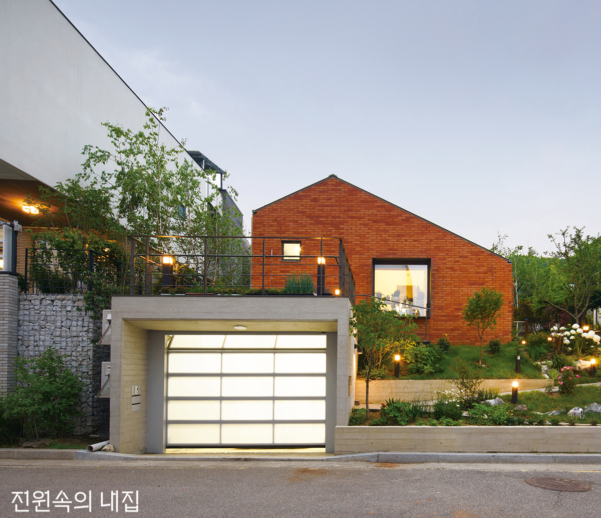 낮에는 은은하다가 밤에 빛을 발하는 폴리카보네이트를 활용한 차고 문. 오렌지색 벽돌 외벽과 조화를 이루며 경쾌한 주택 분위기에 일조한다. 적정건축 OfAA + 스튜디오 인로코 ©이원석