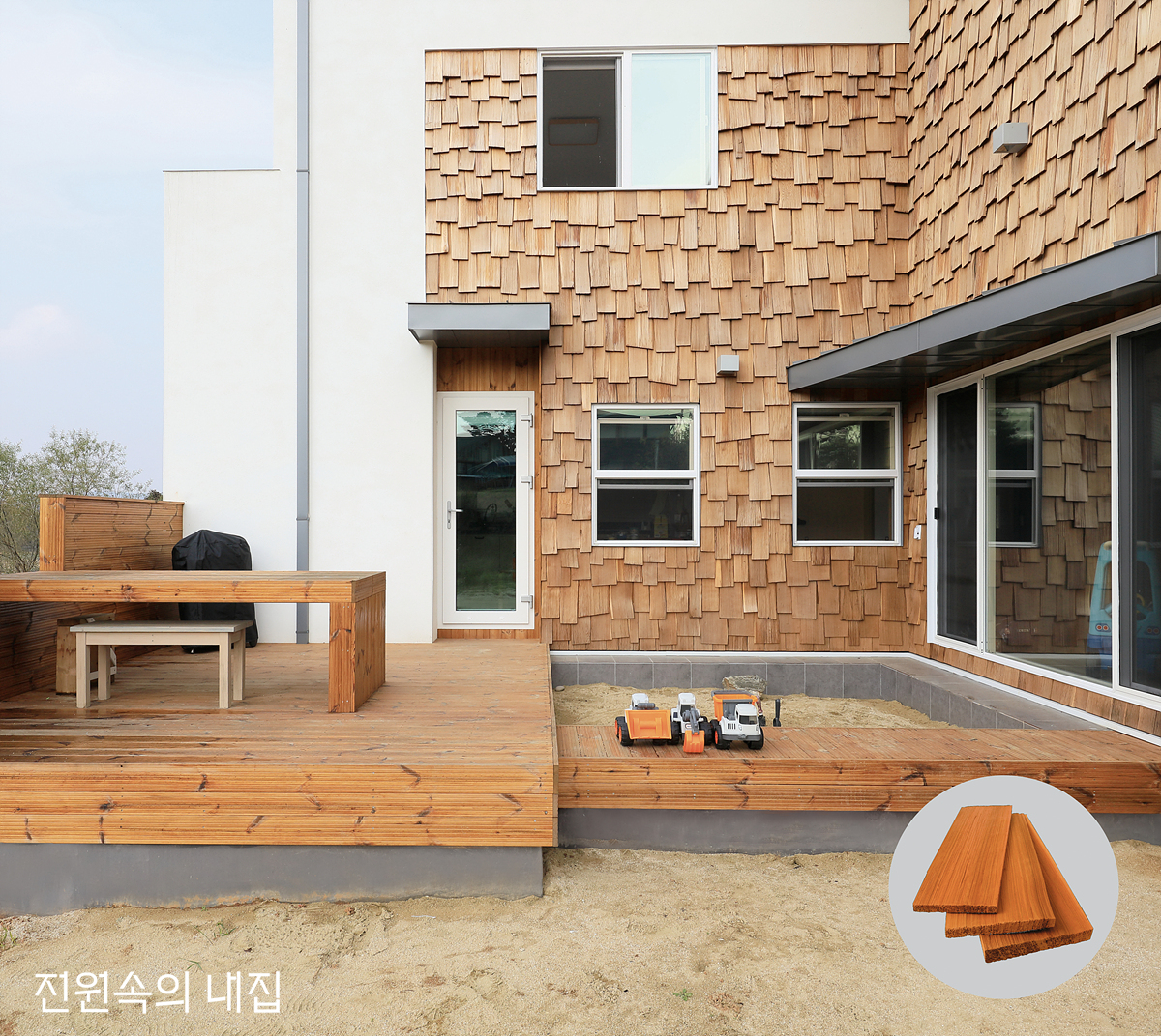 스터코에 적삼목 쉐이크로 포인트를 준 입면. ‘시더(Cedar)’라고도 부르는 삼목은 별도의 방부처리 없이도 습기, 부식, 병충해에 강하다. _ 홈스타일토토