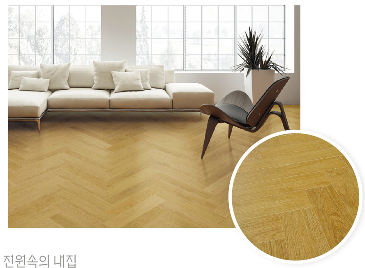 자연스러운 나무 무늬와 따뜻한 색감, 편안한 보행감을 주는 목재 바닥재. 직접 닿는 표면에 특수처리나 필름 코팅 해 내수성과 내구성을 높이는 한편, 헤링본이나 레트로트레일, 전통마루 등 다양한 패턴 방식으로 변화를 주는 것도 좋다.