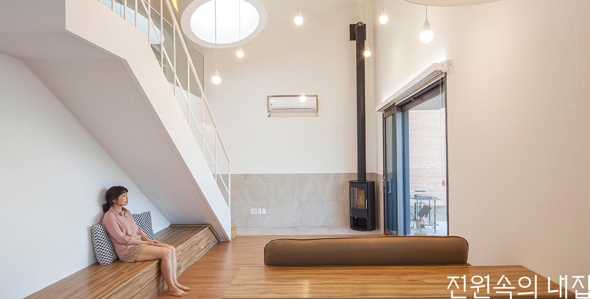 상부에 창을 달고 하부 수납장을 허리춤까지 높여 벤치로도 사용한다. 경치는 누리되 실내 프라이버시도 보호할 수 있다. 모루초디자인