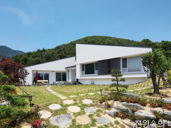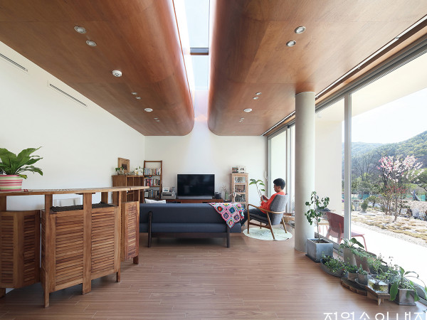어쩌다 집을 짓게 되었다. 은퇴 후 둘이서 밭을 일굴 땅을 찾으러 다니다가, 경치 좋고 볕 좋은 이곳에 반해 그대로 눌러앉고 말았다. 예고 없이 찾아와 선물처럼 안긴 새로운 일상. 길게 뻗은 천창 너머 하늘이 보이는 이 단순한 집은 부부의 삶을 충실히 담는다.단순한 네모 상자 안푸른 하늘을 담아내는반전 있는 집깨끗한 하얀색에 네모반듯한 단층집이 멀리서도 한눈에 들어온다. 길에서는 창도 하나 찾아보기 힘든 모습이 사뭇 차갑다 느낄 때쯤, 집 앞에 놓인 청록색 벤치가 잠시 쉬었다 가라며 정답게 반긴다. 퇴임 후 이제 막 새로운 인생을 열어가려던 부부는 우연히 이 땅을 만났고, 자연과 더 가까이 살고자 집을 지었다. 이웃집과 거리가 꽤 가까운 동네라 주변 시선으로부터 자유로워야 했고, 땅이 가진 멋진 전망도 포기할 수 없었다. 그리하여 집은 인접도로와 거리를 두기 위해 남향 창이 하나도 없는 집이 되었고, 대신 천창을 매우 길게 내어 실내 채광을 확보했다.싱가포르에서 6년을 살았고 해외 출장도 잦았다는 부부의 집 곳곳에는 이국적인 물건이 가득하다. 개성 있는 패턴과 색감의 찻잔과 장식품, 손때 묻은 나무 가구들이 따뜻한 공간을 이룬다. 개울과 산 풍경이 펼쳐진 서쪽으로는 전면 창을 내고 작은 마당을 두어 전망을 최대한 누릴 수 있다. 또한 방의 개수와 면적을 최소화하고, 개방적인 거실과 주방, 욕실 공간에 면적을 투자해 주로 생활하는 공간 만큼은 여유롭게 쓸 수 있도록 했다. 거실에 앉아 있으면 천창을 통해 들어오는 빛이 점차 기울어지며 시간의 흐름을 알린다. 머리 위로 구름이 천천히 흐르고 빗방울이 떨어지는 모습을 가만히 들여다볼 수 있는 집. 자연의 변화에 따라 물드는, 작지만 풍부한 집이다.주택 현관이 있는 동쪽 입면. 집 앞에 둔 벤치는 부부가 손수 리폼한 것으로, 별보기를 좋아하는 남편을 위한 장소이자 이웃을 위한 작은 쉼터다.도로와 맞닿은 면에는 프라이버시를 위해 남향임에도 창문을 과감하게 없앴다.입면도풍광 좋은 거실은 부부가 주로 시간을 보내는 공간. 길게 낸 천창을 중심으로 곡면을 이루는 목재 마감 천장 디자인이 시선을 사로잡는다.문을 열고 집으로 들어서면 조카가 그려준 그림이 산뜻하게 반겨준다.서쪽으로 널찍하게 놓인 주방과 거실은 하나로 길게 이어져 시원한 공간감을 느낄 수 있다. 이곳에서 부부는 함께 배운 스포츠댄스를 가볍게 즐기기도 한다고.HOUSE PLAN대지위치≫ 경기도 여주시대지면적≫ 419m2(126.75평)건물규모≫ 지상 1층거주인원≫ 2명(부부)건축면적≫ 160.31m2(48.49평) |연면적≫ 147.05m2(44.48평)건폐율≫ 38.11% |용적률≫ 34.94%주차대수≫ 1대최고높이≫ 4.2m구조≫ 철근콘크리트구조단열재≫ 바닥 - T130 압출법보온판 특호 / 벽체 - T140 비드법보온판 2종1호(가등급) / 지붕 - T220 비드법보온판 2종3호(가등급)외부마감재≫ 스터코내부마감재≫ 벽 - 삼화페인트 친환경 도장, 요코합판 위 투명스테인 / 바닥 - 스타마루(강마루)욕실 및 주방 타일≫ 을지로 한양타일수전 등 욕실기기≫ 대림바스주방 가구≫ 협정가구 | 조명≫ 룩스몰(LUXMALL)현관문≫ 단열방화도어 위 우레탄도장방문≫ 영림도어창호재≫ 공간 알루미늄 시스템창호열회수환기장치≫ 에코버 | 에너지원≫ 기름보일러조경≫ 건축주 직영 |시공≫ JD 건축설계·감리≫ JYA-RCHITECTS 원유민, 조장희, 성지은 02-391-9910http://jyarchitects.com주방에는 아내가 그동안 모아온 컬러풀한 그릇과 찻잔이 가득하다.꼭 필요한 것만 둔 안방. 한쪽에 가벽을 세워 작은 드레스룸을 마련했다.평면도욕실 문 안팎의 모습. 아내의 특별 요청에 따라 욕실은 면적을 최대한 넓게 확보하고 수납공간을 넉넉하게 두었다. 욕실 앞 공간에는 오픈 세면대를 두고 세탁실과 수납 선반을 구성했다.단순하고 경제적이며관리가 쉬운 집집을 짓고자 건축가를 찾은 부부가 내건 조건은 명쾌했다. 단순하면서 경제적이고 유지관리가 쉬우며 생활이 편리한 집. 이 모든 걸 집약한, 가장 효율적인 형태가 바로 네모난 단층집이었다. 이제 부부는 풍경을 곁에 둔 넓은 거실과 주방에서 하루를 보내고, 드레스룸을 겸한 침실은 콤팩트하게 꾸려 잠만 잔다. 욕실 앞 공간은 파우더룸, 세탁실을 겸한 멀티 공간이다. 난방, 에어컨, 환기 시스템, 스마트홈까지 모든 컨트롤러는 편의를 위해 거실 벽 한쪽에 모아두었다. 이렇듯, 집을 그리는 과정은 단순히 공간과 형태만을 단순화하는 데서 그치지 않는다. 집을 짓고 난 후, 부부의 생활 또한 간결하게 정리된 것처럼.욕실 앞 공간에도 천창을 내어, 낮에도 조명을 켠 듯 늘 환하다.깊은 차고에도 천창을 내어 채광을 확보하고 작은 휴식 공간을 만들었다. 전기차 충전기도 미리 계획하여 사용하기 편리한 위치에 설치했다.햇볕이 따스하게 들어오는 테라스. 거실, 주방에서 바로 드나들 수 있는 이곳에선 저 멀리 계절 담긴 산 풍경이 펼쳐진다. 부부가 애용하는 브런치 공간으로, 직접 만든 테이블과 의자를 두었다.이제는 가벼워질 시간부부가 전에 살던 집은 수직으로 공간을 쌓은 땅콩집 형태였던 터라 계단이 많았다. 이 때문에 단층집에 살리라 마음먹었다지만, 사실 그