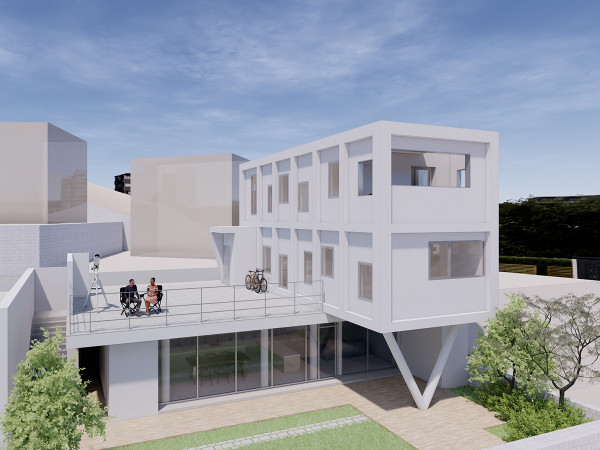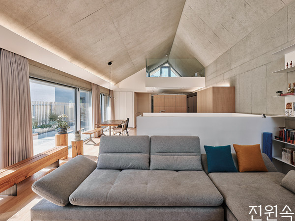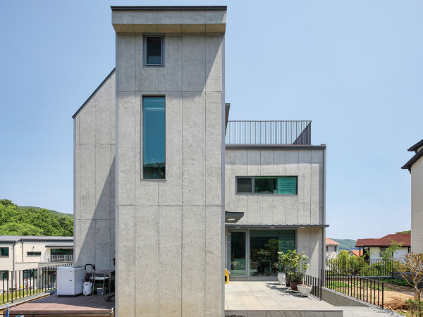 멋 부리지 않은 외관이 오히려 분명한 존재감을 드러내는 집. 차분하고 단정한 다가구주택 한 채가 마을 풍경에 새로운 스카이라인을 그려낸다.노출콘크리트와 원목이 조화를 이루는 건물 외관. 4층 옥상정원은 그 자체로 입면 디자인 요소가 된다.지금으로부터 약 2년 전, 사이좋은 부부가 첫 주택 설계를 의뢰하러 찾아오셨다. 성남시 고등지구의 한 필지를 구입한 부부는 같은 직장을 다니고 있었지만, 이번 건축을 계기로 한 분은 퇴사하여 카페를 운영하는 제2의 인생을 꿈꾸고 있었다.건축주 부부와 함께 방문한 대지는 전형적인 신도시 개발지구 내에 있는 다가구주택용 택지로, 여타의 신도시들과 크게 다르지 않은 모습이었다. 필지들은 근린생활시설과 다가구주택이 조합된 4층짜리 건물을 아슬아슬하게 지을 수 있을 정도의 폭과 넓이를 가지고 있었고, 6m 폭의 도로는 머지않아 주차장처럼 변할 것이 쉽게 예상되었다.외부 시선을 최소화하기 위해 창과 발코니를 세로로 좁고 길게 냈다. 이는 입면에 재미를 더하는 역할도 한다.SECTION ① 카페 ② 홀 ③ 창고 ④ 썬큰가든 ⑤ 욕실 ⑥ 현관 ⑦ 거실 ⑧ 주방/식당 ⑨ 팬트리 ⑩ 침실 ⑪ 드레스룸 ⑫ 파우더룸 ⑬ 발코니 ⑭ 서재 ⑮ 옥상정원 임대세대설계가 시작된 지 얼마 지나지 않아 주변의 몇몇 필지들은 아주 빠른 속도로 건물이 지어지기 시작했고, 우리가 착공을 의논할 시점에는 벌써 다 지어진 건물들이 여기저기 생겨 있었다. 대부분의 건물이 최대한의 용적률을 위해 도로 앞에 바싹 붙어 앉았고, 창의적인 다락방 창조 기술들은 이 동네의 스카이라인을 눈이 어지러울 정도로 다양하게 그리고 있었다. 이제 막 조성되기 시작한 동네이지만, 신기하게도 완성된 모습이 눈앞에 보이는 듯했다.우리는 이와 비슷한 땅에서 이미 건축을 했던 경험이 있었고, ‘틈틈집’이라는 프로젝트에서는 해결책으로 중정과 좁고 긴 발코니를 제시했었다. 건축주분들도 그 프로젝트를 마음에 들어하셨으나, 고등동 필지는 폭이 약 12m로 중정은커녕 주차장 넣기에도 머리가 아플 지경이었다. 그러다 보니 우리가 선택할 수 있는 해결책은 좁고 긴 발코니와 도로로부터 멀어지기가 유일하였다. 대지 전면의 6m 도로는 이 집의 내부를 건너편 집의 시선으로부터 지켜주기에는 많이 모자랐기에, 우리는 건물의 전면을 최대한 도로에서 떨어뜨리기 위해 무던히 애를 썼다. 동시에 건물 전면의 큰 발코니 대신 좁고 긴 발코니를 집의 중심에 두고, 전면으로의 창도 좁고 긴 형태로 해서 외부 시선이 닿을 수 있는 범위를 최대한 줄이고자 하였다.(위, 아래) 지하 공간은 1층의 전면창과 수직으로 연결되는 썬큰가든 덕분에 늘 환하다.그런데 설계를 시작하자마자 큰 난관이 닥쳤다. 대지의 12m 폭으로 인해 일조권 적용을 하면 4층의 절반을 고스란히 날려야 하는 상황이었다. 이런 집들은 대체로 1층은 상가, 2·3층은 임대세대, 4층은 주인집으로 구성하는 것이 암묵적인 공식이다. 그런데 4층의 절반을 못 쓰게 됐으니 건축주분들의 실망이 이만저만이 아니었다. 어쩔 수 없는 상황 속에서 우리는 3층의 절반과 4층을 건축주를 위한 집으로 만들기로 했다. 3층은 침실 등의 사적 영역, 4층은 거실과 주방 등의 생활 영역으로 하고, 4층의 절반이나 되는 넓은 옥상 정원을 만들어 복층형 단독주택에 사는 것 같은 기분을 느낄 수 있도록 했다.HOUSE PLAN대지면적 ≫ 경기도 성남시 수정구대지면적 ≫ 265m2(80.16평)건물규모 ≫ 지하 1층, 지상 4층거주인원 ≫ 4세대(임대세대 3 + 주인세대 1)건축면적 ≫ 158.78m2(48.03평) | 연면적 ≫ 499.32m2(151.04평)건폐율 ≫ 59.92% | 용적률 ≫ 159.88%주차대수 ≫ 5대최고높이 ≫ 14.12m구조 ≫ 기초 - 철근콘크리트 매트기초 / 지상 – 철근콘크리트단열재 ≫ 수성연질폼 125mm, 85mm / 경질우레탄폼 2종2호 80mm, 140mm외부마감재 ≫ 외벽 - 노출콘크리트 위 발수제 2회, 20T 아코야목재 위 투명 오일스테인 / 지붕 - 20T 아코야목재 위 투명 오일스테인창호재 ≫ 이건창호 240mm 알루미늄 PS, 70mm 알루미늄 TT, 70mm 알루미늄 TH / 아키페이스 65mm 알루미늄 TT, 155mm 알루미늄 LS에너지원 ≫ 도시가스 | 조경석 ≫ 중흥 잔디로드(녹화율50%)조경 ≫ 어나더가든 | 전기·기계·설비 ≫ 선화설비구조설계 ≫ S.D.M 구조 | 시공 ≫ 태연디앤에프(주)감리 ≫ 성지건축사사무소설계 ≫ 아키후드 건축사사무소주방에서 바라본 거실. 계단실을 기준으로 거실과 다른 공간의 영역이 나뉜다. 다양한 형태와 배치의 창이 선사하는 전망과 풍부한 채광은 덤이다.임대세대는 공간 한가운데 발코니를 두어 마치 중정을 품은 듯한 느낌을 준다.대략적인 구성이 끝났으니, 건물의 재료를 정해야 하는 순간이 왔다. 역시나 처음 건축하시는 분들에게는 익숙한 재료가 우선 고려 대상이었다. 하지만 우리는 이 동네의 미래가 너무나도 선명하게 머릿속에 그려졌기에, 남들과 비슷한 재료를 사용하기보다는 남들이 사용하지 않을 재료, 대신 차분하면서 인위적이지 않은 재료를 사용하기를 추천했다. 그래서 제안한 재료가 유로폼 노출콘크리트와 원목의 조합이었고 ‘이대로만 하면 임대가 빨리 나갈 것’이라는 장담할 수 