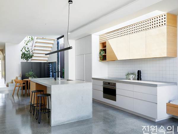 복잡한 대도시 뒷골목 주택가에 오랫동안 방치되었던 집의 신축 프로젝트. 길고 좁게 형성된 대지의 제한을 극복하며 주변 건물과 적절하게 조화를 이룬 현대적인 주택이 재탄생하였다.HOUSE PLAN대지위치≫ Melbourne, Australia 연면적≫ 230㎡ 설계≫ Tom Robertson Architects http://tomrobertson.com.au 사진≫ Tatjan Plitt호주 멜버른의 밀집된 구도심에 새롭게 들어선 주택이다. 협소한 부지에는 원래 노동자층의 전형적인 오래된 집이 자리했다. 상당 기간 비어 있었던 주택은 폐가로 보일 만큼 낡고 칙칙한 분위기였다.실내 채광 확보를 위해 창을 다양하게 활용하였다.빛, 공기, 공간을 극대화하는 설계에 초점을 맞춰 프로젝트가 진행되었다.건축가는 이 주택의 신축 프로젝트를 맡아 빛, 공기, 공간의 극대화에 주안점을 둔 설계를 진행하였다. 내부는 집이 밝고 넓어야 했고, 외부는 이웃과 조화를 이뤄야 한다는 까다로운 조건도 지혜롭게 풀어나갔다. 절제된 선과 미묘한 디테일이 특징인 박공지붕을 채택하고, 이웃한 건물과의 레벨을 고려해 높이를 정했다. 과시적이지 않고 단순한 디자인의 주택은 유행하는 자재나 장식의 사용보다는 거주자의 생활을 배려한 사려 깊은 공간으로 구성되었다.SECTION아담하지만 꽉찬 공간 구성을 이룬다.거실과 주방, 식당 공간이 하나의 동선상에 길게 이어져 배치되었다.강철 케이블 난간은 내부에도 설치되어 실내용 식물 덩굴이 뻗어 나갈 수 있는 장치 역할을 겸한다.외부 환경과의 연결 고리를 위해 최소한의 야외 공간을 두었다. 또 건축물의 정면 파사드에 붙박이로 넣은 화분 상자에서 덩굴이 자라 강철 케이블을 휘감도록 장치를 마련하였다. 그로 인해 절제된 라인은 한결 부드러워지고 세월이 흐르면서 생기 넘치는 초록 외관이 형성될 것이다. 뿐만 아니라 실내에도 난간의 연결 구조와 강철 케이블을 휘감는 실내 덩굴 화분을 두어 자연 요소를 집안에도 들이도록 마감하였다.PLAN계단실 상단에 놓인 채광창은 건물 중앙에 위치하여 집안으로 자연 채광을 제공한다.참나무 가구 장식은 주로 흰색 인테리어에 따뜻한 느낌을 보태는 역할을 하기에 충분하다.공간에 맞춘 디자인이 적용된 안방 수납장.박공지붕 형태로 인해 마스터 침실에 공간을 채우는 창호가 자리 잡았다. 외부에서 볼 때도 건물 볼륨이 크게 보이는 효과가 있다.길게 배치된 내부에 들어서면 주방과 식당을 거쳐 생활 공간이 펼쳐진다. 오전은 물론 한낮에도 빛을 실내로 최대한 끌어들이는 방법이 강구되었다. 계단 위는 물론 주방 상단에 별도의 채광창을 두어 자연광이 들어오게 하였고, 테이블 높이의 창을 내 식당 공간을 작은 동쪽 중정과 연결시켰다. 계단을 따라 이어지는 2층 공간 역시 환한 분위기이다. 남향으로 넓게 창을 낸 지붕선과 맞닿은 위치에 배치된 침실은 실제보다 큰 볼륨감이 느껴진다.취재_이준희ⓒ월간 전원속의 내집/ Vol.268 www.uujj.co.kr월간 <전원속의 내집>의 기사 저작권은 (주)주택문화사에 있습니다. 무단전재, 복사, 배포는 저작권법에 위배되오니 자제해주시기 바랍니다.1