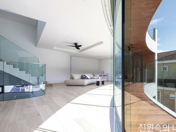 오래전 형성된 주택단지 안, 남다른 외관으로 이목을 끄는 집이 나타났다. 안으로 들어서면 다이내믹한 스킵플로어 구조와 크고 작은 창이 새로운 일상과 풍경을 선사한다.중소도시 외곽, 지역기업의 임직원 거주를 위해 2000년 초반 형성된 마을은 철골구조를 이용해 빠른 기간 다량의 주택이 형성된 지역이다. 철골구조이기는 하나 그 형태는 미국 외곽지역에서 볼 법한 전형적인 목조주택의 모습을 띠고 있었다. 균일하게 분할된 필지들과 엇비슷하게 지어진 집들의 조화는 요즘 형성되는 신도시 주택단지와 흡사한 모습으로, 세월의 흔적이 조금 더 느껴졌다. 20여 년이 흐르는 동안 주택은 대부분 소유주가 바뀌고 노후화도 진행되고 있었지만, 마을에 대한 자부심이 높고 보수적인 분위기 속에서 신축은 거의 없는 상황이었다.공원으로 이어지는 오솔길에서의 외부 시선을 피하기 위해, 주택 후면은 완만한 곡선을 그리며 숲을 향해 열려 있다.SECTION ① 서재 ② 화장실 ③ 세탁실 ④ 창고 ⑤ 썬큰 ⑥ 포치 ⑦ 현관 ⑧ 주차장 ⑨ 주방/식당 ⑩ 보조주방 ⑪ 데크 ⑫ 가족실 ⑬ 침실 ⑭ 욕실 ⑮ 거실 다실 바 보일러실 발코니 드레스룸 안방대담한 매스의 선과 입면에 재미를 더하는 창 디자인.의뢰해온 건축주는 이미 그 마을에서 거주 중이었고 노후화되고 불편해진 집에 대한 고민이 많은 상태였다. 마을 분위기상 신축 자체가 상당히 부담되는 일이었지만, 기존 주택의 한계를 느낀 건축주는 원하는 집을 새로 짓길 희망했다. 인위적으로 조성된 주택단지의 특성상 다른 집들과 연접하는 경우가 많아 주변 집들의 민원이 예상되곤 하는데, 다행히도 해당 대지는 공원과 접해 있었고 공원으로 가는 오솔길로 인해 옆집과도 조금 떨어진 상황이었다. 최근 형성되는 신도시 주택단지보다 도로 폭도 넓은 편이어서 한쪽을 접하고 있는 옆집을 제외하면 3면이 어느 정도 개방된, 좋은 조건의 대지였다.이미 주택에 오랜 시간 거주하였고 같은 장소에 다시 집을 짓는 경우인 터라, 건축주는 그동안 살면서 불편했던 점들과 원하는 공간의 성격이 분명하였다. 두 명의 자녀가 있는 40대 건축주 부부는 아이들을 양육하면서 필요한 실용적인 공간부터 부부를 위한 로망의 공간들까지 다양한 이야기를 들려주었다. 주말이면 공원 산책길로 통하는 오솔길에 통행하는 사람이 많아, 1층 공간에서 외부 시선으로 인한 불편을 느끼는 것이 가장 큰 문제였다.데크에서 바라본 주방. 외부 조명이 켜진 밤에는 또 다른 풍경을 만날 수 있다.현관에 들어서면 전면 창 너머로 볕이 깊숙이 드리운 풍경을 만나게 된다.개방감 있는 1층 주방 겸 식사 공간.설계의 방향은 오솔길과 접하는 면에 반지하 공간을 만들어 외부 시선을 차단하고, 1층과 2층의 시선을 숲 쪽으로 돌리는 데서 시작됐다. 반지하 공간이 생기면서 주택은 자연스럽게 스킵플로어 구조로 이루어졌다. 크지 않은 대지에 필요한 프로그램을 배치하다 보니 높은 층고를 실현하기는 어려웠지만, 밀도 높은 공간 속에서 계단들에 의해 수직으로 개방된 드라마틱한 공간이 만들어졌다. 계단실 중앙에 천창을 두고 위에서 떨어지는 빛을 받으며 계단을 오르고 내리는 경험은 이 집만의 특별함이 되었다.HOUSE PLAN대지면적≫ 335.60m2(101.52평)건물규모≫ 지하 1층, 지상 2층거주인원≫ 4명(부부 + 자녀 2)건축면적≫ 165.45m2(50.05평) | 연면적≫ 326.09m2(98.64평)건폐율≫ 49.30% |용적률≫ 79.42%주차대수≫ 3대최고높이≫ 8.95m구조≫ 철근콘크리트 구조단열재≫ 비드법보온판 가등급외부마감재≫ 스톤파이 실버클라우드 석재창호재≫ LG하우시스 시스템창호시공≫ 제효건설감리≫ 라움 건축사사무소설계≫ 박호현(한밭대학교 건축학과) + 김현주·조성곤(㈜스노우에이드 건축사사무소)설계 담당≫ 박현우, 윤성웅널찍한 현관 공간과 옆의 계단실 전경.계단실 천장에는 타원형의 창을 내어 채광을 확보했다.공간 구성에 있어 특이한 점은 1층을 주방으로 구성한 것이다. 요리를 좋아하고 지인들을 초대해 식사하며 담소하기를 즐겨하는 안주인의 취향을 그대로 반영했다. 1층 주방과 식사공간은 집에서 가장 공적인 공간이기에 현관에서 바로 접근할 수 있는 위치에 배치하였다. 1층에서 반 층 내려가면 서재 및 다용도 공간이 있어 자녀의 친구들이나 방문 선생님이 방문했을 때 놀이와 교육 공간으로 활용할 수 있다.1층에서 반 층 오르면 가족만을 위한 사적인 영역이 시작되는데, 아이들 방과 계단참을 확장한 작은 가족실을 두었다. 다시 반 층 올라 2층에 다다르면 거대한 곡선 창으로 파노라마 뷰를 보여주는 거실이 등장한다. 아일랜드 바에서는 간단한 스낵과 와인을 즐길 수 있고, 실링팬과 에탄올 벽난로로 실용적이면서도 안락한 공간을 만들고자 했다. 밝은 분위기의 거실에서 2.5층으로 오르면 고급스러운 블랙의 마스터존으로 향한다. 샤워부스와 화장실을 중심으로 옷장, 세면대, 욕조가 둘러싸고 있는 마스터 욕실은 드레스룸과 욕실을 결합해 순환 동선으로 구성하였다. 옥상에서는 공원의 전망을 한눈에 즐기며 바비큐를 즐길 수 있는 루프탑 정원이 펼쳐진다.수직으로 시원하게 이어지는