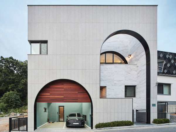 서울 진관동 단독주택현대와 고전, 직선과 곡선이 조화를 이룬 집.시원시원한 공간 사이로 꼼꼼한 디테일이 숨어 있다.커다란 아치 창이 시선을 끄는 거실. 인접한 선에 맞춰 비례감 있게 창 프레임을 분할하고, 벽과 바닥은 포세린 타일로 마감했다.도로에서 바라본 주택의 모습. 곡률이 다른 두 개의 큰 아치 출입구와 코너창이 독특한 입면을 만들어낸다.건축주 부부는 북한산 자락 진관동 한옥마을에 인생 후반기를 보낼 정원이 있는 집을 원했다. 대지 인근에 우리가 설계한 주택 작업이 마음에 들어 구청까지 찾아가 연락처를 알아냈을 정도로 어렵게 닿은 소중한 인연이 이 프로젝트의 시작이었다. 집을 짓기로 한 결심과는 다르게 디자인에 있어서는 부부가 조금 다른 입장을 취했다.한 사람은 간결하고 모던한 건축을, 한 사람은 화려한 장식의 고전적인 형태를 원한 것. 고심 끝에 우리는 ‘모던 클래식(Modern Classic)’이라는 개념을 정하고, 고전적인 공간과 형태를 현대적으로 재해석하고자 했다.PLANB1F – 84.98㎡ / 1F – 95.99㎡ / 2F – 118.31㎡ /// ①주차장 ②세탁실 ③창고 ④작업실 ⑤현관 ⑥게스트룸 ⑦거실 ⑧주방/식당 ⑨팬트리 ⑩화장실 ⑪테라스 ⑫침실 ⑬드레스룸 ⑭가족실 ⑮서재HOUSE PLAN대지위치▶ 서울시 은평구 대지면적▶ 330㎡(99.82평) |건물규모▶ 지하 1층, 지상 2층거주인원▶ 3명(부부 + 자녀 1)건축면적▶ 164.42㎡(49.73평) |연면적▶ 331.73㎡(100.34평)건폐율▶ 49.82% |용적률▶ 64.94%주차대수▶ 2대 |최고높이▶ 9.5m구조▶ 기초 - 철근콘크리트 매트기초 / 지상 – 철근콘크리트외부마감재▶ 외벽 - THK30 사비석 잔다듬, 비앙코 카라라 천연대리석, 블랙 스테인리스 / 지붕 - 알루미늄 돌출패널창호재▶ 이건창호 알루미늄 시스템창호(에너지등급 1등급), 43mm 삼중로이유리에너지원▶ 도시가스 |조경석▶ 사비석시공▶ 다산건설엔지니어링㈜ 02-3453-4963설계▶ ㈜세이브종합건축사사무소측면에 창이 있어 낮에도 환한 현관(위, 아래) 정원으로 동선이 이어지는 주방과 거실. 층고에 해당하는 만큼 높게 창을 내어 막힘없이 시선이 확장된다.대지는 좁고 긴 형상으로 도로에서 북한산을 향해 완만하게 경사져 있다. 낮은 도로변 쪽에 지하층과 주차장을 배치해 주출입구로 삼으면서 자연스럽게 토목 공사비까지 절감할 수 있었다.1층에는 거실, 주방 등 공용 공간을 계획하고, 2층에는 침실, 서재 등 사적 공간을 두어 프라이버시를 확보하고자 했다. 거실과 주방은 연속된 공간이고 정원과 북한산으로의 전면 창을 열면 자연스럽게 외부로 시선이 확장된다. 이는 정원을 확보하기 위해 1층 면적을 줄이고, 전망 좋은 2층과 넓은 옥상 공간을 확보하기 위한 전략으로 이어진다.외관의 전반적인 디자인은 기능적으로 단정한 사각형 매스에 도로변의 정면과 북한산을 향하는 배면으로 각각 두 개의 아치를 삽입해 특징을 부여하고자 했다. 측면으로는 기능적인 환기와 채광을 위한 최소한의 창을 설치, 조용하고 안락한 주거 공간으로 계획하였다.DIAGRAM① 북한산을 향해 완만하게 높아지는 경사 지형② 총 3개 층으로 도로와 차량 출입구의 높이를 맞추고 주택 지하층 및 1층은 주차장과 스킵플로어로 구성했다.③ 정원과 전망을 모두 안정적으로 누리기 위해 1층보다 2층의 면적을 더 넓게 계획했다.④ 층별로 지하는 서비스 공간, 1층은 공용 공간, 2층은 사적 공간으로 분리했다.(위, 아래) 멋스러운 샹들리에가 중심을 잡아주는 거실은 2층까지 트여 개방감이 느껴진다. 냄새와 소음을 감안해 주방과 거실은 분리하되, 바닥재를 이어서 깔고 시야를 가리지 않는 슬라이딩 도어를 달았다.SECTION①주차장 ②세탁실 ③창고 ④작업실 ⑤현관 ⑥게스트룸 ⑦거실 ⑧주방/식당 ⑨팬트리 ⑩화장실 ⑪테라스 ⑫침실 ⑬드레스룸 ⑭가족실 ⑮서재INTERIOR SOURCE내부마감재▶ 벽 - 이태리 포세린 타일 COMBLA, 삼화페인트, 수입 벽지 / 바닥 - 이태리 포세린 타일 COMBLA, 이건마루 카라 오크 브러쉬욕실 및 주방 타일▶ 이태리 포세린 타일 GHIACCIO, EMATITE RET CL, 칸스톤 트랜퀄리티수전 등 욕실기기▶ 카탈라노, 한스그로헤, 아메리칸스탠다드주방 가구 및 붙박이장▶ 엘리움 퍼니처조명▶ 대광조명, 비츠조명 등계단재·난간▶ 멀바우 + 평철 난간현관문▶ 이건창호 메탈릭 골드 실버중문▶ 이건라움 | 방문 ▶ 영림도어데크재▶ 방킬라이 24mm(위에서부터) 2층은 1층과 달리 원목마루를 깔아 따뜻한 느낌으로 방향을 잡았다. 침실은 공간의 형태를 조금씩 달리하고, 사용자 취향에 따라 벽지를 골랐다. 전구색과 간접 조명 위주로 계획하여 안락한 무드를 형성했다.블랙 앤 화이트 조화로 고급스럽게 연출한 욕실거실은 주택의 중심 공간으로서, 정원과 주방뿐만 아니라 침실이 있는 2층과도 서로 소통할 수 있도록 층고를 높였다. 이는 개방감을 부여함은 물론, 태양의 이동에 따라 다양한 형태의 빛과 그림자가 아치 형상의 거실 측벽에 드리워지면서 시간의 흐름을 느끼게 한다.실내 인테리어는 별도로 설계를 진행하지 않았으나, 모든 자재에 대해 스펙 북(Specification Book)을 작성했다. 건축의 완성도를 위해 원칙으로 정하고 있는 부분이다. 페인