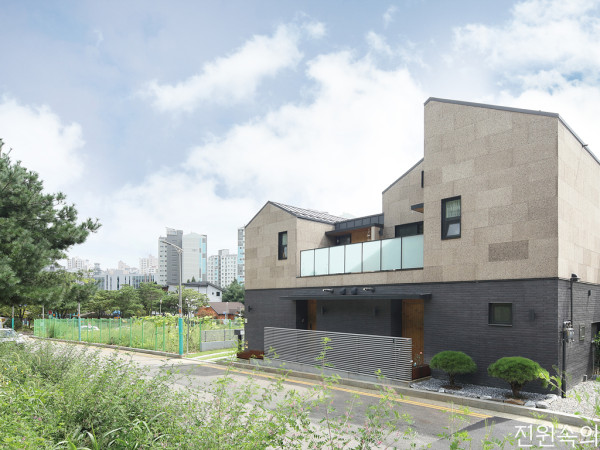 김해 가원정 佳園亭뛰놀기 좋아하는 해맑은 아이를 위해 결심한 집짓기. 불필요한 요소는 과감히 덜어내고 오롯이 가족에 집중해 주택을 완성했다.1 도로에서 본 주택 전경신도시로 급부상 중인 경상남도 김해시 주촌선천지구. 상가주택들이 즐비한 동네에 2층 단독주택 한 채가 놓였다. 이곳은 얼마 전 오픈하우스를 마치고 입주 준비에 한창인 건축주 정경환 씨 가족의 새 보금자리로, 대지는 지구 단위 개발이 지연되던 2015년, 앞으로 호재가 있을 것이라는 판단하에 그가 투자 목적으로 구매한 것이었다.“다들 상가주택 입지에 왜 단독주택을 짓는지 궁금해하더라고요(웃음). 처음엔 계획대로 매매를 고려했는데, 우리집을 꼭 지어야만 할 명분이 생겼죠.”2 심플하게 정돈한 후면부. 다양한 매스의 조합이 건물에 리듬감을 부여한다.3 세라스킨, 에버아트보드 등 여러 가지 외장재로 마감된 입면. 정면에는 석재 데크를 두어 활용도를 높였다. 기초 데크와 주택 사이에는 100mm 압출법(XPS)단열재를 시공해 열교 현상을 차단했다.그 이유는 바로 하나뿐인 소중한 아들 때문. 아파트 생활을 하는 동안 가끔 아이가 뛸 때마다 층간소음으로 불편함을 호소하는 이웃에게 더는 폐를 끼칠 수 없었고, 아이 또한 앞으로 누구의 눈치도 보지 않고 마음껏 집 안 곳곳을 누볐으면 하는 바람이었다.이후 경환 씨는 CM 업체를 통해 추천받은 시공사 ‘그린홈예진’을 만나 내진성능과 단열 등에 강점을 지닌 스틸하우스로 공법을 선택하고, 아이에게 놀이터 같은 집을 선물해 주고 싶었던 간절한 마음을 담아 집짓기 여정을 시작했다.POINT1 에버아트보드패널 위 특수 공법으로 시트를 입힌 알루미늄 보드. 내구성이 우수하고 다양한 패턴으로 출시되어 디자인에 따른 선택의 폭이 넓다.POINT2 전동블라인드버튼 하나로 제어 가능한 전동블라인드가 곳곳에 설치되었다. 특히 창호 내장형은 에너지효율이 높고, 쾌적한 실내를 만든다.POINT3 실내 그네설계 때부터 반영하여 복도에 만들어준, 아들이 가장 좋아하는 그네. 집 자체가 아이에겐 큰 놀이터가 된다.4 아이가 마음껏 뛰놀 수 있도록 마당을 넓게 계획했다. 데크 앞 수공간은 가족의 온전한 휴식처가 되어준다.HOUSE PLAN대지위치▶ 경상남도 김해시 대지면적▶ 604.30㎡(182.80평)건물규모▶ 지상 2층거주인원▶ 3명(부부 + 자녀 1)건축면적▶ 120.51㎡(36.45평) 연면적▶ 147.51㎡(44.62평)건폐율▶ 19.94% 용적률▶ 24.41% 주차대수▶ 2대 최고높이▶ 7.59m구조▶ 기초 – 철근콘크리트 매트기초 / 지상 – 스틸하우스 140SL10 아연도금 처리된 스틸스터드 KSD 3854(벽), 90TC10(지붕)단열재▶ 벽 – 그라스울 R19, 100mm 비드법보온판 가등급 / 지붕 – 그라스울 R30, 50mm 비드법보온판 가등급외부마감재▶ 벽 – 세라스킨, 에버아트보드(포인트) / 지붕 – 포스맥 담장재▶ 디자인 블록창호재▶ 엔썸 T/S·T/T 47mm 3중유리(1등급), 엔썸 애드온 전동블라인드 열회수환기장치▶ 경동 나비엔 에어원설계▶ 최부용갤러리하우스 010-4575-8231시공▶ 그린홈예진 1833-4956 www.yejinhouse.comINTERIOR SOURCE내부마감재▶ 벽 – LG하우시스 실크벽지 / 바닥 – 동화자연마루 나투스진욕실 및 주방 타일▶ 호림 수전 등 욕실기기▶ 동서 이누스주방 가구·붙박이장▶ 에넥스 조명▶ 비춤라이팅계단재·난간▶ 오크디딤판 + 강화유리 난간현관문▶ 커널시스텍 중문·방문▶ 영림임업 데크재▶ 석재 데크5 현관은 충분한 수납공간과 낮은 벤치로 실용성을 더했다.6 높은 층고와 전면창으로 시원한 공간감을 선사하는 거실. 특히 차 마시는 걸 좋아하는 부부를 위해 주방 및 식당과 연계된 평상을 계획하여 집에서도 여유로운 시간을 보낼 수 있도록 했다.집이 들어설 터는 신도시인 만큼 대지 분할 및 정리가 모두 이뤄진 상태였다. 설계 초기엔 단층을 고려했으나, 땅의 효율성을 생각해 주요 생활 공간은 1층에 두고 2층에 일부 실을 배치하는 방향으로 가닥을 잡았다.설계를 맡은 ‘최부용갤러리하우스’ 최부용 대표는 “전체적으로 밝고 따뜻한 분위기를 중요한 요소로 여긴 가족의 바람에 상응하고자 거실과 주방의 창을 크게 계획하고 다채로운 공간 연출에도 주안점을 두었다”고 설명했다.SECTION1 현관 2 거실 3 주방 4 다도공간 5 다용도실 6 창고 7 전실 8 욕조 9 파우더룸 10 드레스룸 11 안방 12 아이방 13 포치 14 테라스 15 가족실 16 베란다PLAN1F – 120.51㎡2F – 27.00㎡7 2층으로 오르는 계단실 모습. 계단 옆 문을 열면 자칫 버려질 수 있었던 공간을 활용한 창고가 자리한다. 계단실을 중심으로 좌측에는 안방과 아이방, 욕실 등 사적인 공간이, 우측에는 거실과 주방 등 공적인 공간이 배치되었다.8 사용자의 편의를 배려해 구성한 주방그렇게 세 식구의 집은 까다로운 지구단위계획지침에 몇 번의 수정과 변경을 거쳐 차분한 포인트 컬러가 돋보이는 모던한 모습으로 완성되었다.건물은 세라스킨, 에버아트보드 등 다양한 외장재를 적재적소에 적용해 성능과 멋을 동시에 챙겼다. 또한, 야외활동을 위한 정원을 넓게 구획하고 수공간과 석재 데크, 텃밭 등을 더하여 온전한 가족만의 힐링 공간을 구성했다.9,10 전실을 통해 각 실을 연결한 순환 동선