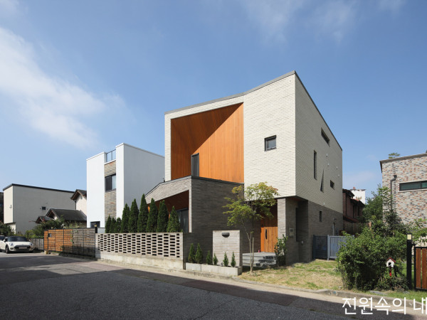 따뜻한 집을 최우선으로 생각하며 결정했던 목조주택. 아파트에 살 때보다 훨씬 줄어든 난방비를 보며 그 선택이 옳았음을 다시금 되새긴다는 가족의 집은 시간이 지날수록 자연스러움을 더하며 마을 속에 녹아든다.1,2 다양한 집들로 둘러싸인 단지 내에서도 유독 눈에 띄는 주택이 바로 세 식구의 보금자리. 점토 벽돌과 콘크리트 벽돌, 적삼목 무절 사이딩 등 다른 소재의 마감재가 서로 잘 어우러져 집의 외관에 입체감을 더한다. 벌써 지어진 지 2년이 넘었지만, 소재 특성상 여전히 잘 관리된 모습이다. 2번 사진 ⓒ남궁선중정을 품은 특별한 집이 되기까지신도시 단독 주택지에 지어지는 주택들은 건축주의 바람과 달리 의외로 프라이버시 확보가 쉽지 않다. 대지의 모양과 크기가 대부분 비슷해 각 집들이 충분히 이격되기 어렵고, 넓은 마당을 가지고 싶지만 그런 여건이 가능한 땅을 찾기도 힘들다.3,4 새로 증축한 별채는 본채와 닮은 고깔 모양의 높은 지붕을 가진다. 3평 정도의 아담한 공간이지만, 4m의 층고와 작은 천창이 있어 시원한 공간감이 느껴진다. 창은 폴딩도어로 하여 별채 안으로 외부 공간이 적극 연결되도록 했다. 벽을 백색 페인트로 마감하고 지붕의 컬러강판도 화이트로 택해 지붕과 벽체가 일체감 있는 하나의 매스로 보여진다.이직 후 직장과 가까운 곳으로 집을 알아보다 대지를 마련하게 된 건축주 역시 이런 고민을 가지고 오피스경 권경은 소장을 찾았다.“위요감 있는 외부 공간을 어떻게 확보하느냐가 하나의 과제였고, 나름의 해법을 찾은 것이 중정형의 집이었어요. 대신 일반 중정 주택과 달리 집 안에 중정을 품는다는 개념으로 설계를 시작했죠.”5,6 1층 양 끝에 식재를 심어 외부로부터의 시선을 걸러주는 작은 정원을 두었다. 덕분에 내부에서는 두 정원을 함께 마주할 수 있다.먼저 1층을 도로와 직각이 아닌 사선으로 만나도록 했다. 이렇게 만들어진 사다리꼴의 두 외부 공간 중 도로와 접한 곳은 입구와 주차장을, 대지 안쪽 인접 대지에 면한 곳은 작지만 아늑한 가족만의 마당을 두었다.그리고 2층은 ‘ㄷ’자의 평면으로, 매스가 감싸는 중앙을 마당이 아닌 비워진 실내 공간으로 계획하여 마치 중정처럼 빛 잘 드는 높은 층고의 거실을 완성해주었다.SECTION① 현관 ② 거실 ③ 다락 ④ 별채 ⑤ 주방 ⑥ 침실HOUSE PLAN대지위치경기도 용인시 |대지면적223.2㎡(67.51평)건물규모지상 2층 |거주인원3명(부부 + 자녀 1)건축면적97.49㎡(29.49평) |연면적148.63㎡(44.96평) – 별채(10.25㎡) 포함건폐율43.67% |용적률66.59% |주차대수1대 |최고높이8m구조기초 – 철근콘크리트 매트기초 / 지상 - 경량목구조 외벽 2×6 구조목 + 내벽 S.P.F 구조목 / 지붕 - 2×8 구조목 |단열재그라스울 24K외부마감재벽 – 점토 벽돌, 콘크리트 벽돌(두라스택 큐블록), 적삼목 무절 사이딩, 시멘트 사이딩 / 지붕 - 컬러강판담장재두라스택 큐블럭 S시리즈 |창호재케멀링 PVC |에너지원도시가스내부마감재도장, 강마루, 포세린 타일 |욕실 및 주방 타일윤현상재 수입 타일수전 등 욕실기기아메리칸스탠다드주방 가구·붙박이장희원디자인 |조명필립스계단재·난간오크 집성목 + 평철 난간 |현관문YKK |방문영림도어 |데크재방킬라이시공브랜드하우징설계오피스경 권경은02-725-7758 http://okarchitecture.com총공사비 약 3억원(설계비 및 인테리어 제외)7 집의 첫인상을 좌우하는 만큼 깔끔하게 정돈된 현관8 현관에서 들어와 마주하게 되는 유리 난간의 계단. 계단 좌측으로 주방과 다이닝룸, 우측으로 거실이 자리한다.9 외부 공간과 연결되는 거실 한쪽 벽에는 갤러리 레일을 설치해 감각 있는 아트 작품을 걸 수 있도록 했다.PLAN1F – 77㎡ 2F – 61.38㎡① 현관 ② 거실 ③ 주방/식당 ④ 화장실 ⑤ 다용도실 ⑥ 별채 ⑦ 침실 ⑧ 드레스룸 ⑨ 욕실10,11 채광 좋은 곳에 배치된 다이닝룸과 주방. 주방은 넓고 긴 아일랜드와 빌트인 장을 활용해 넉넉한 수납공간을 확보했고, 덕분에 쾌적한 공간이 완성되었다.살면서 바꿔 가는 가족만의 주택 생활세 식구에게 필요한 실만으로 채운 연면적 40여 평의 2층 주택. 층별로 철저히 기능을 분리해 1층은 공용 공간인 주방과 거실, 2층은 사적 공간인 부부 침실과 딸의 방으로 꾸몄다.12 2층까지 오픈된, 높은 천장고의 실내. 사생활을 고려해 2층 높이에 설치한 큰 창은 거실로 충분한 빛을 끌어들이며 밝은 내부 공간을 조성해준다. 지형으로 인해 생긴 주방과 거실의 단차는 두 영역을 분리하는 동시에 공간적 재미를 더하는 효과를 주었다.모노톤의 깨끗한 배경의 집이 지루하지 않게 느껴지는 건 집 안 곳곳의 남다른 요소들 덕분. 대지의 형태를 그대로 살려 주방과 단차를 둔 거실, 두 층을 연결하는 유리 난간의 계단, 인접한 집에 영향을 받지 않도록 2층 높이에 둔 창 등으로 인해 밋밋함은 덜어내고 디테일을 살릴 수 있었다.13 2층으로 오르는 계단에서 바라본 풍경. 적재적소에 둔 창 덕분에 실내 깊숙이 빛이 든다.14 전반적으로 심플한 분위기를 유지한 부부 침실. 거실 쪽으로 조그마한 창을 내어 맞은편 아이방을 포함해 아래층과의 소통도 가능토록 했다.15 세면대를 중심으로 양쪽에 샤워실과 화장실을 