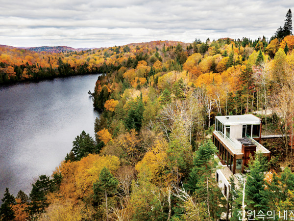 다양한 세계 주택 만나보기 9탄_ DANS L'ESCARPE-MENT캐나다에서 두 번째로 큰 도시, 퀘벡주의 몬트리올. 그곳에서 1시간 반 남짓 이동하면 가을 정서로 물든 나무들과 맑은 호수를 품은 우거진 숲이 눈앞에 펼쳐진다. 그 숲속 가파른 절벽 위에 위치한 이 집은 ‘Dans L'Escarpement’, 프랑스어로 급경사를 뜻하는 이름대로 절벽에 매달려 있는 독특한 형태로 자리 잡았다.제법 탐나는 위치에 집을 지은 건축주는 주변 환경에 방해받지 않으면서 이 절벽과 언덕에 어울리는 집이 완성되길 바랐다. 그가 원한 대로 멀리서 바라본 이 주택은 아름다운 자연 풍광에 폭 안긴 듯 주변 경관에 녹아들었다.절벽과 가까운 탓에 건축물이 들어서기가 쉽지는 않았다. 먼저 땅과 경사면에 미치는 영향을 줄이기 위해 가로와 세로로 된 두 개의 노출콘크리트 박스를 주축으로 집을 설계했다. 주택의 1층은 손님들이 머물다 가는 숙소 공간으로, 집의 중심을 잡는 2층은 작은 사무실을 포함한 공용 공간이 마련되었다. 맨 위 작은 블록의 3층은 건축주의 개인 공간으로 구성했다.가로와 세로 박스 사이에 놓인 야외 미니 풀장과 테라스세로 박스 1층의 스파 & 사우나 공간. 오른편의 사우나와는 유리 파티션으로 공간을 나누었다.HOUSE PLAN대지위치▶ 캐나다 Saint-Faustin-du-Lac-Carré 연면적▶ 300m²(90.75평) 설계▶ YH2 Architecture2층에 들어서면 보이는 주방의 모습. 필요한 가구만 들여 간소하게 배치했다.2층 계단 옆 공간엔 건축주의 작은 사무실이자 서재 공간을 마련했다.특히 1층은 사용 목적에 따라 콘크리트 박스의 구획이 나뉜다. 먼저 가로 박스는 손님이 머물 게스트 룸으로 3개의 침실과 화장실 그리고 기계실이 있다. 몇 미터 떨어진 세로 박스와는 2층 하부를 천장으로 둔 외부 통로가 유기적인 역할을 하고 있는데, 이 외부 공간에 작은 풀장과 테라스를 놓아 자연과 마주하며 산림을 즐길 수 있는 환경으로 꾸몄다. 그 옆으로 이어진 세로 박스에는 스파와 사우나를 배치해 건축주와 손님 모두 묵은 피로를 풀고 휴식을 취하는 힐링 공간을 마련했다.이 집의 중심 역할을 하는 길게 트인 2층 공용 공간. 전면 유리창을 통해 자연 풍경이 그대로 들어온다.건축주의 개인 공간인 3층과 차고를 연결하는 다리. 안개가 자욱하게 끼는 날이면 공중을 걷는 듯한 체험을 할 수 있다고.이 집의 중앙 출입구는 특이하게도 건축주의 개인 공간인 3층에 있다. 주택보다 조금 높은 능선에 차고지가 있어 이와 직접 연결되는 입구 역할을 3층이 하게 된 것. 직선으로 쭉 뻗은 경량 다리 구조물을 통해 차고와 집을 연결하는 방식을 택했다.절벽 위에 짓는다는 어려운 조건에서도 자연 그대로를 보존하려는 건축주와 건축가의 배려가 돋보이는 주택. 그래서인지 어떠한 이질감도 없이 한 폭의 그림처럼, 자연스럽게 그 자리에 물들었다.구성_이래현 | 사진_Maxime Brouilletⓒ 월간 전원속의 내집 /www.uujj.co.kr월간 <전원속의 내집> 의 기사 저작권은 (주)주택문화사에 있습니다. 무단전재, 복사, 배포는 저작권법에 위배되오니 자제해주시기 바랍니다.