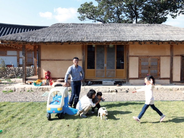 v\:* {behavior:url(#default#VML);} o\:* {behavior:url(#default#VML);} w\:* {behavior:url(#default#VML);} .shape {behavior:url(#default#VML);} <![endif] -->한국농촌건축대전 본상에 이어 대한민국 신진건축사대상 우수상을 차지한 은재네 돌담집. 나와 내 가족이 살 집이 아니라 온 동네 아이들이 모여 놀 수 있는 도서관을 지었다는 그 집엔, 도대체 어떤 이들이 살고 있을까? 초가집과 고택, 돌담이 있는 고즈넉한 마을에서 신현민, 권윤자 부부와 딸 은재, 아들 우철이를 만났다. v\:* {behavior:url(#default#VML);} o\:* {behavior:url(#default#VML);} w\:* {behavior:url(#default#VML);} .shape {behavior:url(#default#VML);} <![endif] -->취재 조고은 사진 변종석새로 지은 도서관과 작업실. 그 사이로 은재네 초가집이 보인다. v\:* {behavior:url(#default#VML);} o\:* {behavior:url(#default#VML);} w\:* {behavior:url(#default#VML);} .shape {behavior:url(#default#VML);} <![endif] -->조선시대 전통가옥의 모습을 그대로 간직한 곳, 경북 예천 금당실 마을에 가면 골목골목이 즐겁다. 나지막한 돌담 너머로 보이는 초가집과 세월이 고스란히 느껴지는 고택의 정취가 가을내음과 어우러져 코끝을 간질인다. 마을로 들어서 가볍게 걷다 상쾌한 공기에 숨을 크게 한번 들이마시고 나면, 마을회관에 다다르기 전 은재네 돌담집을 만날 수 있다. 아담한 두 채의 목조주택은 새로 지은 집이지만 벌써 마을 풍경에 제법 자연스럽게 녹아난다.이곳엔 2년 전 귀농한 신현민, 권윤자 부부와 7살 난 딸아이 은재, 지난 8월 첫돌을 맞은 아들 우철이가 산다. 얼마 전 2014 한국농촌건축대전과 대한민국 신진건축사 대상을 휩쓸었다는 목조주택은 한 채는 벌꿀 전시·작업실, 나머지 한 채는 마을 아이들이 자유롭게 드나들 수 있는 도서관으로 쓴다. 두 건물을 잇는 데크를 지나 안쪽으로 들어가면 초록 잔디가 깔린 안마당과 초가집 두 채가 자리하는데, 바로 정면에 보이는 안채가 네 가족이 주로 생활하는 공간이다. 별채는 민박집으로 쓰는데, 아직 정식으로 운영하는 것은 아니고 동네 민박집에 남는 방이 없을 때 종종 소개받아 오는 손님이 있는 정도다. “도시에서 일하며 아이를 키우는 건, 엄마로선 너무 어려운 일이더라고요.”윤자 씨가 두 사람의 고향인 예천으로 귀농하자 마음먹고 현민 씨에게 제안하게 된 데에는 은재에 대한 미안함이 컸다. 대구에서 만나 결혼한 부부는 줄곧 대구에 있는 아파트에서 생활했다. 맞벌이였던 터라, 엄마·아빠가 모두 일하러 가고 나면 은재는 보모의 손에 맡겨졌고, 어린이집에 있다가 저녁이 되면 보모나 퇴근한 부부가 데려오곤 했다. 그러던 어느 날은 서로 사인이 맞지 않아 아무도 은재를 데리러 가지 않은 일이 터졌다. 윤자 씨는 놀라서 부리나케 아이를 데리러 갔고, 은재는 모두가 집에 가고 딱 하나 불이 켜져 있는 방에 선생님과 단둘이 남아있었다. 지금은 웃으면서 이야기하지만, 엄마는 그 일이 아직도 가슴 아프다.그 길로 현민 씨가 1년 먼저 예천 부모님 댁에 내려와 양봉 일을 익히고, 그동안 윤자 씨는 혼자서 은재를 돌보며 일을 했다. 당장은 그게 경제적으로도 안정적일 거라는 판단에서였다. 하지만 엄마와 오랜 시간 떨어져 지내는 생활에 은재가 너무나도 힘들어했고, 아이를 봐주던 분까지 이사를 하게 되자 윤자 씨는 아이를 먼저 아빠가 있는 예천으로 보냈다. 그리고 한두 달 후, 하던 일을 마무리하고 윤자 씨까지 내려온 것이 귀농 생활의 시작이었다.“주말마다 시댁에 오가면서 이 동네가 참 좋았어요. 전통마을이라 매물로 나오는 집이 잘 없는데, 마침 초가집 두 채에 넓은 흙 마당이 있는 이 집이 나왔죠. 초가집이라도 잘 살면 되지, 했는데 막상 살아보니 생각보다 훨씬 더 큰일이더군요(웃음).”특히 초가집은 지붕을 매년 새로 이어서 얹어줘야 한다. 현민 씨는 벌들이 겨울을 나는 동안 마을 주민들과 함께 초가지붕을 잇는다. 손으로 새끼를 꼬아 초가지붕을 만들어왔던 마을 어르신들에게 전통 기술을 직접 전수받았는데, 그는 이렇게 이은 전통 초가지붕이 주변 지역에 판매되기도 한다며 어깨를 으쓱한다. 이렇게 금당실 마을에 자리 잡는 동안 은재는 온 동네를 누비며 전보다 더 명랑해졌고, 작년 여름엔 둘째 우철이가 태어났다. 부부가 처음 이 집을 샀을 때, 집에는 ‘농촌 유학’을 온 아이와 엄마가 세 들어 살고 있었다. 그 후 1년이 조금 넘도록 이들은 별채에서, 은재네는 안채에서 함께 살았는데, 주말마다 내려와 머물다 가던 아이의 아빠가 바로 은재네 돌담집을 지어준 201건축사사무소 대표 현상훈 씨다. 집이 좁아 공간이 더 필요하다 생각하던 부부는 상훈 씨에게 ‘가시기 전에 집 한 채 지어 달라’ 부탁했다. 당시 부부가 요청한 것은 살림집이 아닌, 꿀을 포장하고 판매도 할 수 있는 작은 공간과 동네 아이들이 모여 책을 읽으면서 놀 수 있는 공간이었다. “은재가 보던 책이 많은데 이걸 혼자 보기도 아깝고, 둘째가 있어 어디 가져다주기도 어려운 상황이어서 도서관을 만들면 딱 좋겠다 생각했어요. 요즘 시골은 옛날과 달라서 아이들이 많지 않아 밖에 나가서 놀 때 걱정되기도 하고요. 또, 여기에선 엄마들이 아이를 데리고 외출하려고 해도 춥거나 비올 