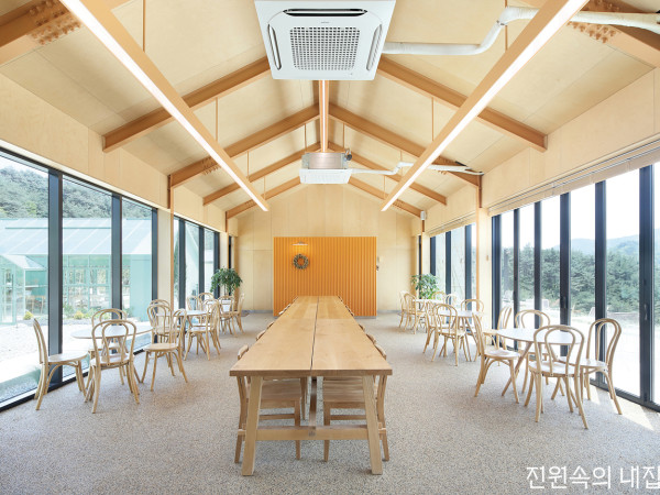 자연 속에서 풍경을 담기도, 풍경이 되기도 하는 건축. 단순하지만 단정한 멋으로 사람들의 발길을 재촉한다.단순함 속에 숨어 있는 건축 디테일밀도 높은 도심을 피해 교외를 찾아 나서는 요즘, 청주 효촌리 고즈넉한 마을에 넓은 정원을 품은 카페 하나가 들어섰다. 마치 갤러리를 연상시키는 건물의 설계자는 스타일랩 건축사사무소의 안응준 소장.“3km 떨어진 외곽도로에서 봐도 이질감이 느껴지지 않도록, 건물이 산의 능선을 파괴하지 않도록 배치와 ‘선(線)’에 각별히 신경 썼습니다.”그의 말처럼 진입로에서 보기에는 일반 주택과 비슷했던 폭의 건물이, 돌아들어서자 너른 품을 펼쳐 보이며 새로운 공간감을 선사한다. 덕분에 동네 풍경을 해치지 않는 간결한 매스 속에 단정한 직선, 긴장감을 주는 사선, 부드러운 아치 등 숨어 있는 디테일을 찾는 재미가 있다.2,3 땅에 순응하듯 지하층을 삽입해 자연스럽게 경사지에 녹아든다. 층마다 강조되는 재료와 색상이 달라 지루하지 않은 한편, 전체적으로는 차분한 톤앤매너를 유지한다.세 필지를 합한 경사지에 순응하듯 앉혀진 카페. 각 층에 입혀진 외장재 역시 허투루 쓰이지 않았다. 주차장과 목공방이 자리한 지하층은 환영하는 느낌의 루버월, 1층엔 매스감을 살리는 브론즈 유리 커튼월, 하늘과 맞닿은 2층은 펄이 들어가 화사하면서도 반짝거리는 미장스톤이 각각의 자리에서 제 역할을 충실히 수행한다.HOUSE PLAN대지위치 ▶ 충청북도 청주시 남일면 효촌리 77-2 대지면적 ▶ 1,777㎡(537.54평) | 건물규모 ▶ 지하 1층, 지상 2층 건축면적 ▶ 286.07㎡(86.53평) | 연면적 ▶ 728.92㎡(220.49평) 건폐율 ▶ 16.09% | 용적률 ▶ 27.28% | 구조 ▶ 철근콘크리트 단열재 ▶ 난연 가등급 비드법보온판 | 외부마감재 ▶ 미장스톤 창호재 ▶ 고효율 단열인증 커튼월 | 조경 ▶ 더숲 | 전기·설비 ▶ 오주명 전기·통신공사 ▶ ㈜대원전력 윤종수 010-7558-4110 | 소방 ▶ ㈜경원소방 구조설계 ▶ ㈜바로구조 기술사사무소 민정규, 윤진용 시공 ▶ ㈜대성건설 031-8015-5559 (현장소장 구수문 010-7115-0234) 설계 ▶ 스타일랩 종합건축사사무소INTERIOR SOURCE내부마감재 ▶ 벽 - 노루표 투명 에폭시페인트, 친환경 수성페인트 / 바닥재 : 영광폴리싱 콘크리트 폴리싱 마감 욕실 및 주방 타일 ▶ 아이에스동서 수전 등 욕실기기 ▶ 빈센트글로벌 prestone, 릭실코리아 | 주방 가구 및 붙박이장 ▶ 월광산업 | 조명 ▶ ㈜나스필코리아, ㈜화승라이팅 계단재·난간 ▶ 철재 난간(현장 제작 및 설치) 출입문 ▶ ㈜태성자동문(주출입), ㈜태양세이프도어 단열프레임 + 단열세이프도어(부출입), ㈜제일방화문 고효율 일반단열문(갑종방화문) 데크재 ▶ 성원 그린워시SECTION① 주차장 ② 목공방 ③ 선큰 ④ 카페 ⑤ 중정 ⑥ 사무실PLANB1F – 243.15㎡ 1F – 265.93㎡ 2F – 218.88㎡4 긴 우드 테이블을 중심으로 삼은 레이아웃. 인테리어는 작은딸 이환은 씨가, 실내에 배치된 테이블은 모두 남편 이종호 씨가 만들었다.음악과 미술, 목공과 커피의 공존이 공간의 주인은 인테리어 사업을 했던 아내 김연실 씨와 지역에서 학생들을 가르칠 정도로 목공에 일가견이 있는 남편 이종호 씨 부부. 큰딸은 바이올린을 켜고, 작은딸은 엄마를 이어 인테리어를 할 정도로 가족 전체가 예술에 직·간접적으로 연결되어 있다. 그래서 이 카페 역시 평소에는 식음료를 판매하지만, 특별한 날에는 1층 평상이 무대가 되어 연주회를 열거나 2층은 청주 지역 젊은 작가들의 전시장이 되도록 설계단계부터 치밀하게 계획했다.5 건물 둘레 창가를 따라 배치된 자리와 긴 테이블 외에 평상 스타일의 공간도 마련했다. 때론 미니 콘서트장이 되기도 하는 곳으로, 산을 형상화한 벽화는 이환은 씨가 직접 그렸다.INSTAGRAM SPOT!SPOT 1 곡선의 중정 곡선 중정이 만들어내는 드라마틱한 빛과 그림자. 미러월(Mirror Wall)과 공작 단풍 사이에서 한 컷! SPOT 2 풍경을 담는 프레임 바깥을 향해 탁 트인 전망이 펼쳐지는 2층 테라스. 시선의 확장을 위해 전기선 지중화공사까지 감행했다. SPOT 3 운치 있는 정원 볕이 좋은 날은 실내보다 정원이 더욱 인기있다. 면적이 넓고 풍경이 좋아 야외 결혼식 문의도 많다는 후문.6 모처럼 한자리에 모인 가족이 단란한 시간을 보내고 있다.7 전체적으로 노출콘크리트와 화이트 톤을 바탕으로 삼았지만, 카운터와 베이커리 공간은 블랙으로 마감했다.문화를 담는 그릇으로서의 공간이라 인테리어 역시 섬세한 손길이 필요했다. 인테리어를 맡은 작은딸 이환은 씨는 “사람들이 여기 오는 건 도심을 벗어나 자연 속에서 여유를 누리기 위해서라고 생각했어요. 처음 건축을 봤을 때 ‘1층은 땅과 산, 2층은 하늘’이라 해석하고 평상, 정원, 천장 디테일 등 자연 조건을 극대화하는 디테일에 주목했어요.”라며 내부를 소개했다.8,9 2층 한쪽 벽에 전시를 기획할 수 있도록 마이너스 몰딩과 픽처레일을 설치했다. 분리된 실에는 할아버지 댁에서 가져온 천장 구조물을 새로 칠해 달았다.카페의 이름인 에클로그(ecologue)는 서정적인 ‘전원시(田園詩)’를 뜻한다. 자연 속에 펼쳐진 시적인 공간에 어울리는 이름이다. 동시에 단어 속에 담긴 나무(log)는 