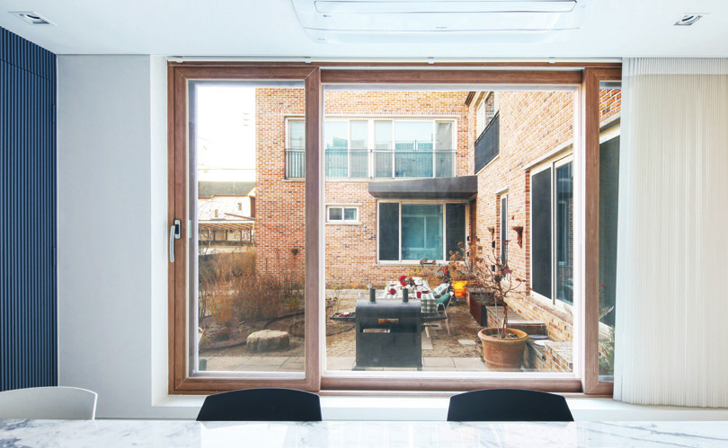 주방에서 바라본 정원의 모습. 옆의 다용도실은 정원의 벽돌 계단과 바로 연결돼 야외 파티를 할 때 편리하다.