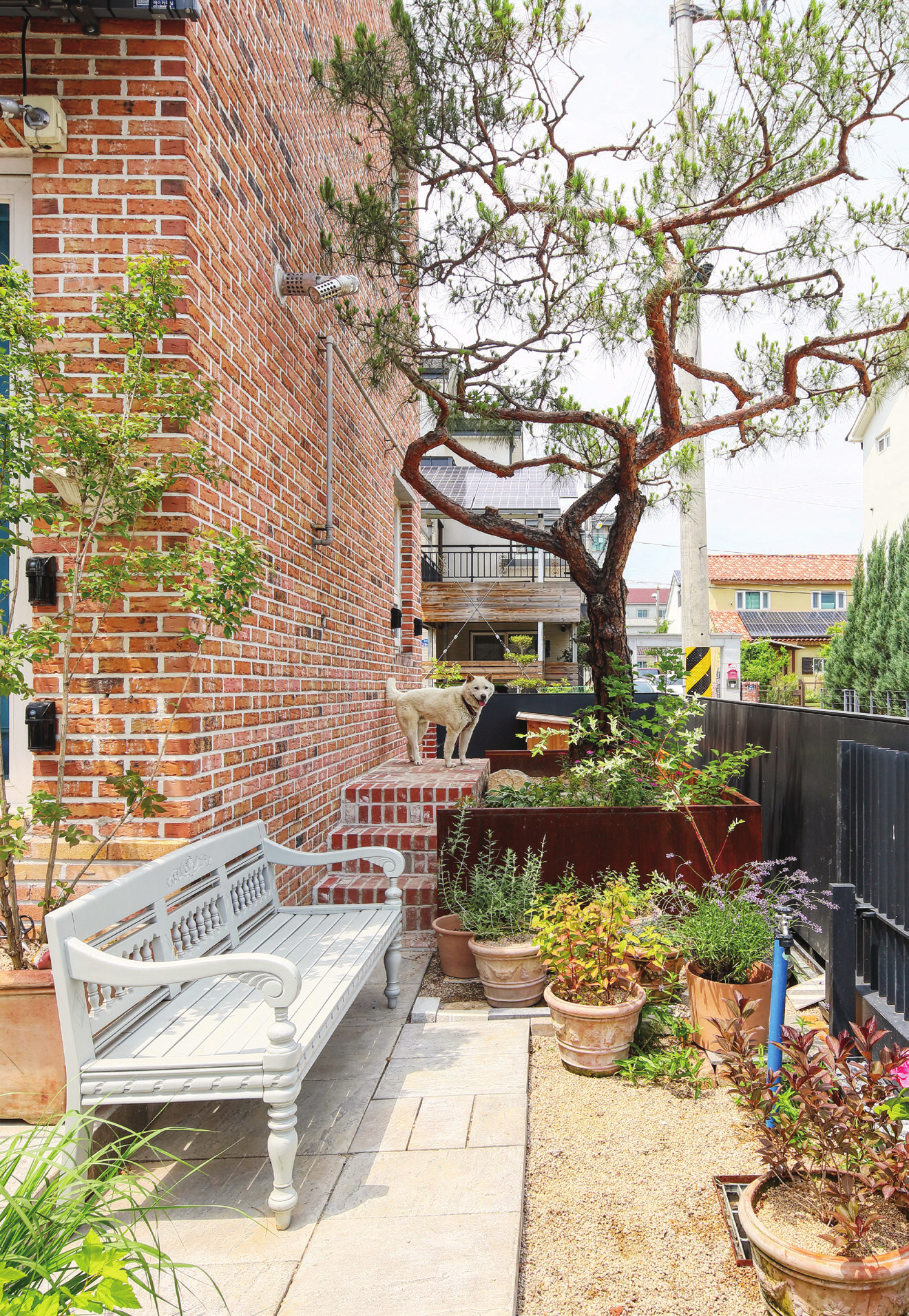 이전 정원에 심겨 있었던 소나무는 땅을 깊이 파기 어려워, 높이 1m의 철판을 덧대어 플랜터를 만들어 심었다. 단차가 생긴 공간에는 진돗개의 집과 계단을 만들어 반려견이 가장 좋아하는 공간이 되었다.
