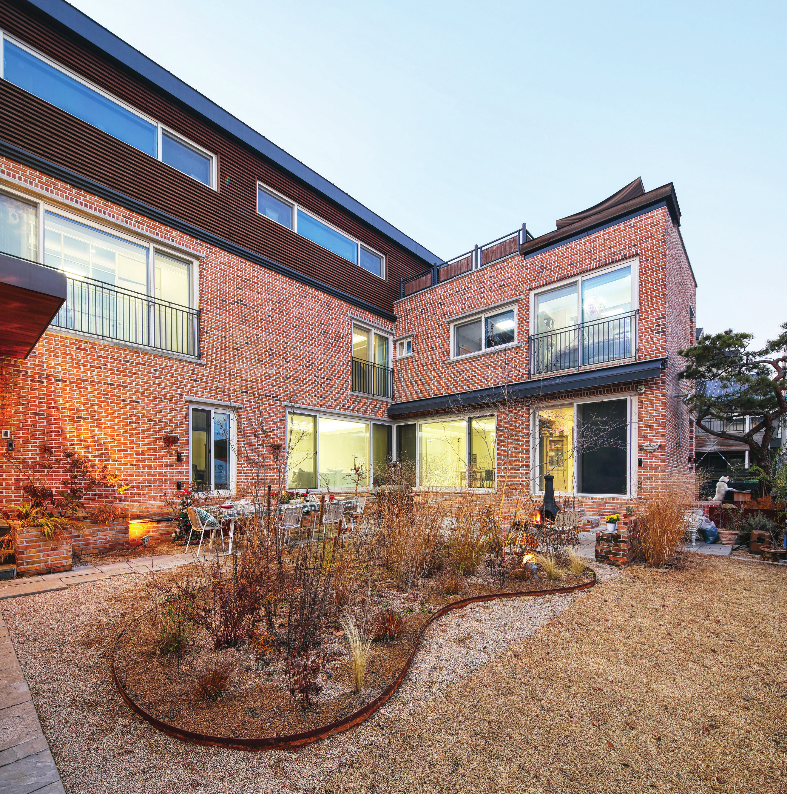 좁은 면적에 정원을 조성할 때, 전형적으로는 벽면 혹은 가장자리에 정원을 두지만 이 집은 오히려 마당의 중앙에 정원 공간을 배치하여 평범하지 않고 독특한 정원 디자인을 완성했다. 우선 주택 높이에 맞추어져 있었던 정원의 지면을 도로면에 맞게 낮추었고, 중앙에 심겨있던 큰 규모의 소나무와 베롱나무를 바깥쪽으로 옮겼다. 바깥쪽 공간들을 활용하기 위해 건물을 따라 벽돌 화단, 벤치, 계단 등의 기능적인 공간들을 만들었다. 중앙 정원은 유연한 곡선을 활용한 부정형의 아메바 구조로, 바라보는 위치에 따라 곡면의 형태와 식물의 배치가 다르게 보여 지루하지 않다. 한 쪽 코너에는 지붕이 없는 휴식공간인 파티오를 조성해 테이블 등을 두어 야외 활동이 가능한 공간을 만들었다. 나무로 된 데크를 주로 사용하지만, 사후 관리가 용이하고 색감이 좋은 석재나 시멘트를 사용해 색다른 분위기를 냈다. 활기찬 여름 밤의 파티도, 난로를 피우고 즐기는 낭만적인 겨울 파티도 모두 어울리는 파티 정원이 탄생했다.