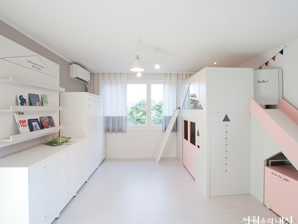 하얀 도화지 위 가족의 이야기가 따뜻하고 깨끗하게 묻어나는 집. 엄마·아빠가 선물한 넓은 놀이공간에서, 아직 어린 두 아이는 꿈과 상상력을 무럭무럭 키워간다.글 김재화 구성 조고은 사진 김주원▲ 아이방 침대와 미끄럼틀의 맞은편에는 기성품 수납장을 같은 모듈로 두고 숫자 레터링으로 서랍 정돈에 질서를 더했다. 커다란 책꽂이는 자주 쓰는 물건들을 정리해둘 수 있다.평창동 한적한 주택가에 위치한 132㎡(약 40평) 빌라는 넓은 마당과 북한산의 경치가 거실에서 한눈에 들어온다. 담벼락에는 담쟁이넝쿨이 얽혀 있고, 귀뚜라미 소리와 새 울음이 창가에 넘실댄다. 서울에서 다른 사람의 시선을 의식하지 않고 탁 트인 주거공간을 누릴 수 있는 곳. 굳이 이 집을 선택한 이유는 ‘아이들과 함께하는 삶’을 위해서였다.이 집은 전체적으로 채광이 좋고, 창문이 담아내는 풍경들이 마치 그림처럼 걸려 있다. 이런 창문과 공간이 함께 어우러져 깨끗하면서도 청량한 느낌을 주는 공간, 자연과 소통할 수 있는 공간을 떠올리며 디자인했다. 특히 4인 가족의 구성원 중 자녀 두 명이 아직 유치원도 입학하지 않은 어린 나이였으므로, 집에서 놀이할 수 있는 공간에 초점을 두었다. 가장 큰 방을 안방으로 쓰지 않고 가족이 함께할 수 있는 놀이방으로 꾸민 것도 같은 이유다. 실내에 있는 모든 가구는 아이들이 다치지 않도록 섬세하게 신경 썼다. Kid’s room이 집의 주인공인 아이 방. 일반적인 마스터룸 구조로, 드레스룸과 화장실이 같이 연결되어 있다. 밝은 그레이 컬러를 기본으로 채도 낮은 핑크색을 더해 아이들의 밝고 경쾌한 느낌을 연출하고, 그레이&화이트 투톤컬러 커튼으로 벽과 가구의 톤을 자연스럽게 연출했다.작고 좁은 공간을 좋아하는 아이들의 심리를 반영하여 방 안에는 아이들만의 집을 만들어 주었다. 1층은 문을 달아 집의 구조처럼 만들어 주었고, 2층은 창문을 통해 아이들의 모습을 관찰할 수 있게 디자인하고 미끄럼틀을 두었다. 이 가구는 몇 년 후 아이들이 크고 나면 싱글 매트리스를 배치하여 2층 침대로도 활용할 수 있다. 이 가구의 또 다른 포인트는 ‘완벽한 수납’이다. 1층 집은 문을 만들어 부피를 많이 차지하는 장난감들을 정리할 수 있고, 미끄럼틀 하부 역시 숨어 있는 아이디어 수납공간이다. 아이들이 읽는 책을 모두 안 보이는 곳에 수납하여 놀이가 끝났을 때는 깔끔하게 정리할 수 있도록 했다. 또한, 아이들 몸집에 맞는 책상을 제작하여 사용하지 않을 때는 집어넣을 수 있다. Study room현관에서 집 안으로 들어서면 바로 서재를 마주하게 된다. 일하는 부부를 위한 공간으로, 하루를 마무리하거나 개인적 시간을 보낼 수 있는 장소다. 전체적인 분위기는 블랙으로 톤 다운시켜 집중도를 높였다. 서재에 있는 모든 그림이나 타이포그래피는 가족의 스토리를 담은 숫자와 글귀를 모아 특별한 의미를 더했다.Bedroom서재 옆으로는 침실이 있다. 오로지 건강한 수면과 독서습관을 위한 공간이다. 창문 너머 보이는 담쟁이넝쿨과 초록 나무들이 실내에 건강한 기운을 불러들일 수 있도록 집중했다. 패브릭의 부드러운 패턴과 질감이 군더더기 없고 깨끗한 침실 분위기를 자아낸다. 침대는 어린 자녀들과 함께 잘 수 있도록 큰 매트리스로 선택했고, 머리 부분에 키 낮은 책장을 두어 아이들과 편히 책을 읽다 잠들 수 있다.Bathroom침실 옆 작은 게스트 화장실. 화이트 톤의 타일을 기본으로 하고, 들어오자마자 정면에 보이는 창가에 세면대를 두어 풍경을 감상할 수 있게 했다. 세면대 하부에는 선반을 만들고 바스켓을 두어 수납공간을 만들었다. 공간에 재미를 더하는 사다리는 오브제 역할을 하는 동시에 수건과 책을 둘 수 있는 수납 역할을 한다.Livingroom화이트우드의 바닥 톤에 맞추어 거실 가구도 같은 컬러로 하여 공간이 확장되어 보이는 효과와 통일감을 주었다. 특별히 제작된 소파와 TV를 숨긴 장식장은 한결 정돈된 느낌을 더한다. 집 안에 있는 장식장 대부분은 사용하지 않을 때 문을 닫아 내용물이 보이지 않게 했고, 아이들이 모서리에 다치지 않도록 섬세하게 마감했다. 수납장 위 장식한 캔버스와 거울 액자에는 가족의 이야기가 담긴 텍스트가 나열되어 있다.Dining room & Kitchen다이닝룸과 주방은 소재와 오브제의 변화가 돋보인다. 거실에는 간접등만 설치하여 모던하고 심플한 느낌이지만, 식탁 위 펜던트 조명은 조형성이 돋보이는 디자인으로 포인트를 주었다. 천연대리석 소재의 식탁은 사람들을 집으로 초대해 모임을 즐기는 집주인의 라이프스타일을 반영하여 10인이 앉을 수 있는 사이즈로 제작했다. 주방은 화이트 톤의 주방가구와 그레이 타일을 사용하여 전체적인 공간의 밸런스를 맞췄다. 김재화 디자이너melloncolie fantastic space LITA(멜랑콜리 판타스틱 스페이스 리타)의 대표로, 공간과 사람의 소통이 이루어질 수 있는 작업을 하고자 한다. 재료의 물성을 살린 기본에 충실한 디자인을 추구하며, 프로젝트에 관련된 인테리어, 컨설팅, 네이밍, 그래픽 등을 함께 계획하여 진행하고 있다. 주요 작품으로는 1974 way home, LITA studio, 42M2, 호시노엔 쿠키스, 제니퍼소프트사옥