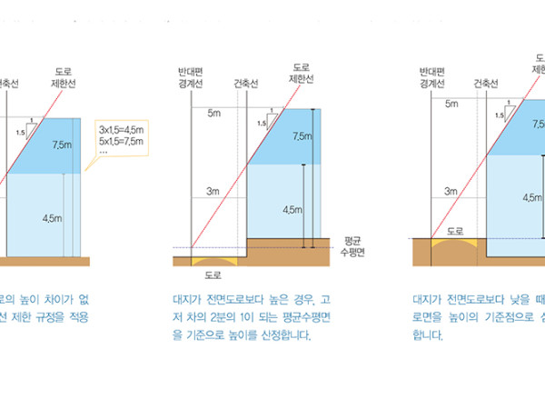 취재 조고은 ‘도로 사선제한’이란 도로 폭을 기준으로 건축물의 높이를 제한하는 것을 말합니다. 좁은 도로에서도 고층 건물을 무차별적으로 지어 주변에 피해를 주거나, 건축주의 임의대로 건물의 높이를 결정하여 주변 미관을 해치지 않게 하도록 정해놓은 법이지요. 현행 건축법에서는 허가권자가 ■가로구역을 단위로 하여 대통령령(건축법 시행령)으로 정하는 기준과 절차에 따라 건축물의 높이를 지정·공고할 수 있도록 하고 있습니다. 이때, 특별자치시장·특별자치도지사 또는 시장·군수·구청장이 가로구역의 높이를 완화하여 적용할 필요가 있다고 판단되는 대지에는 대통령령으로 정하는 바에 따라 건축위원회의 심의를 거쳐 높이를 낮출 수 있습니다. 특별시장이나 광역시장은 도시 관리를 위해 건축물의 최고 높이를 조례로 정할 수 있고요. 따라서 자신의 대지가 속한 지역의 건축조례를 먼저 찾아보는 것이 좋습니다. 만약 최고 높이가 정해지지 않았을 때에는 “건축물의 각 부분 높이는 그 부분으로부터 전면도로나 반대쪽 경계선까지의 수평거리의 1.5배를 넘을 수 없다”는 규정에 따라야 하는데, 이것이 바로 일반적으로 말하는 도로 사선제한입니다. 대지가 둘 이상의 도로, 공원, 광장, 하천 등에 접한 건축물은 해당 지방자치단체에서 정한 조례에 따르면 됩니다. 예를 들어, 서울특별시 건축조례 제34조에는 대지 둘레 길이의 8분의 1 이상 접한 도로 중에서 가장 넓은 도로의 너비, 그런 도로가 없는 경우에는 가장 많이 접한 도로의 너비를 적용하도록 하고 있습니다. 이처럼 도로 사선제한은 일조권 사선제한처럼 각 대지 상황에 따라 다양한 경우의 수가 나올 수 있으니 참고하시기 바랍니다.* 참고 _ 건축법 제60조(건축물의 높이 제한), / 건축법 시행령 제82조(건축물의 높이 제한) ■ 가로구역(街路區域) 도로로 둘러싸인 한 덩어리(일단, 一團)의 지역 ■ 건축선(建築線) 도로와 접한 부분에 건축물을 건축할 수 있는 선으로, 대지와 도로의 경계선 [건축법 제46조(건축선의 지정)] ※ 월간 <전원속의 내집> www.uujj.co.kr 본 콘텐츠의 저작권은 (주)주택문화사에 있으며, 이를 무단 이용하는 경우 저작권법 등에 따라 법적책임을 질 수 있습니다. [이 게시물은 전원속의내집님에 의해 2016-03-23 10:05:34 HOUSE에서 이동 됨]