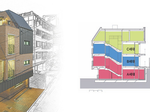 우리 시대 ‘집’의 가치가 변하고 있다. 혼란스러운 부동산 시장에서 진정한 내 집 마련의 의미, 그리고 정답은 아니지만 하나의 방법으로서의 가이드를 제시한다. 직접 땅을 사고 설계에서부터 시공까지 모든 과정을 직접 경험한 한 건축가의 집짓기 수기, 그 좌충우돌 분투기가 지금부터 펼쳐진다. 글 곽은선 건축가 정리 편집부 집 값 상승세의 종점이 머지않았음을 예측한 3년 전, 우리 가족은 내 집 마련을 위한 준비를 시작했다 한 아이의 엄마이자 야근과 철야를 밥 먹듯이 하는 일하는 여성, 그리고 온전히 우리의 힘으로 집을 마련해야 하는, 우리 주변의 평범한 가정 속에 내가 있다. 아이가 초등학교에 들어가고 이제 진짜 ‘내 집’을 마련해야 하는 시기가 왔고, 우리 가족은 아파트를 살 것인가 말 것인가 하는 고민에 빠졌다. 설계를 하는 건축가로서 획일적인 아파트는 이미 예전부터 그 가치 이상의 과잉가격으로 거래되고 있다고 생각해 왔다. 설령 지금 아파트를 사더라도 30년 후 배관이 낡거나 내외부가 노후화되어 리모델링이나 재건축을 하게 된대도 소위 ‘돈’이 안 되기 때문에 대형 건설사들이 이 일에 뛰어들기 힘들다는 판단이 들었다. 만약 재건축을 하게 되더라도 각 세대가 부담해야 하는 비용도 상당할 것이었다. 무엇보다 지금 당장은 경제활동을 하고 있지만 30년 후 노인이 된 주민 대다수가 마음이 맞아 아파트를 고쳐가며 살 수 있을까? 30년 후 슬럼화 될 가능성이 큰 아파트 장만을 위해 전 재산을 쏟아 붓고, 거기에 대출금을 갚기 위해 10~20년의 삶을 은행에 저당 잡혀 살고 싶지는 않았다. 게다가 내가 내는 돈의 상당 부분은 건물의 가치가 아닌 건설사 영업의 꽃인 ‘아파트 브랜드’의 가치 아닌가! 아파트 전셋값으로 서울 시내 한복판에 내 집을 마련할 수 있음을 보여주고 싶었다 하지만 아파트가 아닌 대안으로서, 도시 거주자들이 건물과 땅에 어느 정도 지분을 가질 수 있는건 다세대나 다가구 뿐이다. 이들은 우리 도시에서 쉽게 볼 수 있는 주거형태이지만, 저급한 재료를 사용하고 층간소음과 단열, 방수 등의 문제로 ‘돈이 넉넉하지 않은 서민이 사는 곳’이라는 사회적 인식을 지우기가 어려운 것이 사실이었다. 건설업자의 돈벌이에, 건축주의 공사비 절감, 그리고 건축 설계자의 공장에서 찍어내는 듯한 설계의 삼박자가 지금의 주택가를 ‘그곳에 살면 춥고, 가난하고, 아파트보다 열악한 주거’로 사람들 머릿속에 심어 놓았다. 닭장 같은 아파트보다 드라마틱해야 할 그 공간을 열악한 환경으로 만든 현재 주택가의 모습에 우리 모두가 반성해야 한다. 그래서 나는 건축가로서, 한 가정의 구성원으로서 사회의 허리를 이루는 중류층과 서민이 따뜻하고 조용하게 살아갈 수 있는 내 집을 만들어야겠다고 다짐했다. 무엇보다 내 아이가 브랜드 아파트에 살지 않더라도 무시당하지 않고, 행복하게 추억을 쌓아가며 건강하게 커갈 수 있는 공간을, 아파트 전셋값으로 서울 시내 한복판에 마련할 수 있음을 보여주고 싶었다. 값싼 땅의 문제를 디자인으로 극복하다 그리하여 우리 가족 총 12명, 3세대가 모여 사는 현대판 대가족이 서울 상도동에 자리를 잡았다. 아이의 육아를 위해 함께 거주할 시어머니와 남편의 외할머니, 그리고 큰시누이와 큰조카가 한 세대를 이루고, 우리 부부와 초등학교에 입학하는 아들이 두 번째 세대를 구성한다. 마지막으로 둘째 시누이 부부와 세 명의 어린 조카가 세 번째 세대를 이룬다. 우리가 모여 살 집을 짓기 위해 1년간 땅을 알아보았고 2011년 말, 시세보다 저렴하게 상도동에 평당 850만원에 40평 대지를 사게 되었다. 대개 가격이 싼 땅은 그만한 문제가 있다. 이 땅도 좁고 길며 땅 면적이 너무 작았다. 철거 전 대지도 도로보다 3m 가량 높았기 때문에 사업성이 떨어지는 부지였다. 1년간 3번의 설계를 변경하며 매달린 끝에 이 땅에 딱 맞는 최적의 디자인을 만들어낼 수 있었다. 주택은 지하 1층과 1층의 절반을 사용하는 A세대, 1층의 절반과 2층의 절반을 사용하는 B세대, 2층의 절반과 3층을 사용하는 C세대가 내부 계단과 화장실 벽을 경계로 각각 완벽하게 구분되며 3세대 모두 복층형 구조를 갖는다. 또한 지하 1층이 도로에 면하여 전면은 온전히 외부로 개방할 수 있다. A세대 지하층의 단점을 1층 테라스의 개방감으로 극복하다 지하 1층에는 3대의 주차 공간과 A세대 시어머니와 시할머니의 방, 화장실, 거실 및 주방이 위치하고 내부계단을 통해 1층으로 올라가면 큰시누의 방과 그녀의 아들 방, 화장실이 위치한다. 지하층이 갖는 단점을 1층 테라스 공간과 시야의 트임으로 극복하고, 한 곳에서 식사를 하면서도 각 구성원들의 프리이버시는 존중될 수 있게 구성했다. B세대 두 층을 어긋나게 사용하며 다양한 공간을 연출하다 주차장 후면에 위치한 외부계단을 통해 올라가면 B세대의 현관이 나온다. B세대는 1층에 거실 및 주방과 안방 1개가 위치하며, 내부계단을 통해 2층으로 올라가면 아이방과 서재가 나온다. 1층에 거실과 방과 연계되는 B세대의 테라스를 계획하였고, 2층의 서재에 외부 발코니를 계획하여 거주 공간을 내부에 한