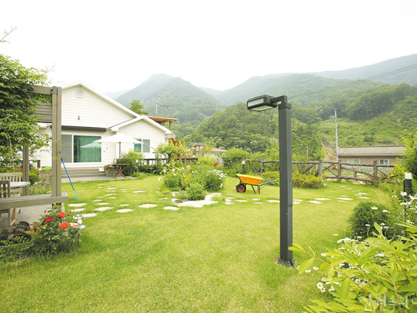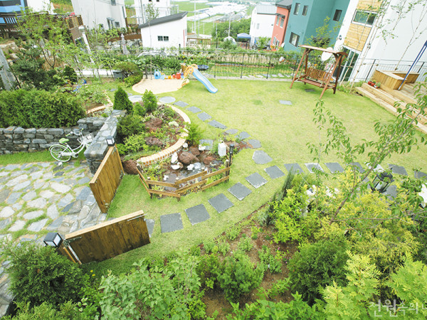 아이들을 위해 마당 있는 집으로 이사한 건축주 부부. 이들은 제대로 된 정원까지 만들면서 기대 이상의 효과를 얻었다. 아이는 더 이상 아토피 때문에 피부를 긁지도 않고 엘리베이터를 무서워하지도 않는다. 집 앞이 놀이터요, 주위에 널려 있는 것이 싱그러운 자연인 덕이다. 부모가 손잡고 놀이터에 가주지 않아도 알아서 놀 거리를 찾는 아이들. 도시에서는 부모가 아이에게 공부를 시켰지만, 이곳에서는 오히려 아이가 엄마 아빠에게 꽃 이름을 가르쳐주는 선생님이 되었다. 부모의 염려가 줄었고, 가족의 삶은 이전보다 풍요로워졌다. 취재 정사은 사진 변종석……………………… INFORMATION 위치 경기도 양평군 조경면적 52평 설계 이상근 시공 더숲연구소……………………… “아이의 눈높이에 맞춘 구조물과 식재를 기본으로 삼았습니다. 그러면서도 어른과 아이가 함께 즐기는 공간도 잊지 않았지요.” 정원을 디자인한 이상근 씨의 말대로 건물 전체의 모양과 공간이, 그리고 요소 사이사이의 짜임이 알차다. 야트막한 연못과 그네, 모래놀이터를 만들어 아이가 뛰노는 즐거움이 있고, 텃밭과 허브 정원, 화덕을 구성해 온 가족이 함께 가꿀 수 있는 정원으로 구성했다. 높이가 낮은 관목을 식재해 주변 시선을 적절히 차단했고, 다년초와 허브, 야생화를 심어 별다른 관리 없이도 매년 꽃이 풍성하다. 아이를 위해 정원을 만들었지만 더 행복해하는 건 부부다. “하나가 지면 또 다른 꽃대가 올라오는 정원을 보고 있노라면 감탄사가 절로 나와요.” 이른 아침, 잔디에 몽글몽글 맺혀 있는 이슬조차도 예쁘다는 김경미 씨의 말이다. 도시에서만 살아 식물 키우는 일에는 전혀 관심이 없던 부부는 이곳에서 아이들과 자연을 즐기는 방법을 배워가는 중이다. ▶ 집에서 바라본 마당 풍경 건물은 최소한으로 만들고 나머지 면적을 아이와 뛰어놀 수 있는 마당으로 만든 건축주의 생각이 돋보인다. 집에서 가장 먼 공간에는 울타리 역할을 하는 관목을 심어 시야를 적절히 차단하고 쌈채소를 기르는 텃밭과 수도를 만들었다. ▶ 연못과 허브가든 대문을 열고 들어오면 오른쪽에서는 허브가든이 향기로 사람을 반기고, 왼쪽에서는 연못이 시선을 잡아끈다. 두 아이를 위해 만든 연못으로 깊이 50㎝ 남짓이지만 미니 분수까지 갖춰 제대로 만들었다. 배수로를 확보해 비가 내려도 일정 수위를 넘지 않는다. ▶ 유럽식 화덕 점토 벽돌과 화강암 상판으로 화덕을 만들었다. 축대벽에 설치된 격자모양 라티스(Lattice)를 타고 4가지 색깔의 장미가 뒤덮을 때쯤이면 이국적인 분위기가 물씬 풍기는 공간이 될 것이다. 대문에서 보이지 않도록 시야가 닿는 곳에 풍성하게 심어 시선을 가린 디자인이 눈에 띈다. ▶오솔길과 자작나무 건물 뒤편으로 향하는 길은 고사리류의 음지식물을 심고 자작나무를 드문드문 심었다. 자작나무가 풍성하게 자랄 즈음에는 집 뒤의 자작나무 숲과 어우러진 전원주택의 풍모를 감상할 수 있을 것이다. ▶ 암석원과 모래놀이터 현무암으로 배치하고 화산석 송이로 표면을 덮어 완성한 암석원은 건축주가 가장 좋아하는 공간이다. 야생화가 피고 지기를 반복해 날마다 새로운 풍경을 연출하는데, 별다른 관리 없이도 잘 자라는 식재들로만 구성한 점이 눈에 띈다. 암석원과 수도 주변에는 앵두나무와 보리수, 살구나무를 심어 과실을 즐길 수 있도록 했고, 아이들을 위한 모래 놀이터도 만들었다. 모래 놀이터는 바닥에 약간의 물매를 준 후 배수판을 깔고, 그 위에 부직포를 덮고 모래를 채워넣어 물은 빠지되 모래는 빠지지 않는다. 취재협조: 더숲연구소 ‘더불어 숲’이라는 뜻의 더숲연구소는 세상을 조금씩 푸르게 만들겠다는 시대적 소명을 가지고 의뢰인과 소통하며 작업하는 디자인·시공업체다. 관공서에서 발주한 대규모 조경 프로젝트부터 주택의 작은 정원까지, 푸르른 것이라면 무엇이든 애정을 가지고 손보는 열정이 있다. 꼼꼼한 시공과 짧은 공사기간이 특징이다. 02-402-1030 http://blog.naver.com/tree4910※월간 <전원속의 내집> www.uujj.co.kr 본 콘텐츠의 저작권은 (주)주택문화사에 있으며, 이를 무단 이용하는 경우 저작권법 등에 따라 법적책임을 질 수 있습니다.