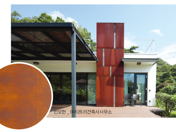 비교적 변형이 자유롭고 강도가 높은 금속은 주택 건축 마감재로 두루 쓰인다. 선택을 앞둔 건축주들을 위해, 주택 외부와 내부에 적용되는 금속 마감재를 종류별로 나눠 특징, 가격대 등을 정리했다.EXTERIOR강도가 높지만 성형이 용이하고, 모던한 주택 외관을 구현해주는 금속자재. 내식성과 강도 등을 높인 자재 개발로 건축용 금속 외장재는 나날이 발전을 거듭하고 있다.※가격대는 부자재비, 시공비를 포함하여 산정하고 그 외 경우 별도 표기했다. 제품, 시공 난이도, 물량, 현장 상황에 따라 가격은 변동 가능하다.1 > 고내식 합금도금 강판적용부위 지붕, 외벽 | 가격대 1㎡당 8만~13만원아연, 마그네슘, 알루미늄 합금하여 도금한 강판으로, 흔히 ‘컬러강판’이라 불리는 도금 강판보다 훨씬 강한 내식성을 지닌다. 마그네슘으로 도금층 경도를 높임으로써 도금층 박리 현상을 방지하여 스크래치, 마찰에도 강하다. 원하는 색상을 얼마든지 지정할 수 있는 것도 장점. 단, 자재 생산 시 패널 폭이 한정적이고 판금 작업 시 도장층의 갈라짐, 절단면 부식 등이 발생할 수 있으므로 주의해야 한다. 시공 시 피스로 강판을 고정할 경우 피막층 손상 우려가 있어 클립 시공을 하는 전문 업체에 맡길 것을 권한다. 포스코 녹스탑 _ ㈜씨티코리아2 > 오리지널 징크(티타늄 아연판)적용부위 지붕, 외벽 | 가격대 1㎡당 14만~20만원100% 재활용 가능한 친환경 건축 마감재. 아연판 특유의 자연 보호 피막이 형성되어 표면이 손상되면 자연적으로 복원된다. 자재 수명이 반영구적이며, 자연색으로 보는 각도나 음영, 빛에 의해 다른 색을 보여준다. 삼차원 곡면 등 다양한 디자인이 가능하다. 습기에 약하므로 시공 시 이격 환기재 사용이 필수이며, 가공된 오리지널 징크판은 눈비에 맞지 않도록 외부와 차단되는 창고에 보관한다. 시공 적정 온도는 5℃ 이상으로 영하의 날씨에는 시공을 중지하고, 산성 화합물, 염분, 부식 방지제 등의 접촉도 되도록 피한다. 이엘징크 _ ㈜로자3 > 알루미늄적용부위 지붕, 외벽 | 가격대 YKKAP 알카베 - 1㎡당 11만원 / 리코날 프리미엄 플러스 - 1㎡당 목조 9만8천원, RC조 15만원 (200㎡ 이상 시공 기준, 후레싱·홈통 별도)습기 침투가 불가능하고 부식과 수축팽창이 거의 없어 해안지역, 추운 지방에도 사용하기 적절하다. 가벼운 무게로 구조물에 무리를 주지 않으며, 절단, 접합, 굽힘, 라운딩 등 가공성이 자유로워 정밀 제작이 요구될 때도 문제없다. 외부 충격에 약하므로 시공 시(특히 비계 철거 시) 긁힘에 각별히 주의해야 하고, 연질소재로 우는 현상이 생기지 않도록 평활도에 유의한다. YKKAP 알카베 _ ㈜지이그룹4 > 갈바륨적용부위 지붕, 외벽, 펜스 등 | 가격대 알틱 - 1㎡당 목조 8만원, RC조 13만원(200㎡ 이상 시공 기준, 후레싱·홈통 별도)강판에 아연과 알루미늄을 결합하여 도금한 것으로, 흔히 ‘갈바’라 줄여 부르기도 한다. 상·하도 도장의 건조시간을 달리하여 개성 있는 질감을 표현할 수 있으며, 도장성이 좋아 다양한 색상 연출이 가능하다. 또한, 가공 받는 부분에 발생하는 미세 균열이 극히 적어 가공 부위의 내구성이 우수하다. 다만, 다른 강판과 마찬가지로 판금 가공 시 도장층의 갈라짐이나 깨짐 현상이 발생하지 않도록 주의해야 한다. Artic(알틱) _ ㈜로자5 > 내후성강판(코르텐강)적용부위 외벽, 펜스, 화분, 커튼월, 간판, 외부조형물 등 | 가격대 1㎡당 10만~15만원철강재에 인(P), 동(Cu), 크롬(Cr) 등을 첨가해 내후성을 높인 자재. 점차 녹슬다가 일정 기간 후 표면에 안정된 산화 피막층을 형성하여 더 이상의 부식 진행을 억제하는데, 5~10년 지나면 암적색을 띤다. 이러한 성질을 이해하지 못하고 시공할 경우 녹물로 인한 오염이 발생해 오히려 지저분해 보일 수 있다. 염분이 직접 닿는 해안가나 장기간 습윤 상태가 지속되는 곳에서는 녹이 생기지 않으므로 세심한 설계 계획과 시공이 요구된다. 민오헌 _ ㈜티트리건축사사무소6 > 스테인리스 패널적용부위 외벽, 펜스, 화분, 커튼월, 간판 등 | 가격대 DSP 스테인리스 스틸 허니컴 패널 - 1㎡당 18만~22만원스테인리스 패널은 마감 상태에 따라 외기 오염에 강한 게 특징. 내구성과 내충격성이 매우 우수해 유지관리가 편하다는 장점이 있다. 코팅 종류에 따라 광의 정도나 색상을 달리할 수 있어 다채로운 표면 연출이 가능하지만, 미러 마감의 경우 태양광 반사에 의한 눈부심에 유의해야 한다. 평활도면에서 취약한 단점도 있으나 패널 내부에 조립식 허니컴을 부착해 평활도와 시공성을 모두 높인 제품도 선보이고 있다. 스테인리스 스틸 허니컴 패널 _ ㈜디에스피INTERIOR여러 자재의 과감한 믹스매치를 쉽게 만날 수 있는 요즘, 금속도 예외는 없다. 주거 인테리어에서도 내·외장의 경계를 넘나들며 더욱 폭넓게 활용되는 추세다.※ 인테리어의 경우 거울, 중문, 파티션, 가구 등 제작하는 품목과 디자인, 사이즈, 시공 난이도 등에 따라 추가되는 인건비와 부자재 비용이 천차만별이다. 따라서 가격대는 명확히 밝힐 수 있는 경우에 한하여 기재했다.1 > 구로철판적용부위 내벽, 파티션, 문, 벽난로, 계단 난간, 가구, 건물 외벽 등쇳물을 가공해