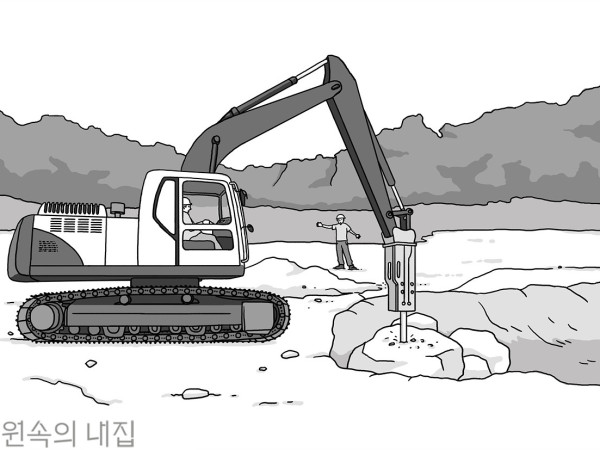 짧은 기간 내 처리가 어려우면 덮는 것이 나을 수도 있다주택을 짓기 위해 기초를 파다가 나온 바위나 암반은 종종 현장에 난감한 상황을 불러오기도 합니다. 일단은 공사가 다소 지연되거나 어려워지게 되지요.바위가 발견된다면 크기 가늠이 우선입니다. 당일에 어떻게든 뽑아 꺼낼 수 있으면 별다른 문제없이 공정이 진행될 것이고, 암석이 크거나 재질이 단단해 당장 깨서 없애는 것이 어렵다고 판단되면 일단 중지합니다. 이때 건축사, 시공사, 건축주가 모여 비용을 감수하고 장비를 투입해 계속 깨서 없앨지, 아니면 그 위에 바로 기초를 할지 협의합니다. 건축주 선택에 달린 일이지만, 보통 작업 기간 사흘 정도를 기준으로 결정하는 편입니다.깨서 뺀다는 결정을 하면 대부분의 현장에서는 6W 굴착기와 덤프트럭이 활용됩니다. 굴착기에 착암기를 장착하고 파쇄한 후 트럭으로 실어 나르는 과정을 반복합니다. 비용은 지역이나 상황마다 다르지만, 굴착기는 하루 60만원, 덤프트럭은 50만원 정도로, 기타 인건비를 빼고도 하루에 100만원 이상 드는 셈입니다. 현장에 따라서 코어드릴이나 유압장비까지 동원한다면 비용은 더 오를 수 있습니다.깨지 않는다면, 그 위에 기초를 바로 하게 됩니다. 기초는 지면으로부터 약 30~60cm 올리게 되는데, 이 높이 이내로 바위가 돌출된다면 그대로 덮는 것이지요. 바위나 암반 바로 위에 기초하면 탄탄한 지반 위에 기초가 올라가는 만큼 침하 등의 문제로부터 상대적으로 안전하다고 볼 수도 있습니다. 반면 바닥의 냉기 유입 등 단 열 측면에서는 손해를 볼 수 있습니다.한편, 설계에 들어가기 전에 바위나 암반의 존재 여부를 알고 있다면 부지 여유가 있을 때 처음부터 집이 앉혀질 자리를 바꾸는 것도 방법입니다. 이처럼 바위는 다양한 상황과 여건에 따라 대처 방법이 달라질 수 있으니 건축 전문가와 충분한 상담 후 결정하길 권합니다.취재협조_ 휴먼홈 https://cafe.naver.com/no1tongil취재_ 신기영 | 일러스트_ 라윤희ⓒ 월간 전원속의 내집 / www.uujj.co.kr
