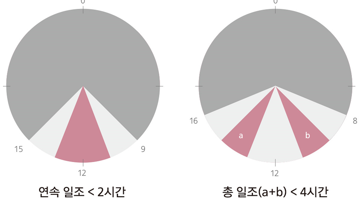 오전 9시 ~ 오후 3시까지 6시간 중 연속 일조 2시간 이하