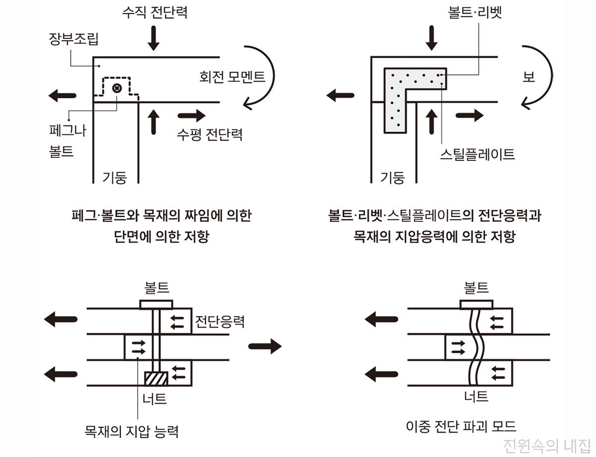 [그림 4]는 경골목구조의 간단한 못박기 원리이지만 역학의 기본인 인장력, 압축력, 전단력, 휨모멘트가 모두 반영되어 있다. 못 박는 원리 또한 하중(작용)에 대한 못의 전단응력과 목재의 지압응력(반작용)으로 저항한다.
