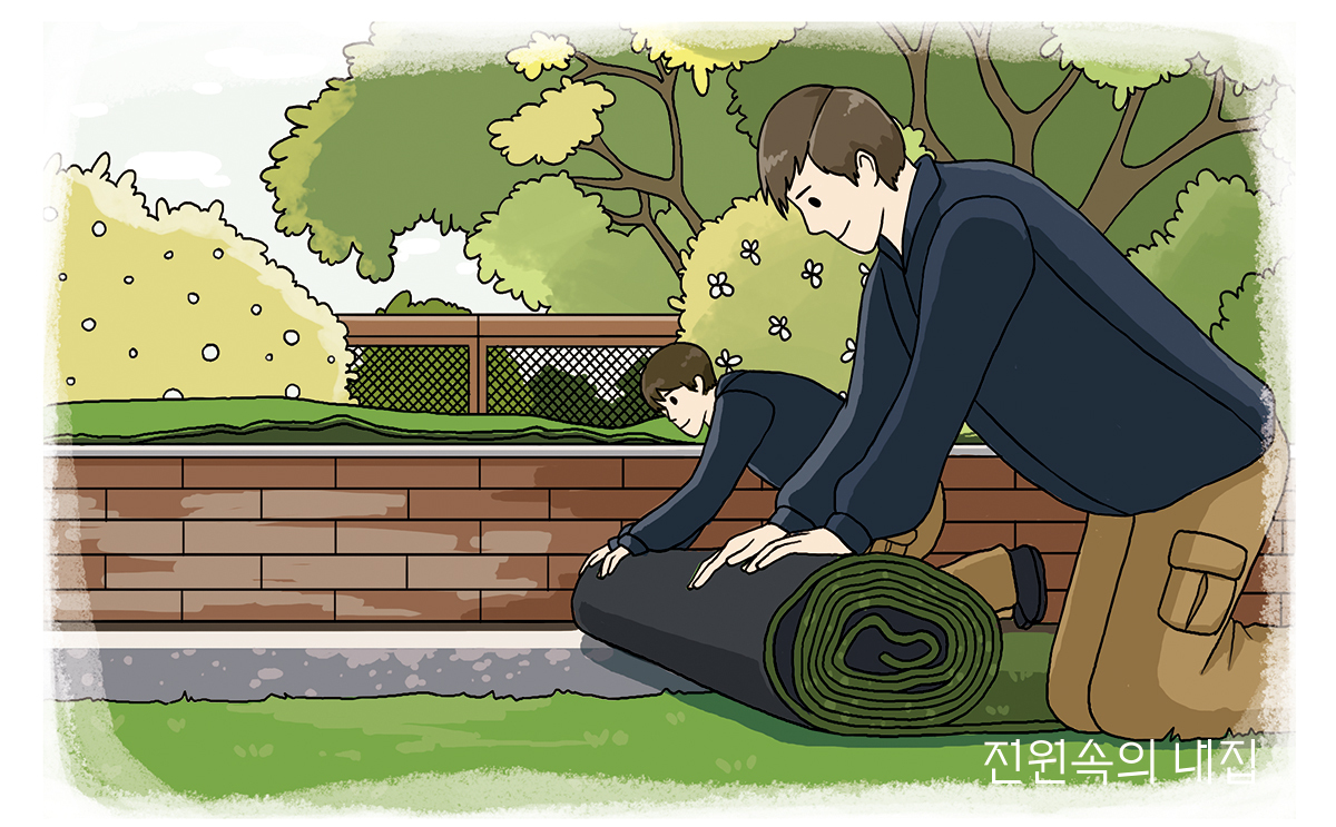 ▪ 살아있는 잔디를 티 없게 유지하기 위해서는 비료나 관수, 그리고 틈틈이 약제나 식재 등이 이뤄져야 합니다. 기후나 잔디 종류에 따라 어느 정도 다르겠지만, 모두가 결국 비용입니다. 인공 잔디에는 필요 없는 일이지요.