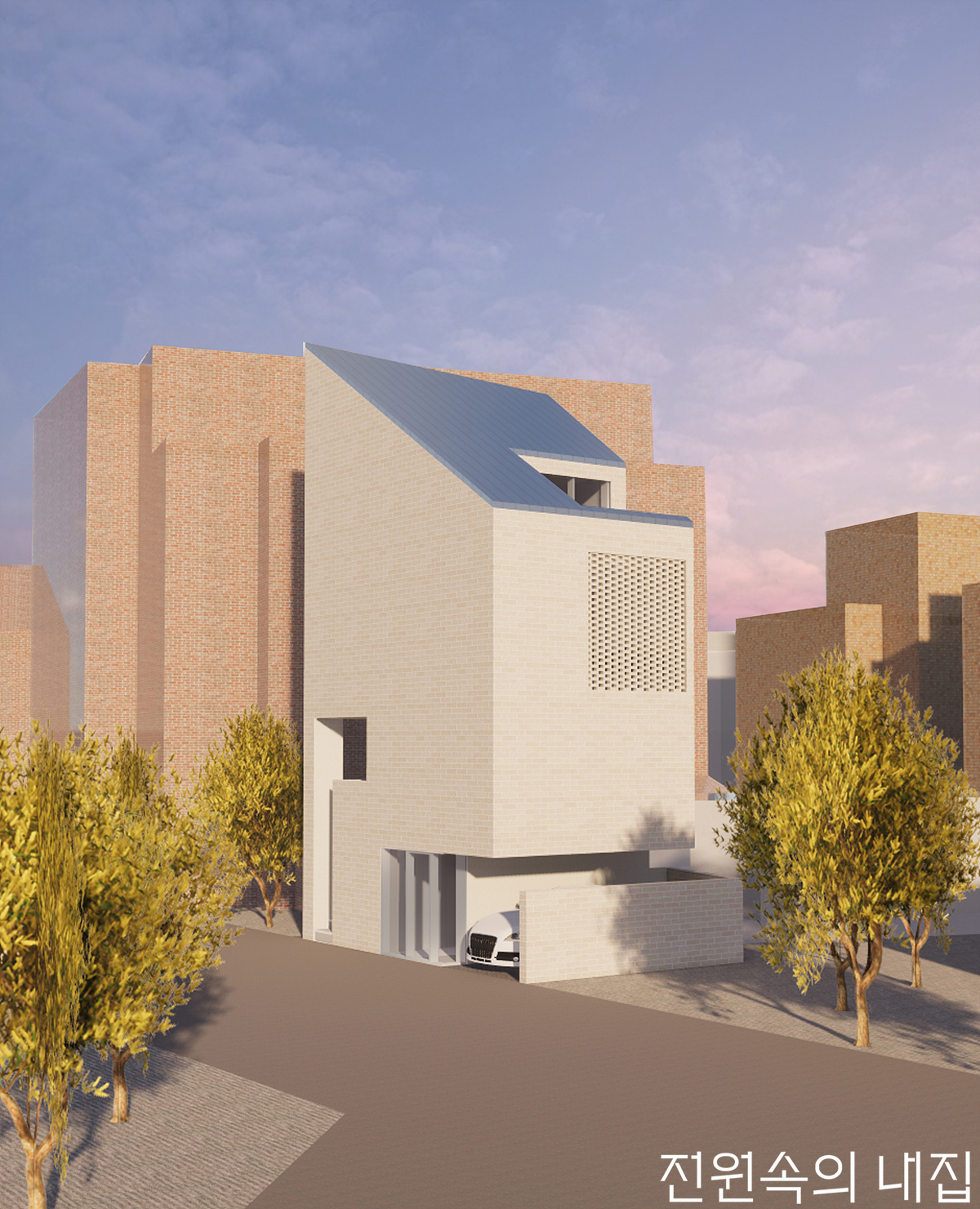 주변과 어우러지기 위해, 건물의 매스는 군더더기 없이 단순해야 했다. 매스는 요철이나 분절이 없고 재료 또한 하나의 톤을 갖는다. 지붕이 꺾이는 형태를 피하고자, 사선을 적용받지 않는 전면에 계단실을, 사선이 적용받는 부분에는 중정을 배치했다. 사선을 비껴가는 경사 지붕 아래로는 다락을 뒀다.